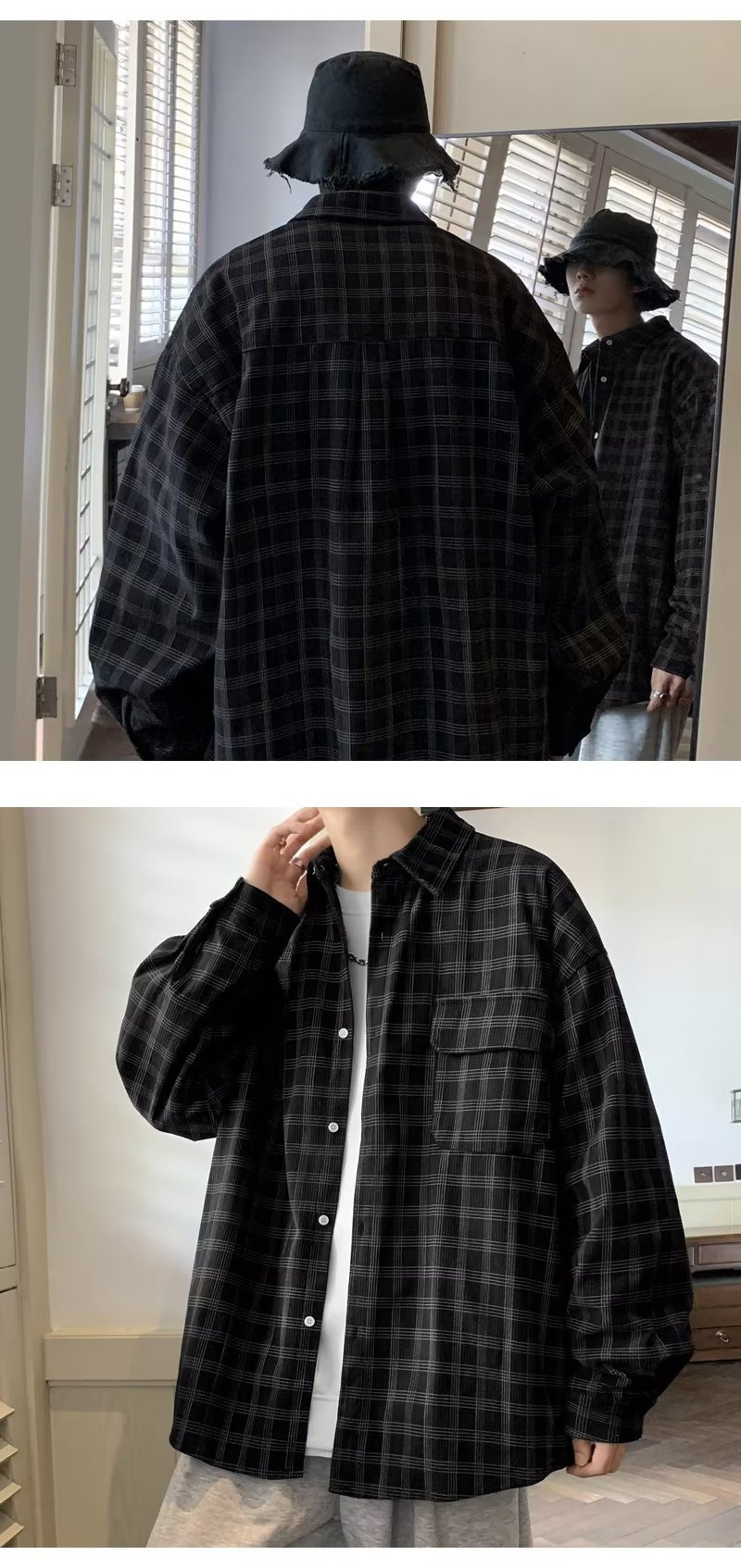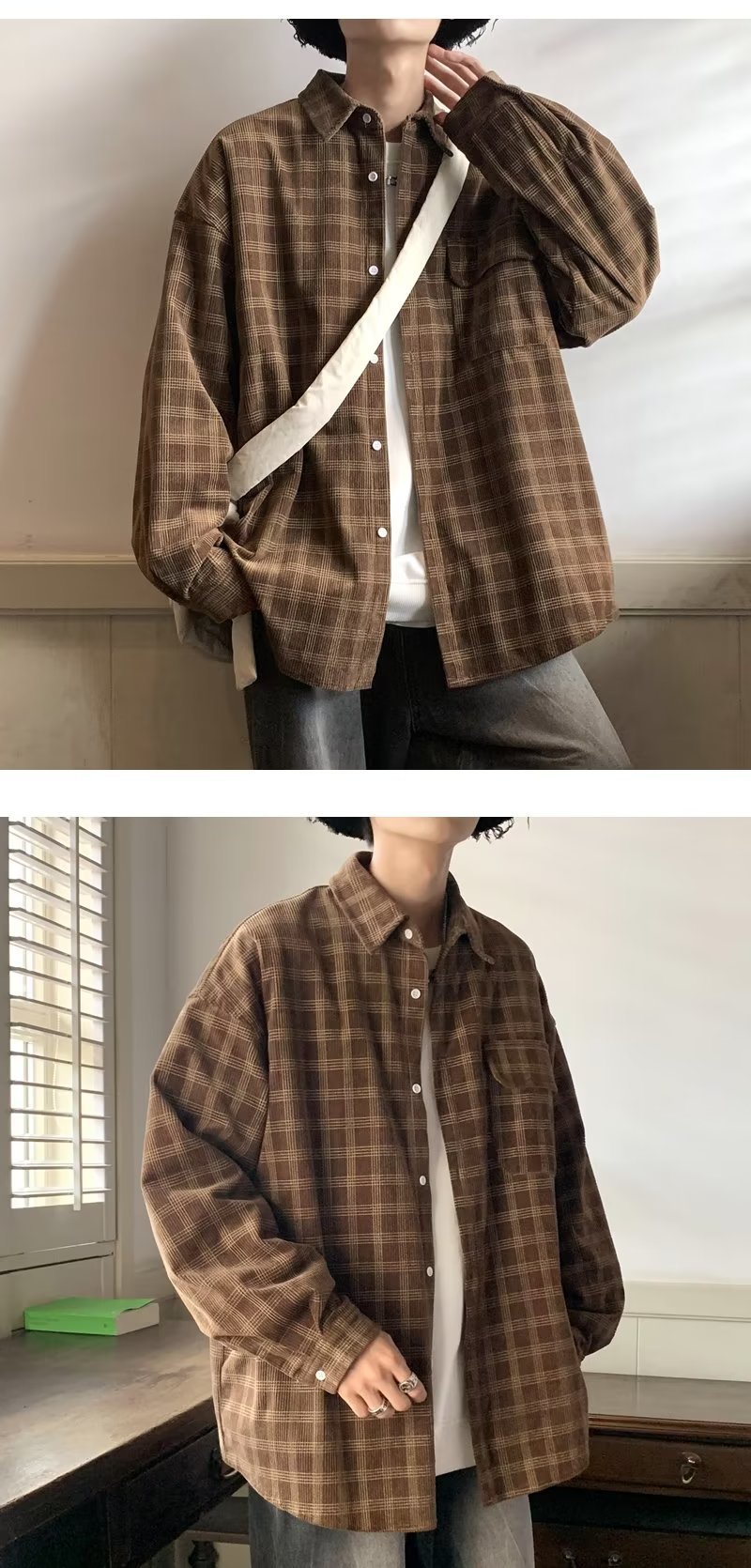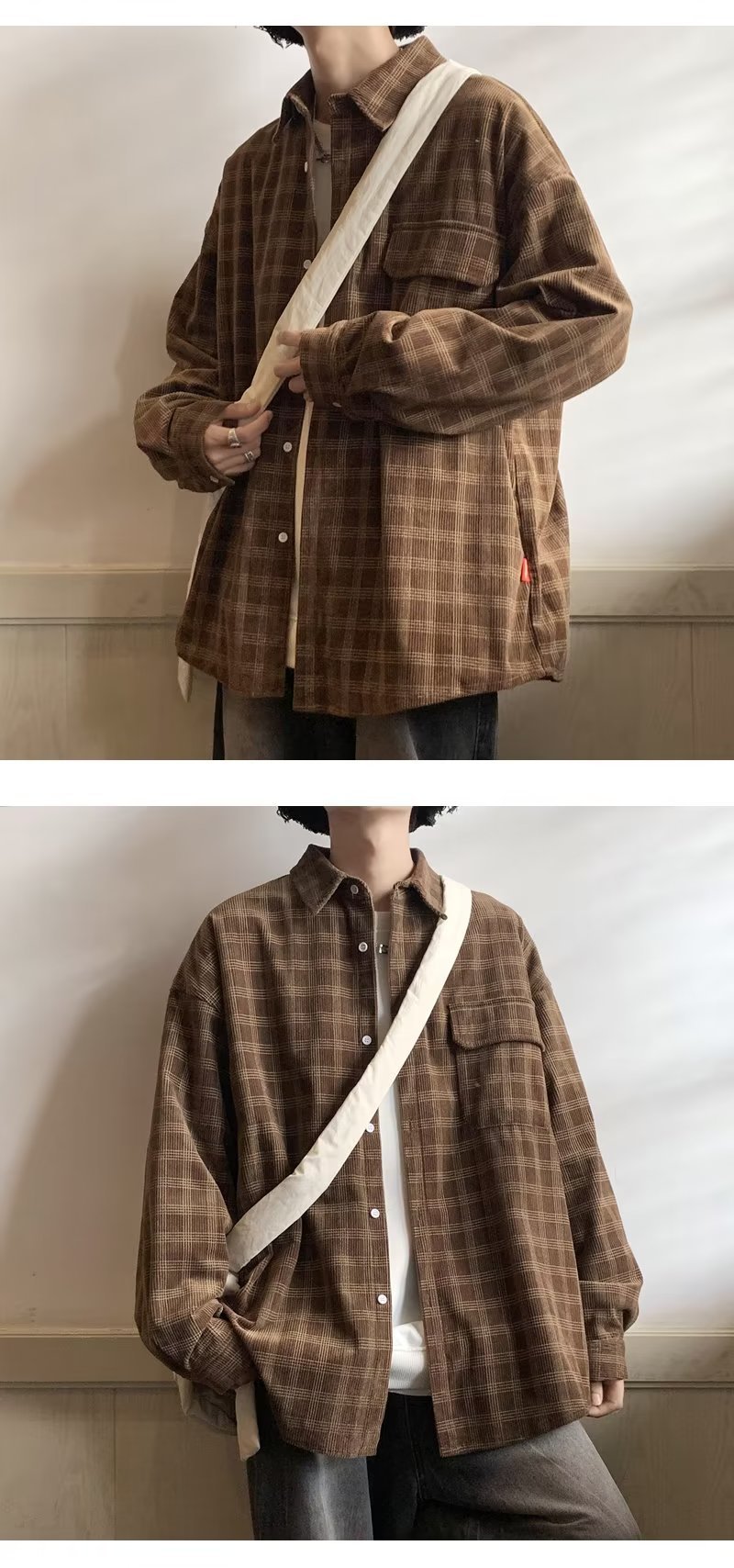 격자 무늬 긴팔 셔츠 남자의 봄과 가을 일본 캐주얼 셔츠 고급 감각 Ruffian 잘 생긴 유행 남자의 코듀로이 재킷스토어 가기