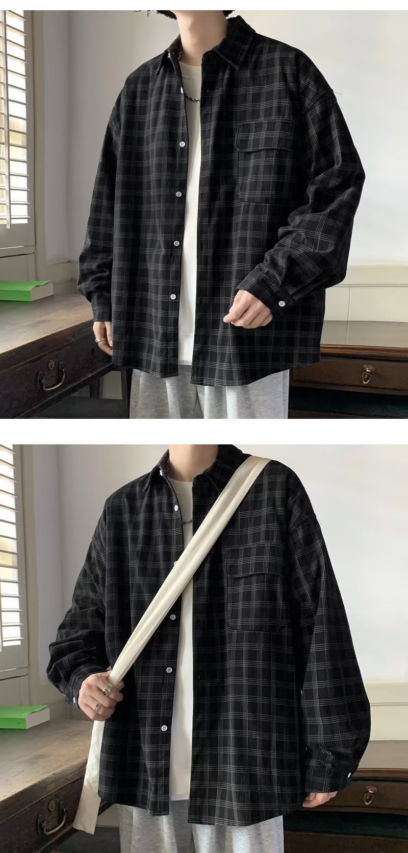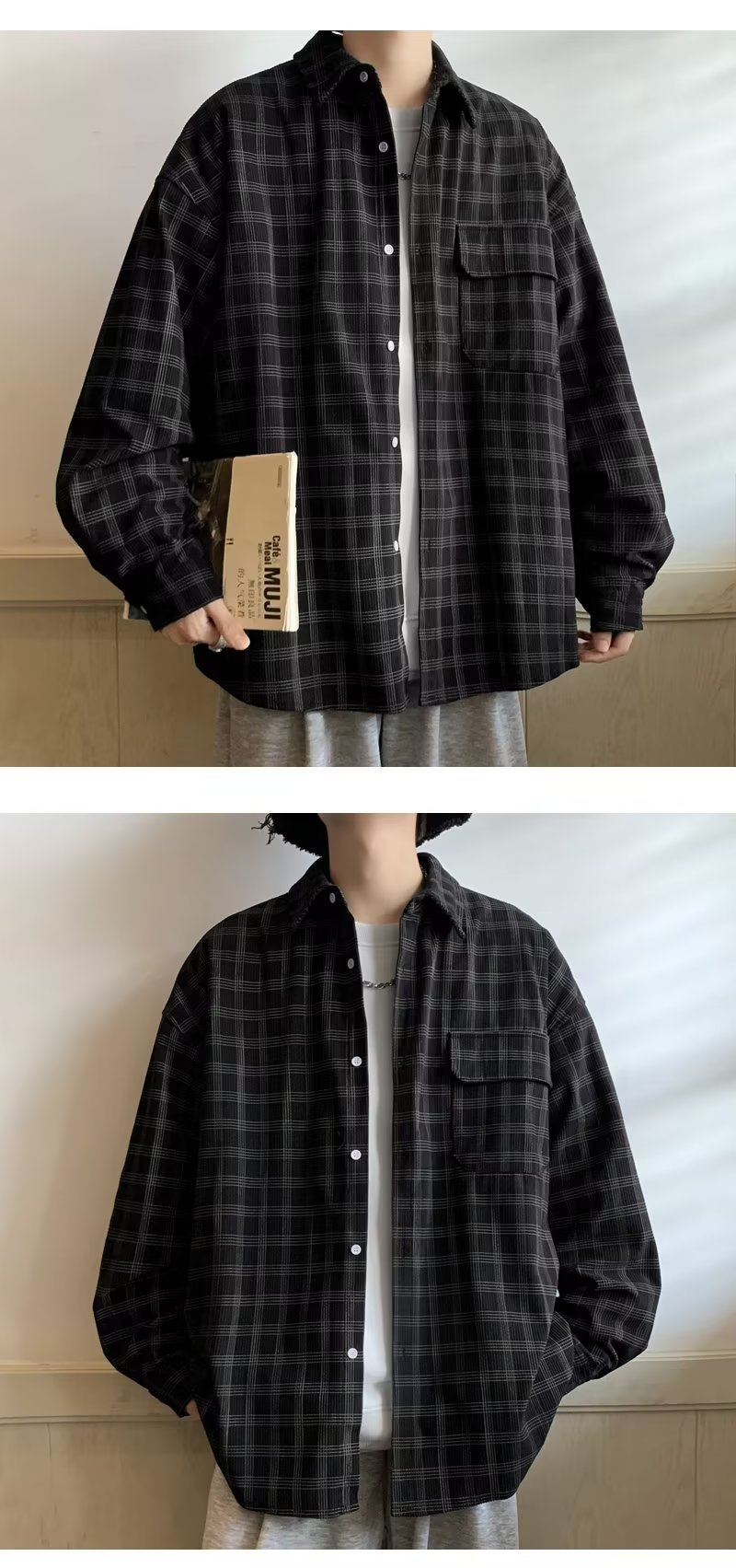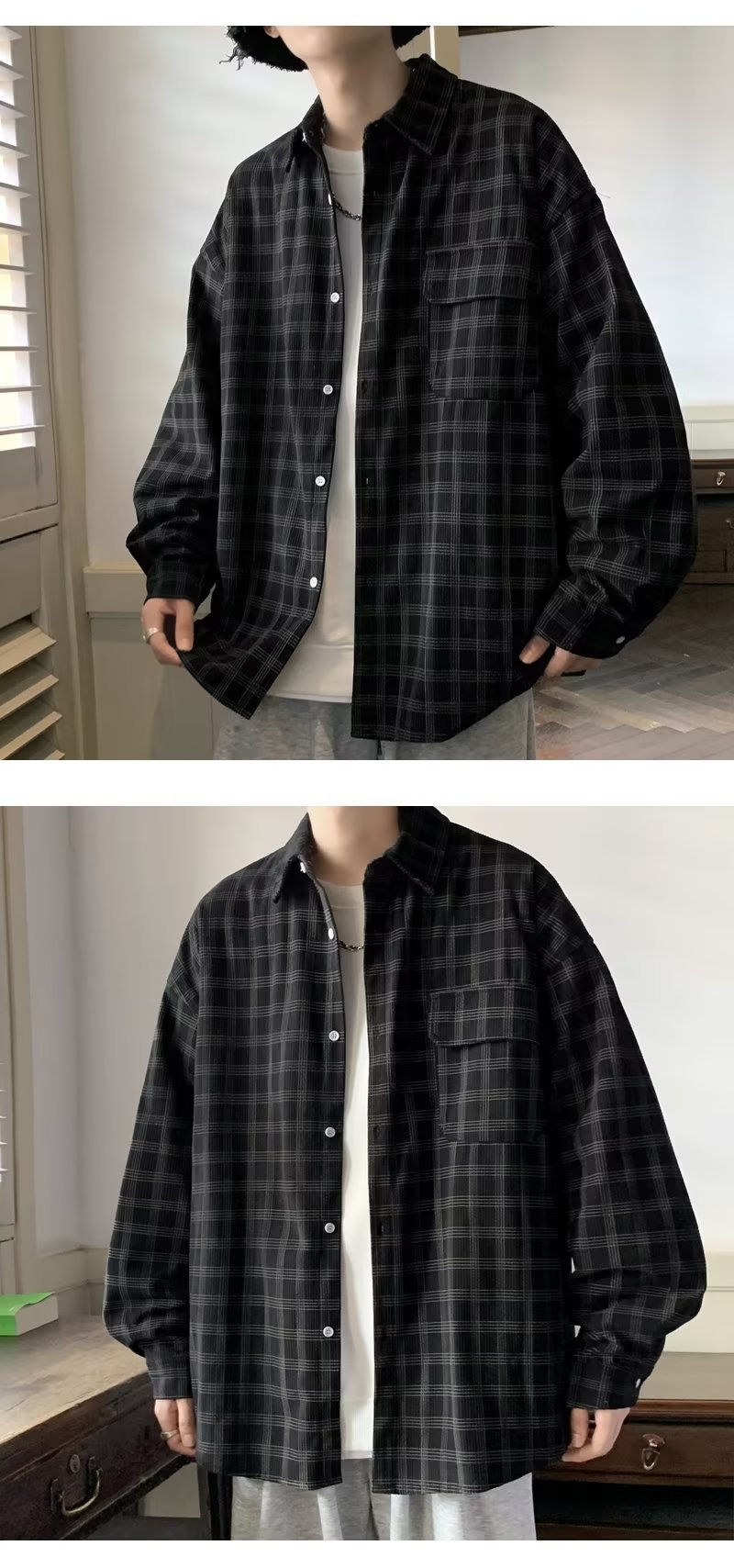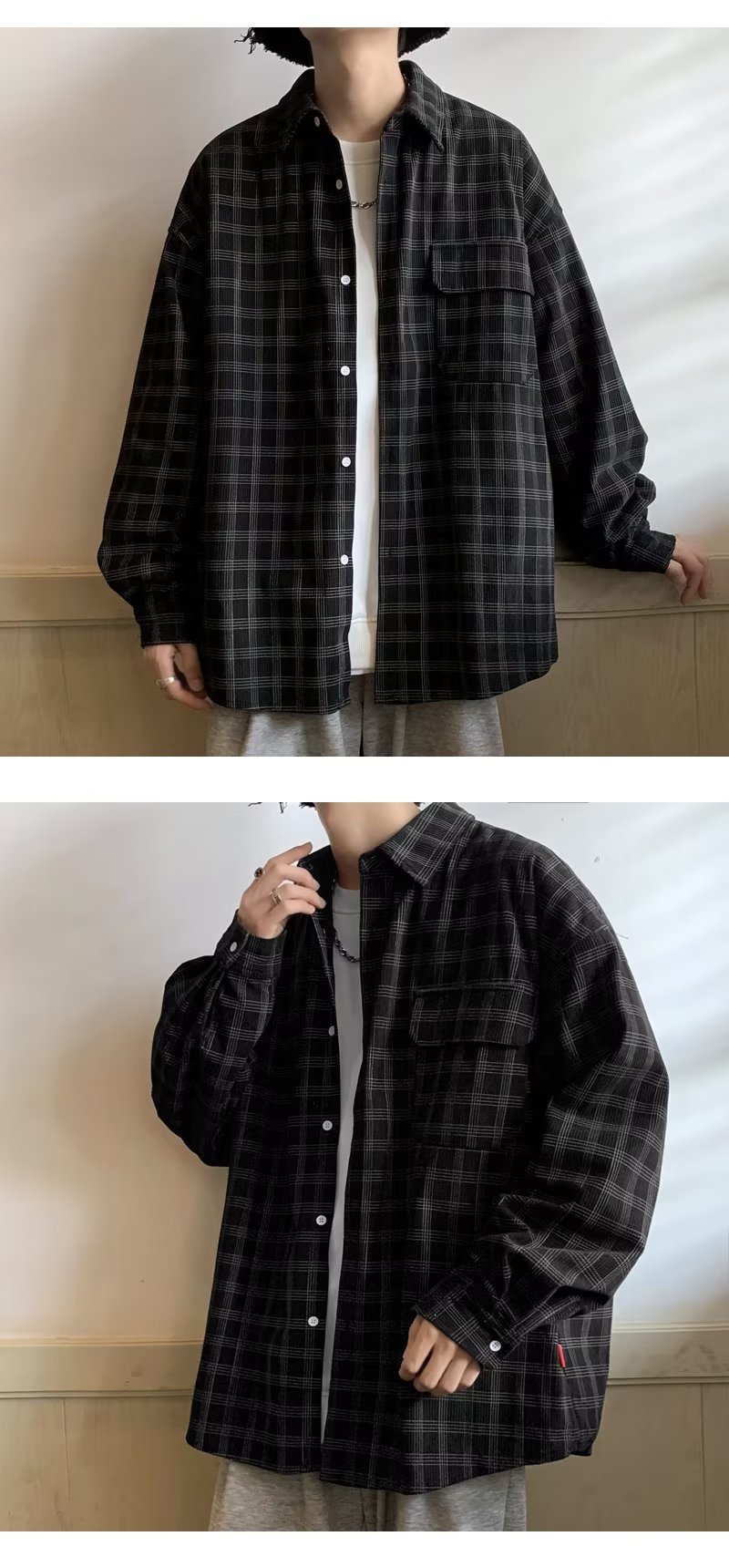 격자 무늬 긴팔 셔츠 남자의 봄과 가을 일본 캐주얼 셔츠 고급 감각 Ruffian 잘 생긴 유행 남자의 코듀로이 재킷스토어 가기