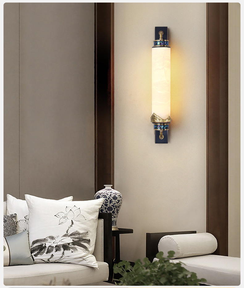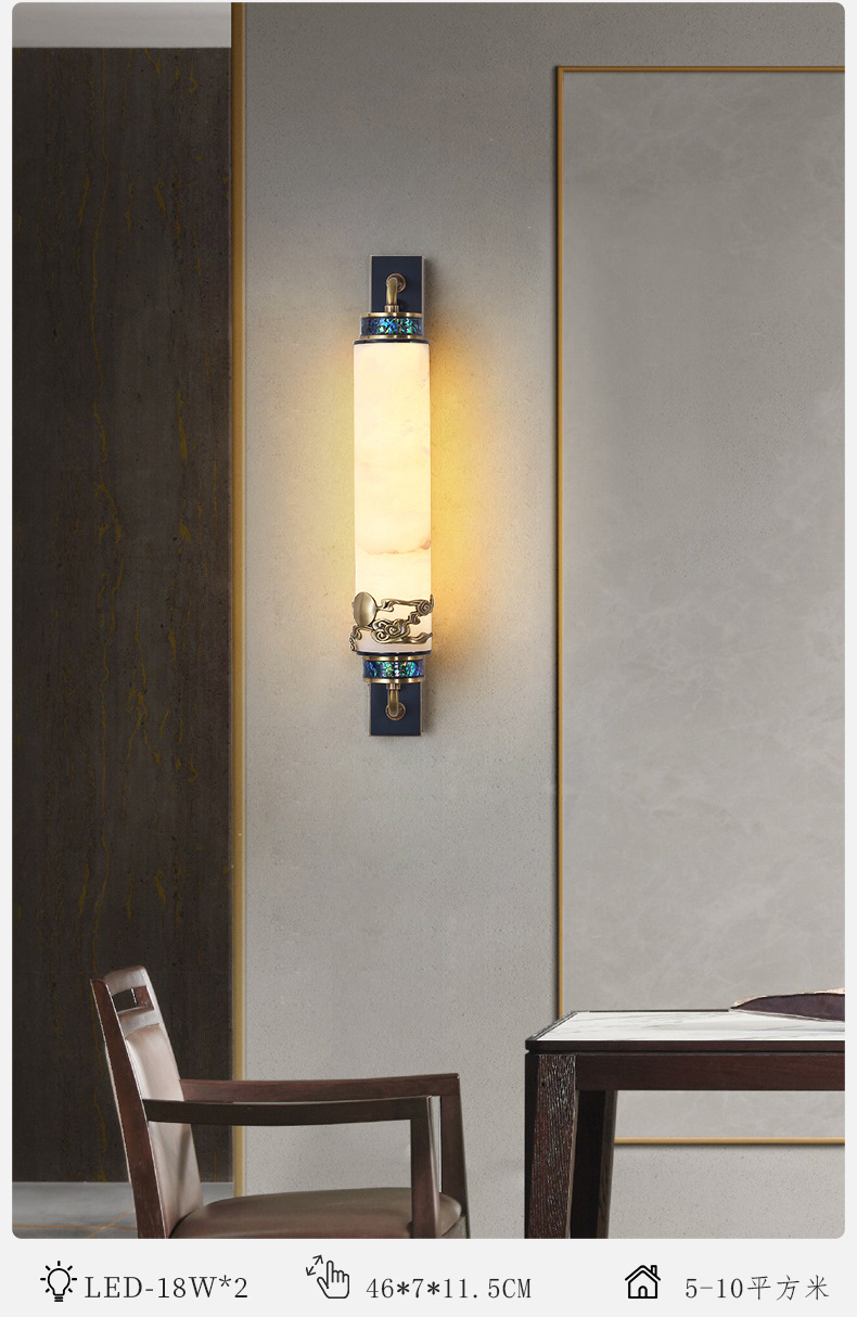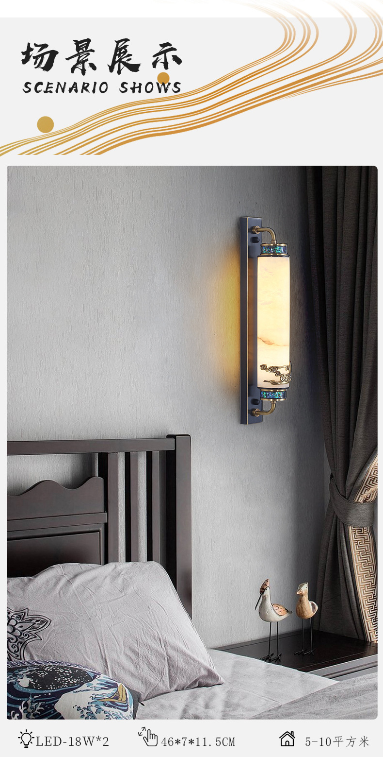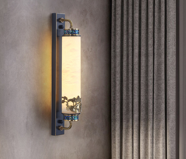 새로운 중국식 마스터 침실 벽 램프 고급 감각 모든 구리 고급 빌라 거실 TV 배경 벽 램프 돌 침대 옆 벽 램프