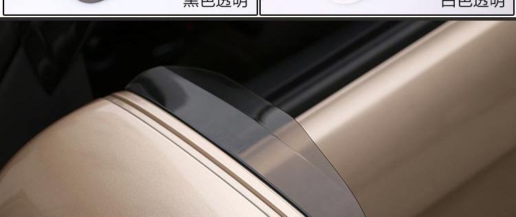 TypeR的雨眉具有非常好的柔性,可以任意弯曲以适合各款车型后视镜的款式,半透明黑色材质,雅致可与任何颜色车镜搭配,帮助挡住雨丝,行车更加。