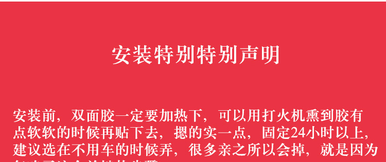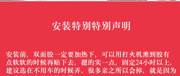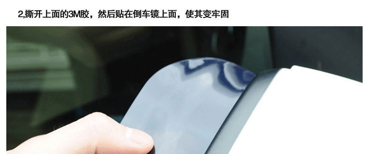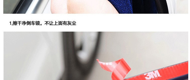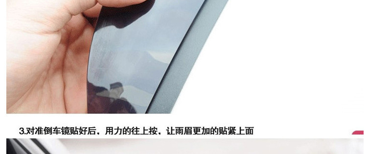 产品分左右两片。彻底清洁后视镜内线位置,撕去本体上的3M胶护纸,将遮雨挡弯曲至后视镜的曲度粘贴即可,粘后请紧按一段时间以确保牢固,24小时内不要洗车。