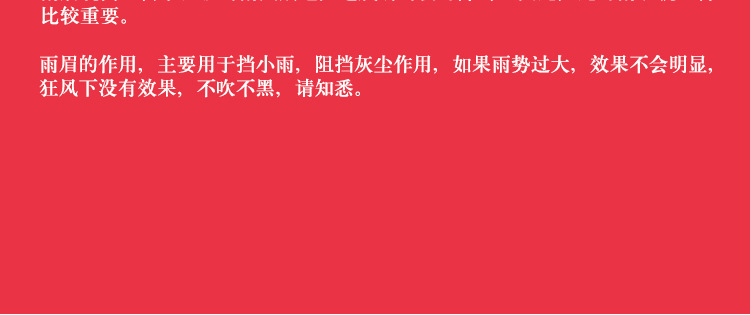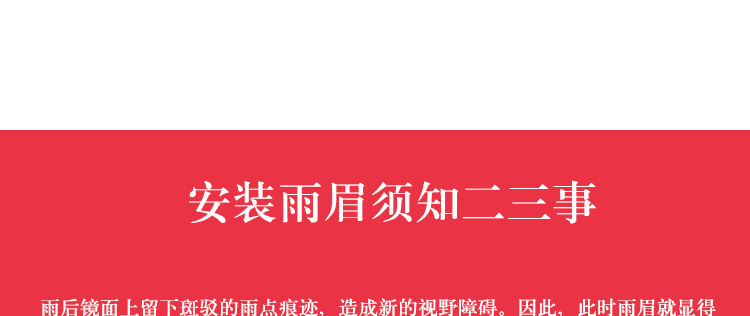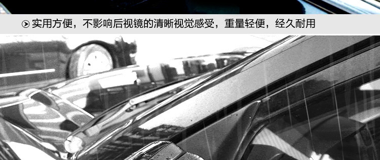 在雨天,雨水模糊了后视镜面,使行车时无法观察两侧后方的道路情况,真的十分危险。为后视镜安装一对雨眉即完全解决问题了!