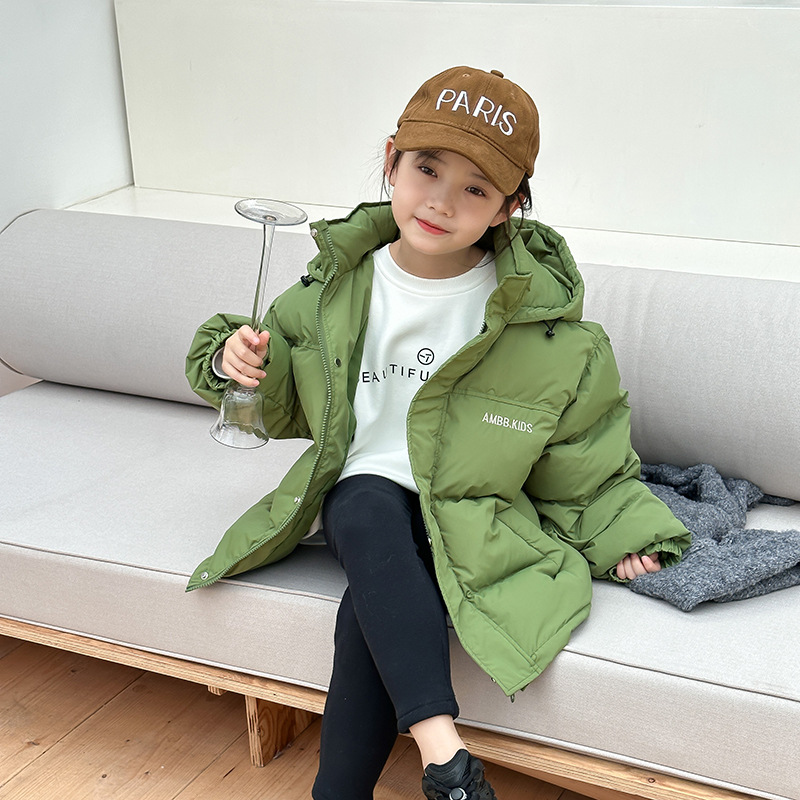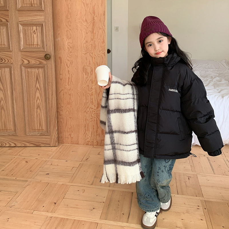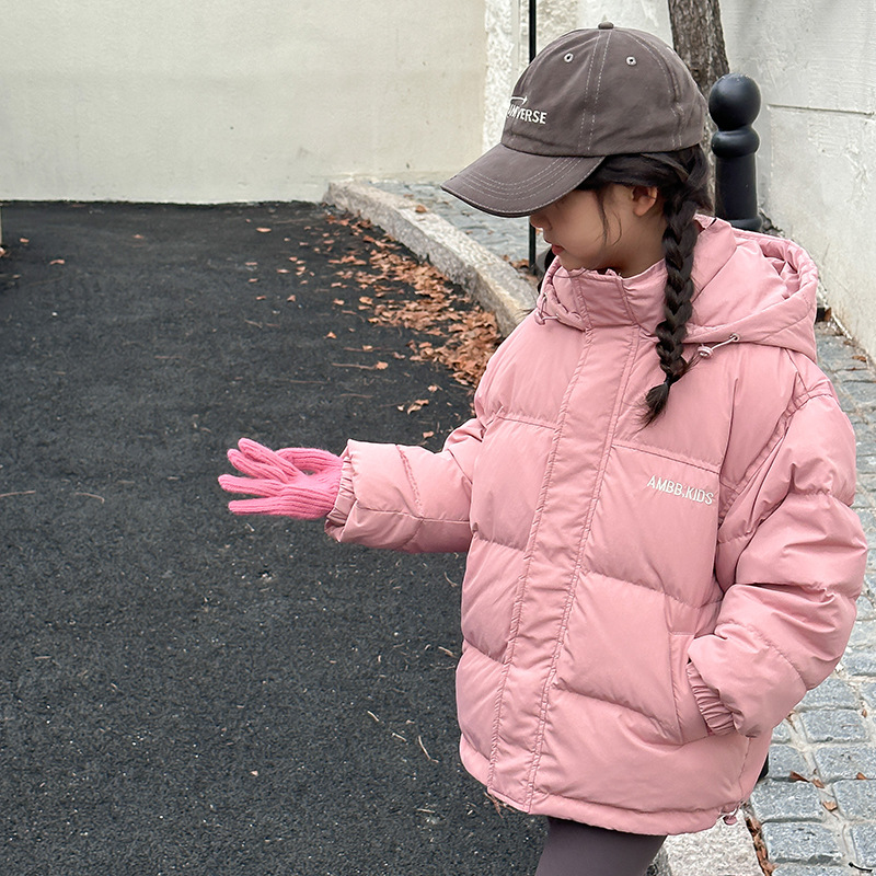 [New GB] Emo Beibei 한국어 버전의 느슨한 90 화이트 오리 다운 레터 후드 다운 재킷 소년 소녀 용