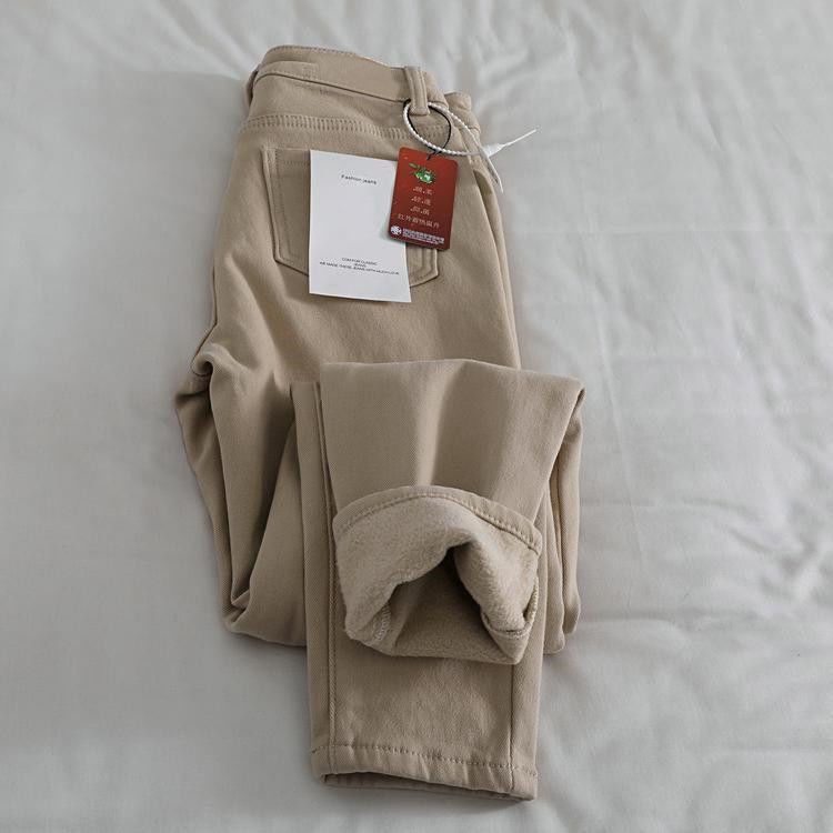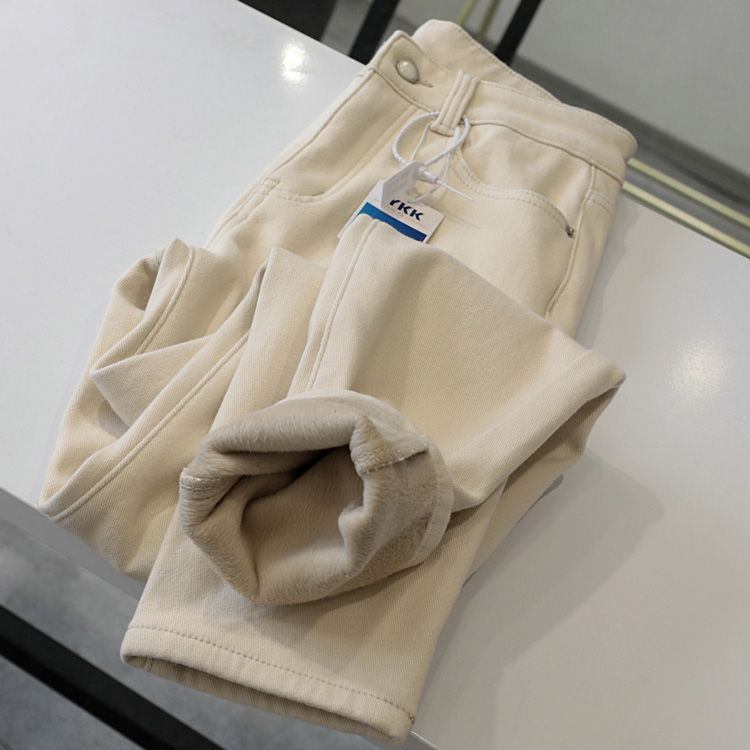 2024 가을 겨울 여성용 벨벳 스트레치 베이지 청바지, 단색, 심플하고 다용도, 아빠 바지, 슬림핏 하렘 팬츠