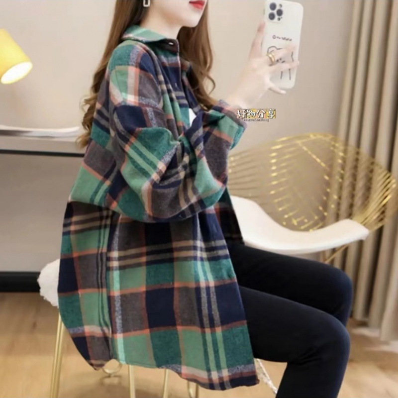 2023 봄과 가을 샌딩 두꺼운 느슨한 한국 스타일 격자 무늬 셔츠 모든 매치 캐주얼 가을 중간 길이 랜턴 슬리브 재킷스토어 가기