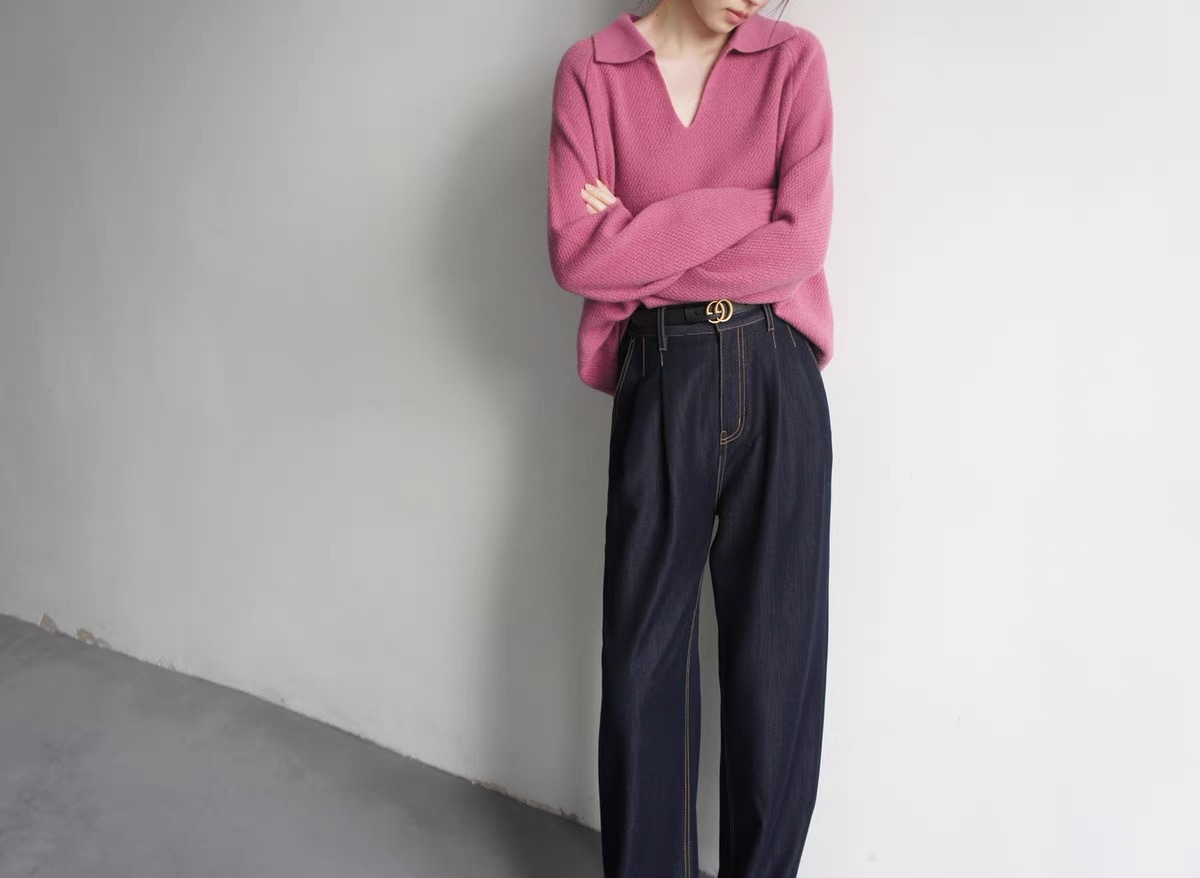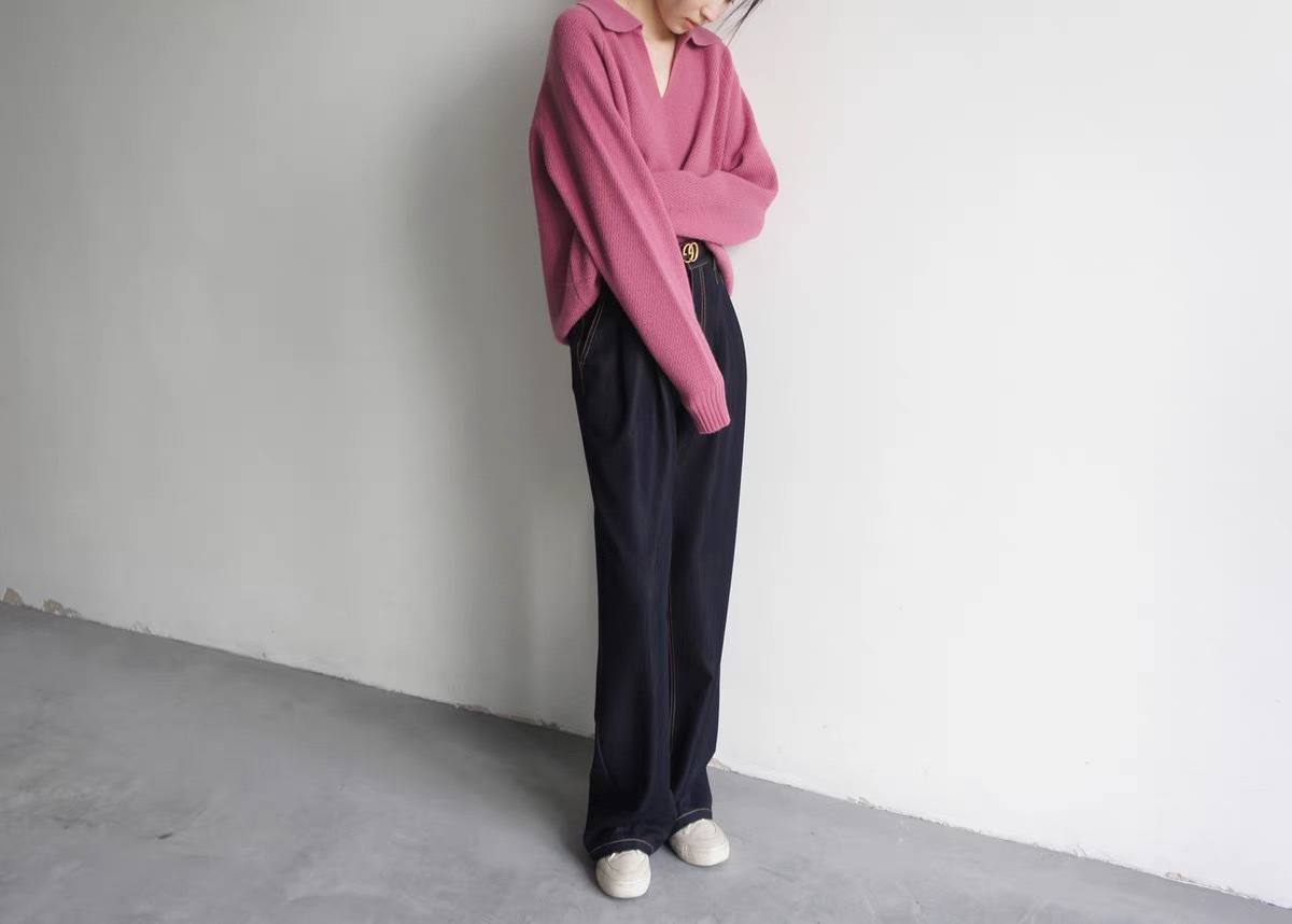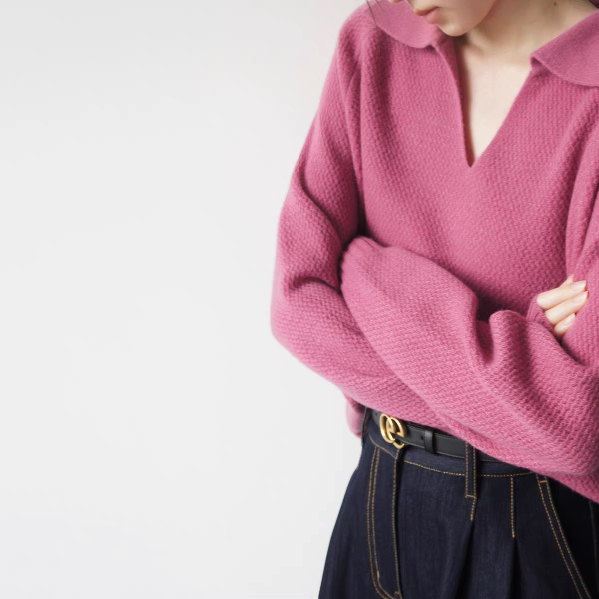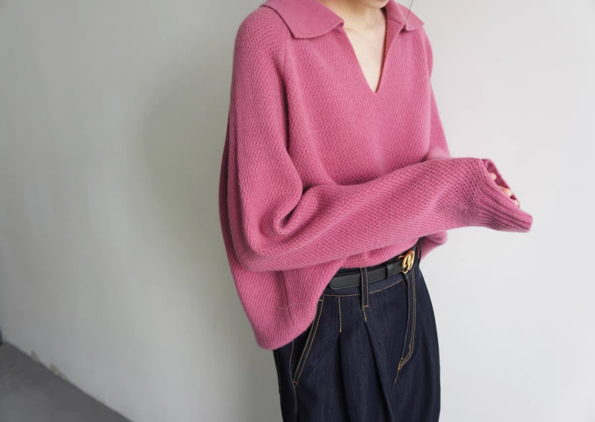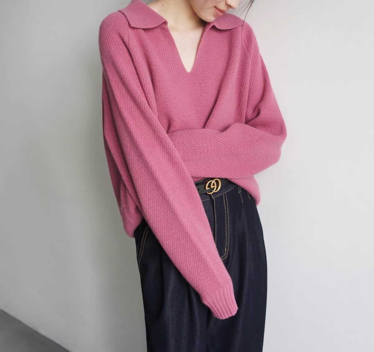 레트로 드라이 로즈 V넥 루즈핏 긴팔 스웨터 100% 메리노 울 함유 부드러운 와플 패턴