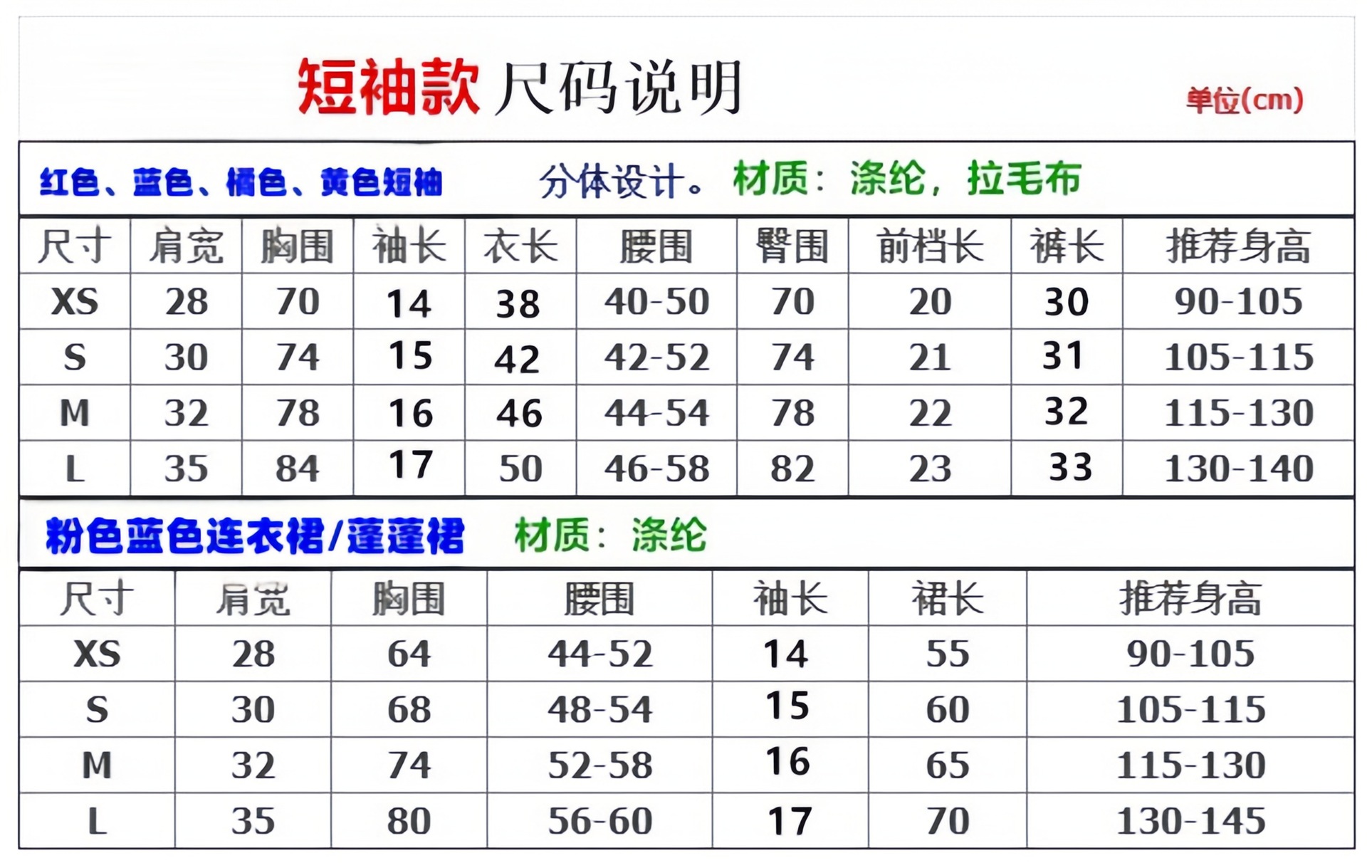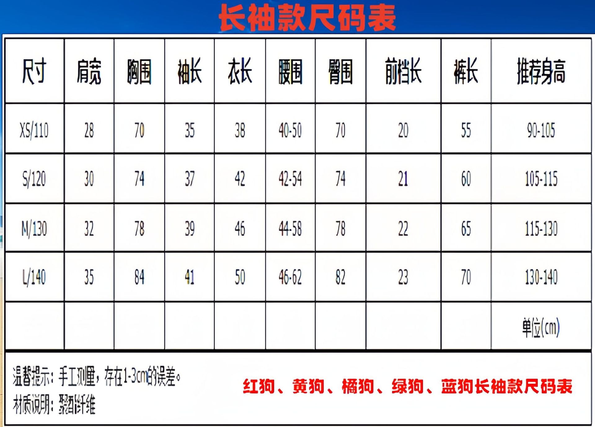XS/110码:衣长约37CM,胸围约58-68CM,腰围约42-58cm,裤长约53cm,适合身高约95-105cm,克重:约210G/件 (短款:约180G/件)