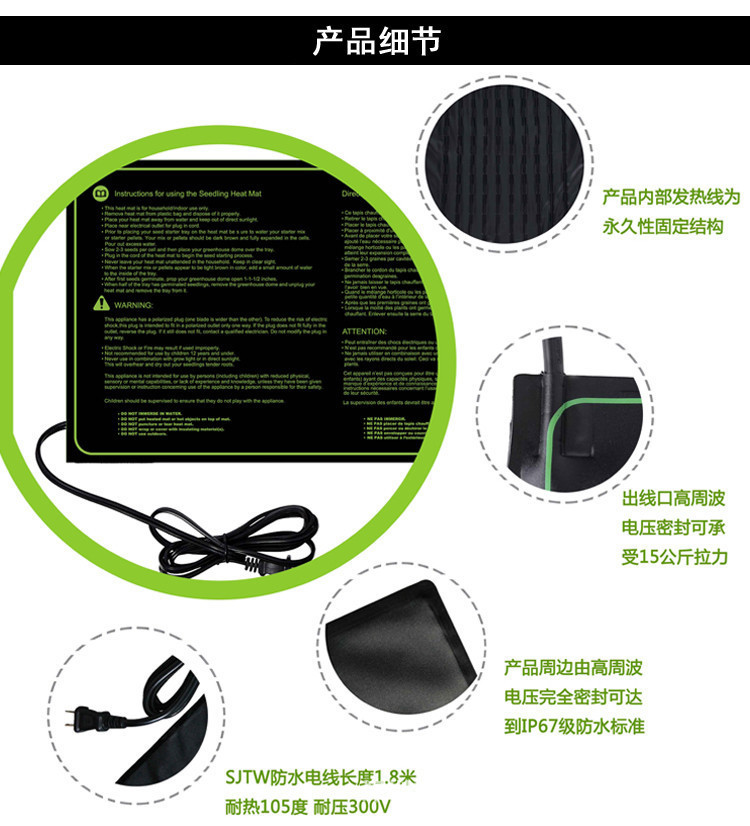 采用发热丝发热,5层防水结构,加热垫通过UL认证