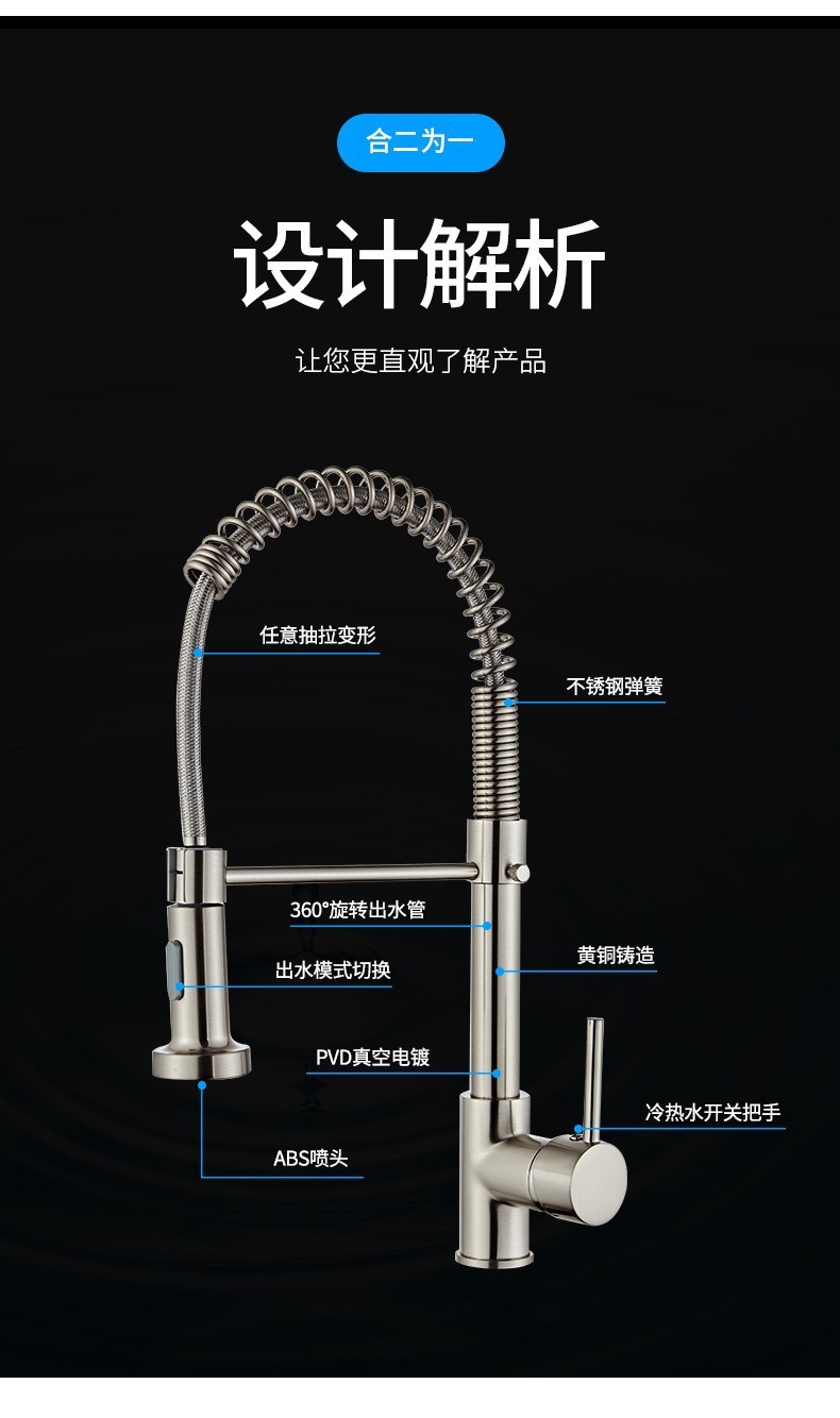 공장 직공급 스테인레스 스틸 스프링 수도꼭지 그리기 주방 수도꼭지 와이어 드로잉 싱크 뜨겁고 차가운 고압 수도꼭지