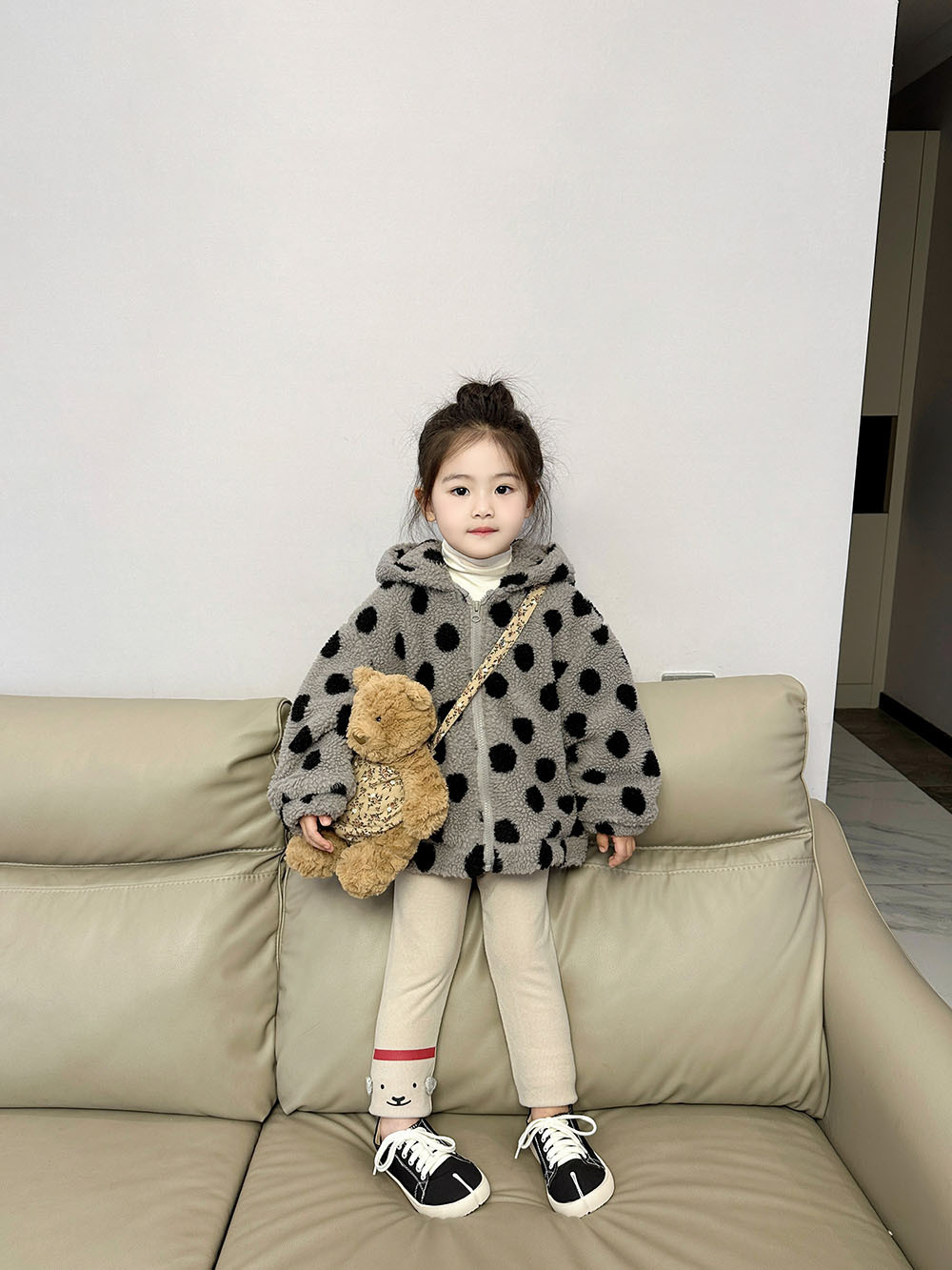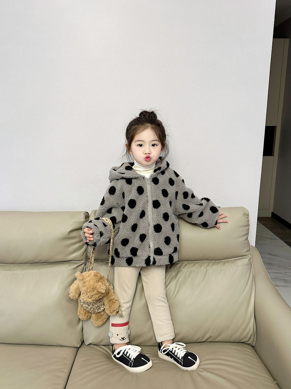2025 가을 겨울 한국 스타일 여아 물방울 무늬 털 코트 귀엽고 세련된 여아 후드 누빔 상의 3390