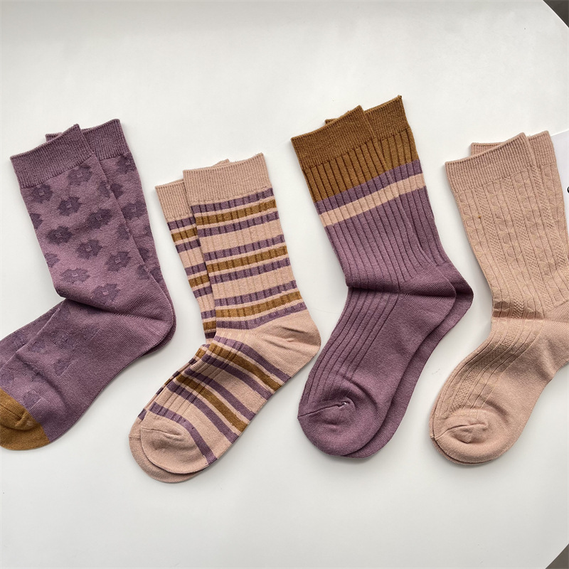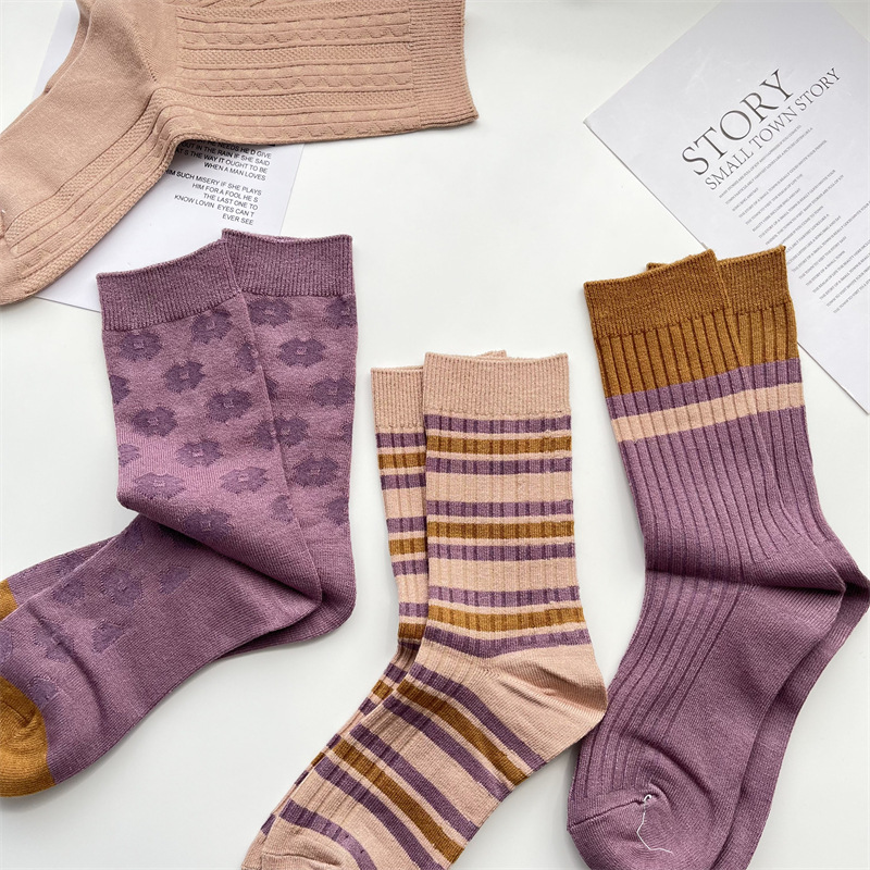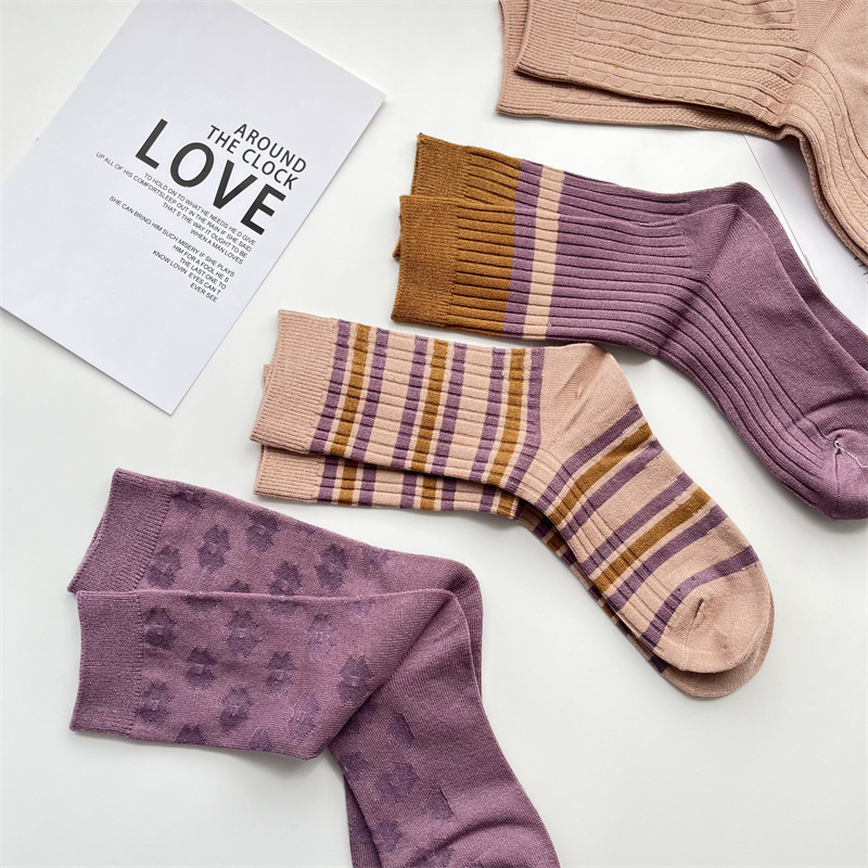가을과 겨울 퍼플 다크 패턴 양말 여성의 일본식 빈티지 스트라이프 미드 양말 한국 스타일 Instagram 인기있는 색상 매칭 더미 양말