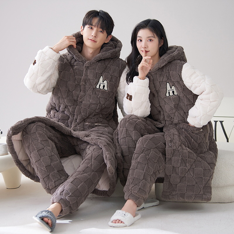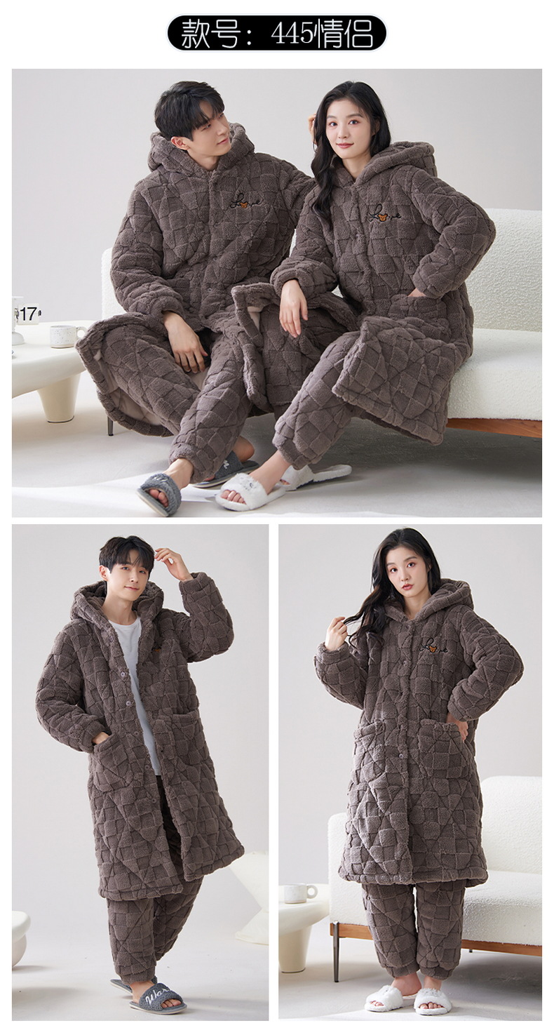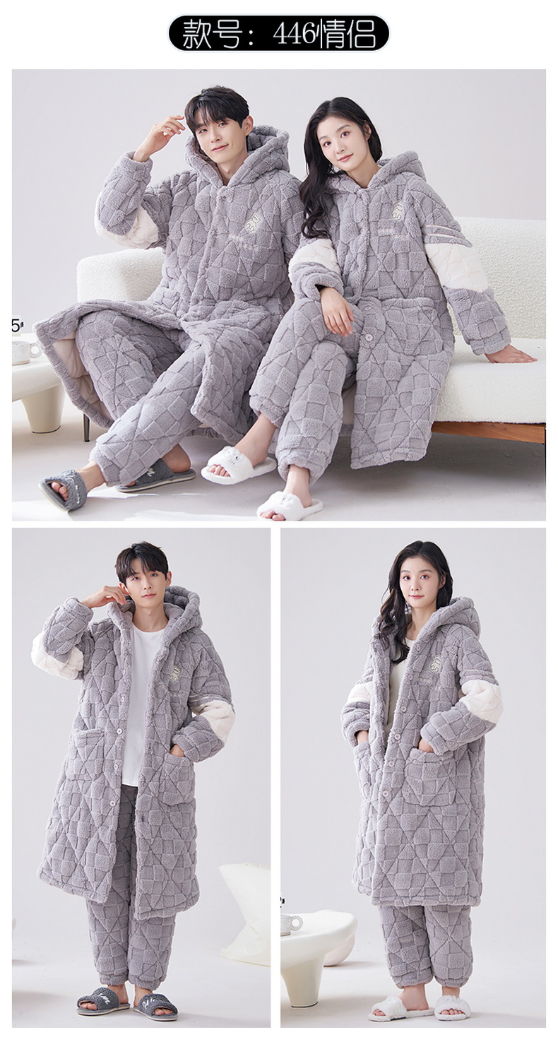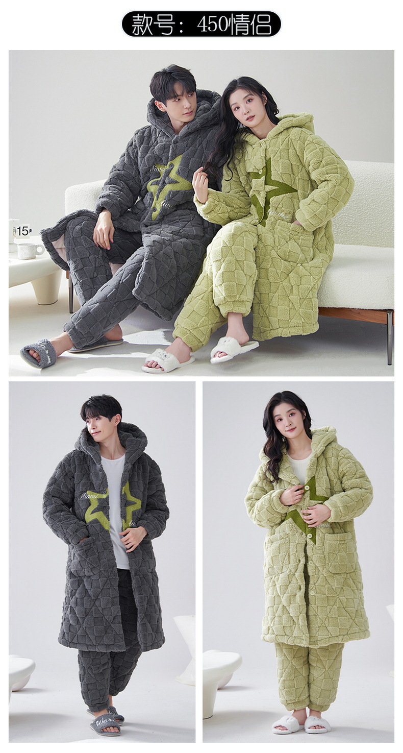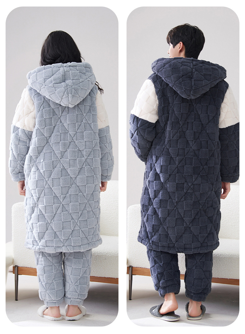 3 층 퀼트 산호 양털 커플 잠옷 여성용 겨울 중간 길이 가정복 잠옷 남성용 두꺼운 따뜻한 면 패딩 재킷