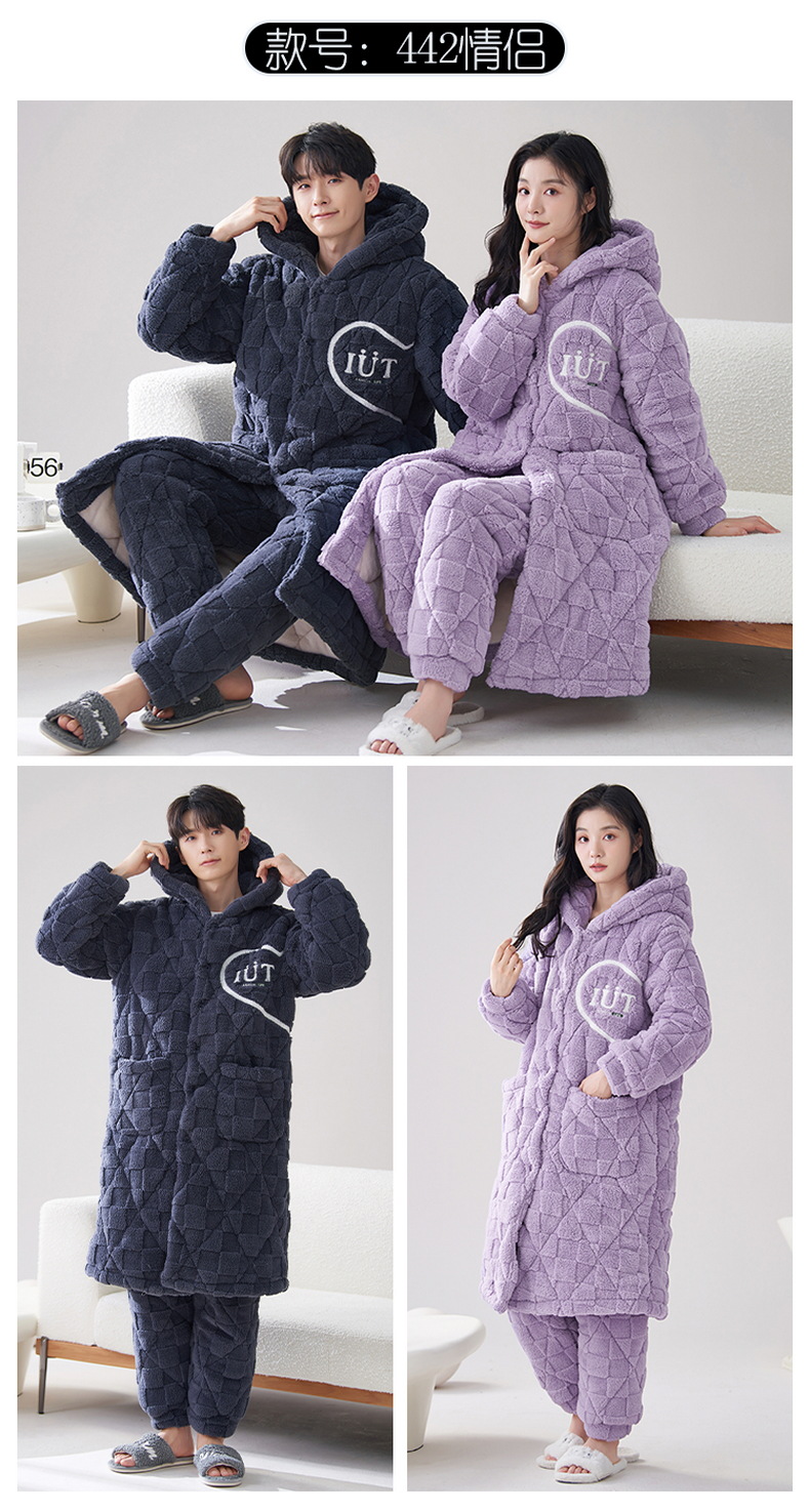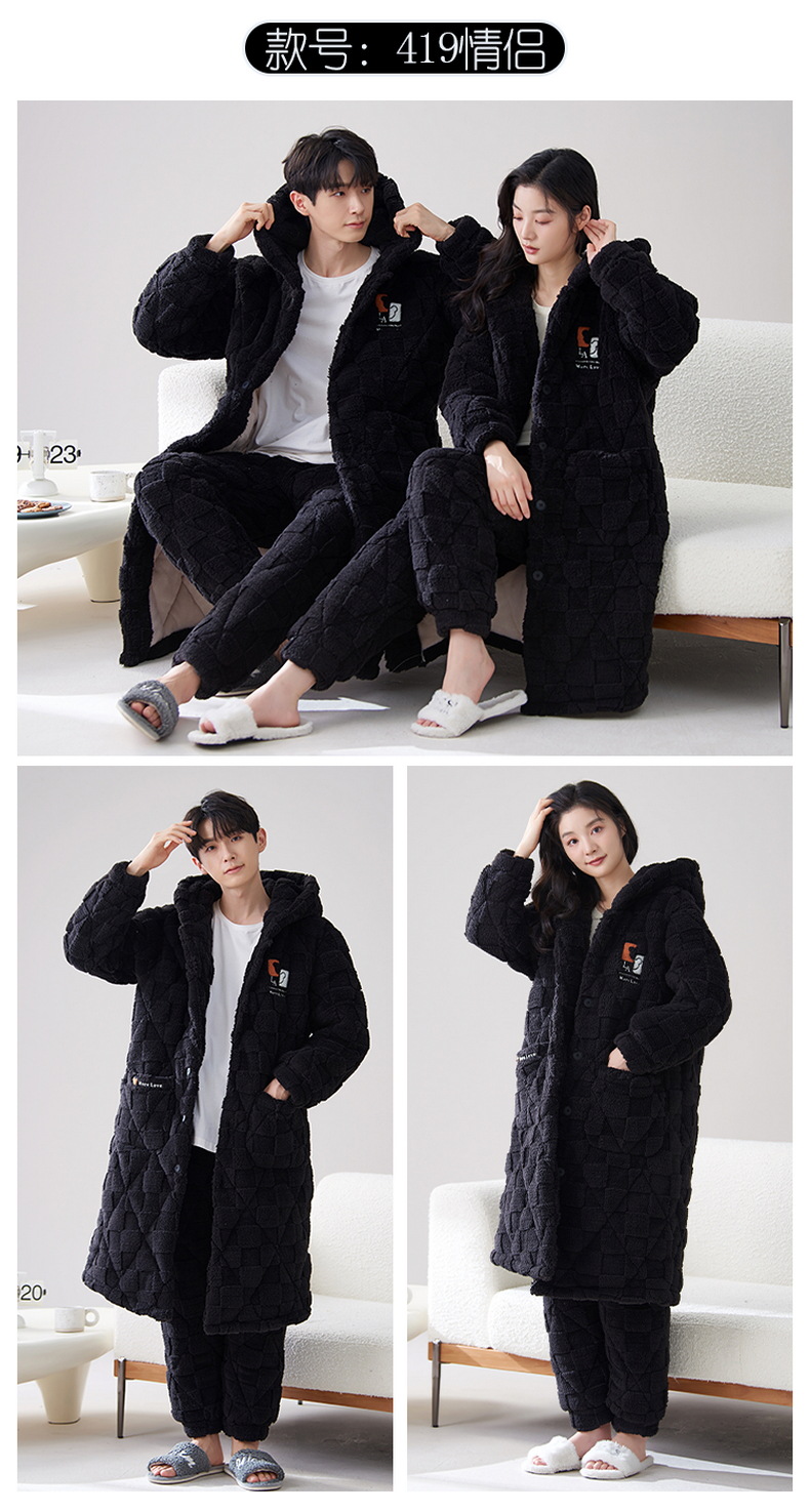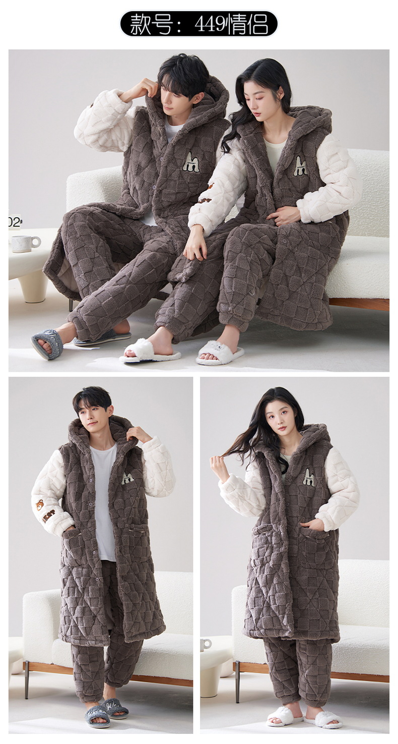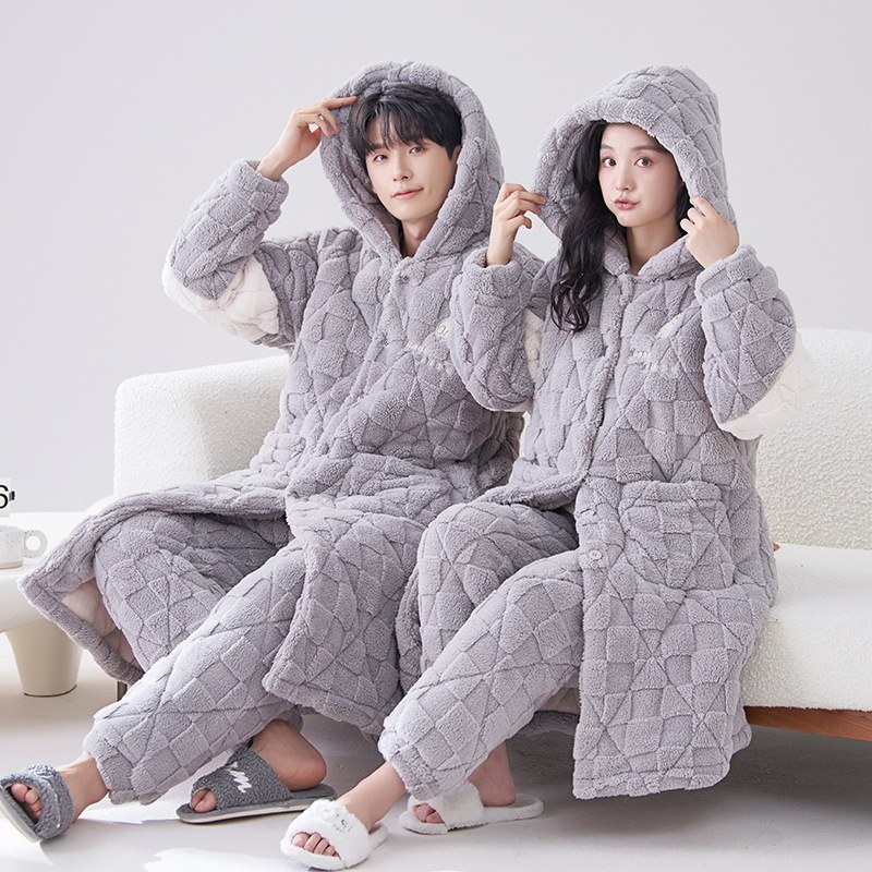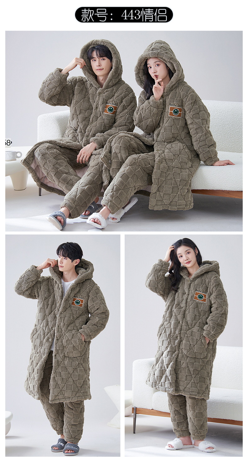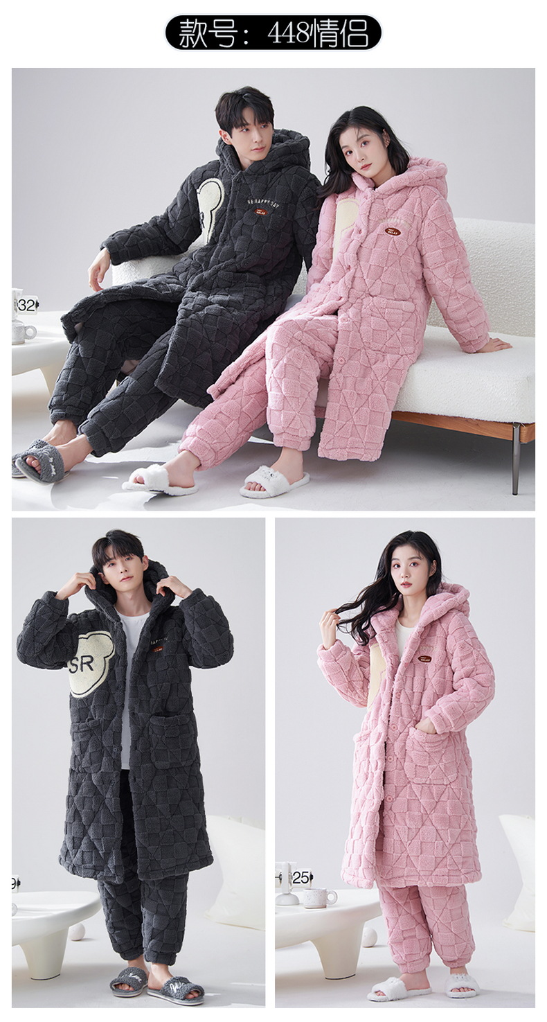 3 층 퀼트 산호 양털 커플 잠옷 여성용 겨울 중간 길이 가정복 잠옷 남성용 두꺼운 따뜻한 면 패딩 재킷
