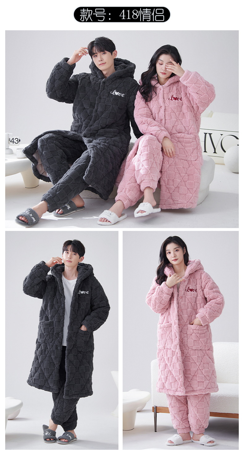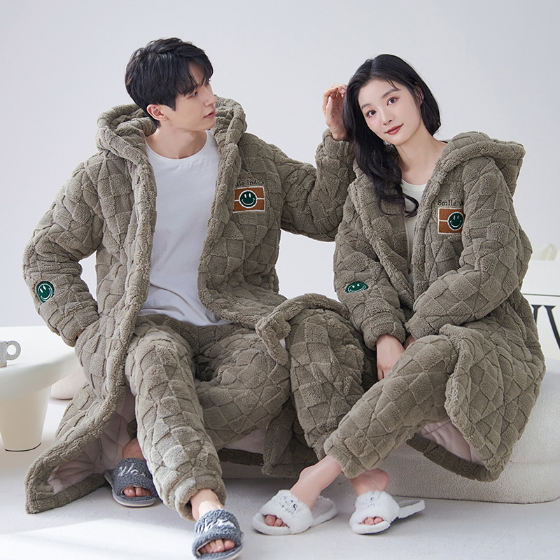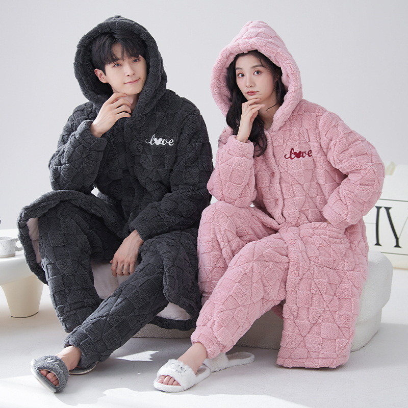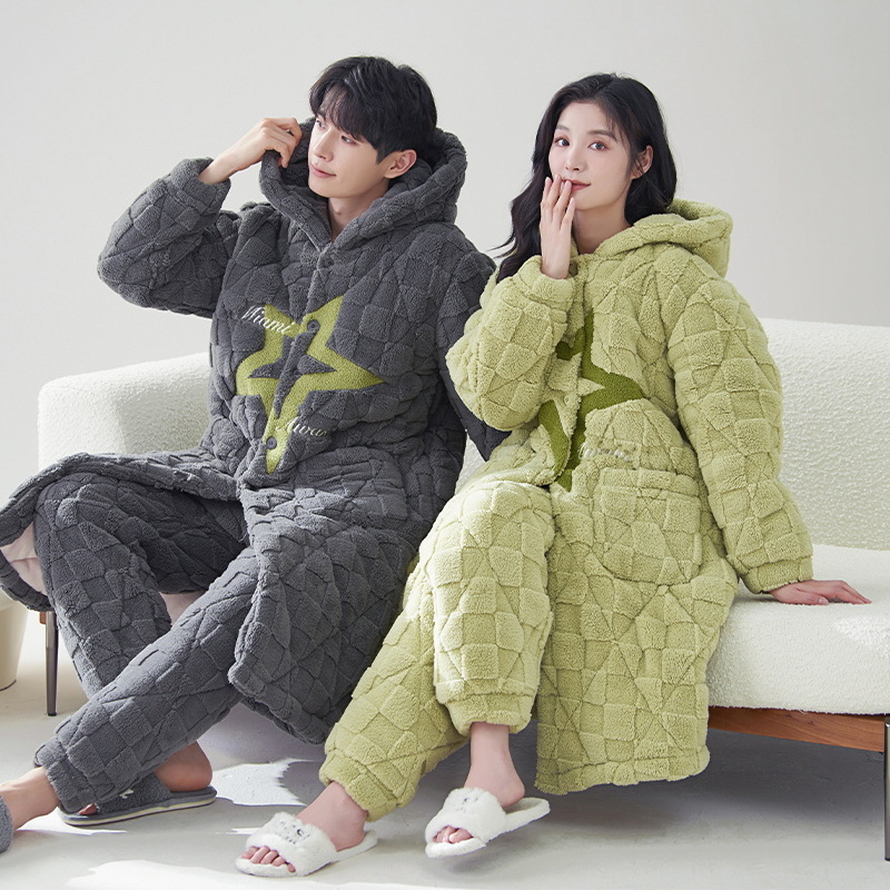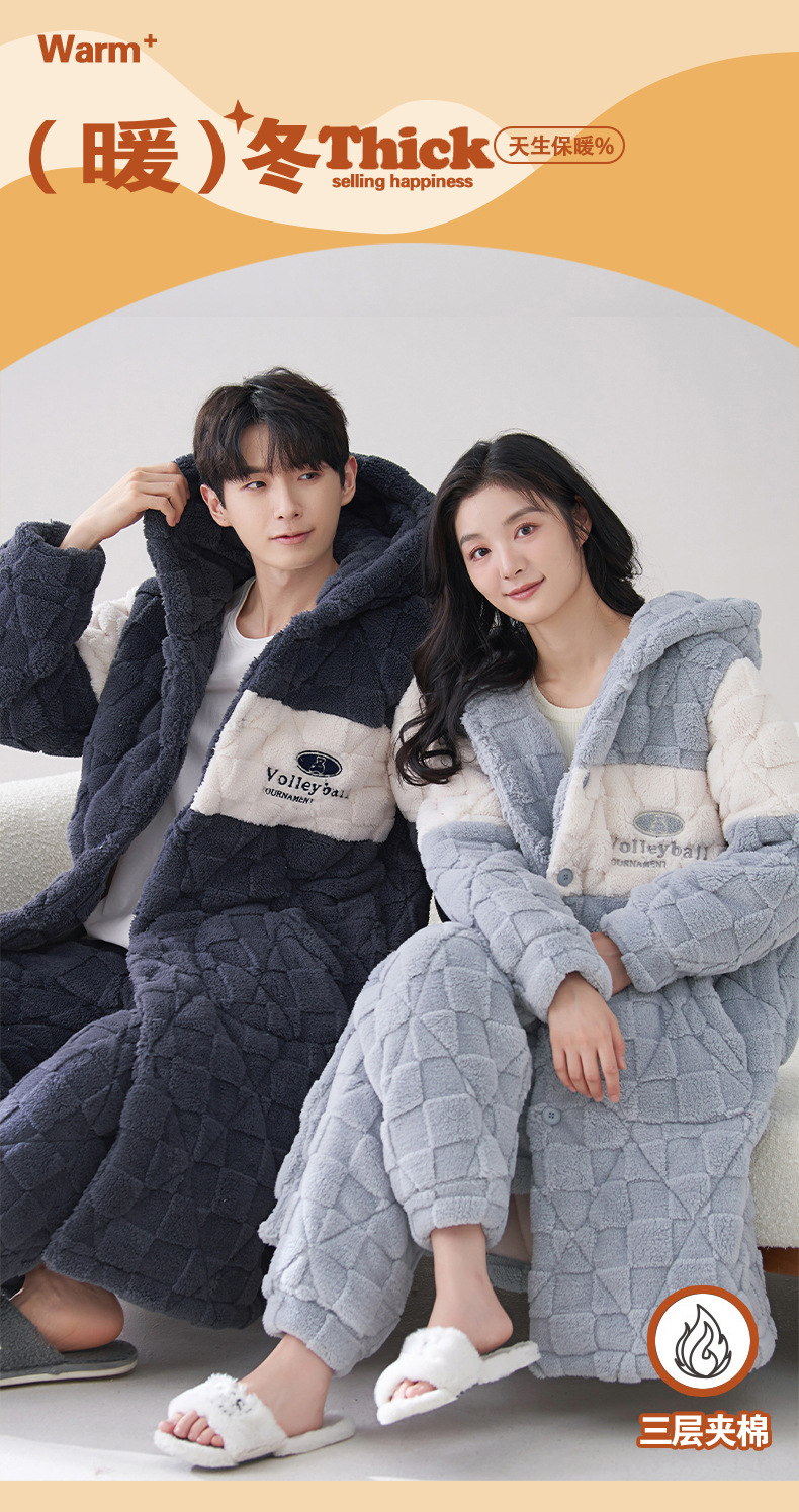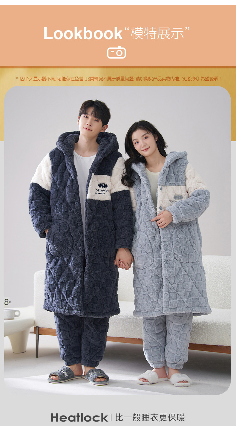 3 층 퀼트 산호 양털 커플 잠옷 여성용 겨울 중간 길이 가정복 잠옷 남성용 두꺼운 따뜻한 면 패딩 재킷