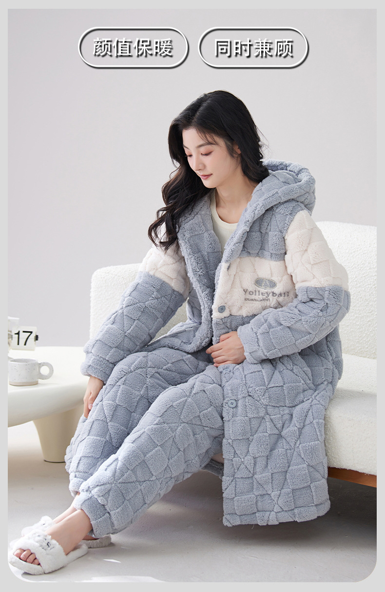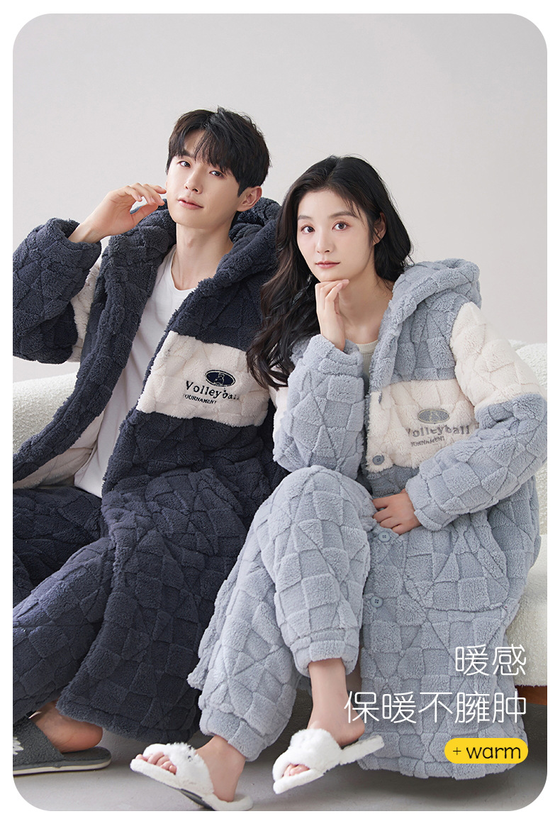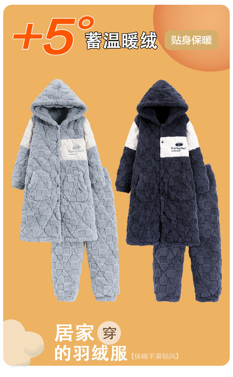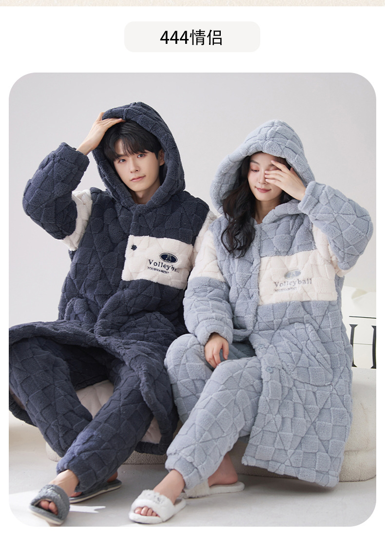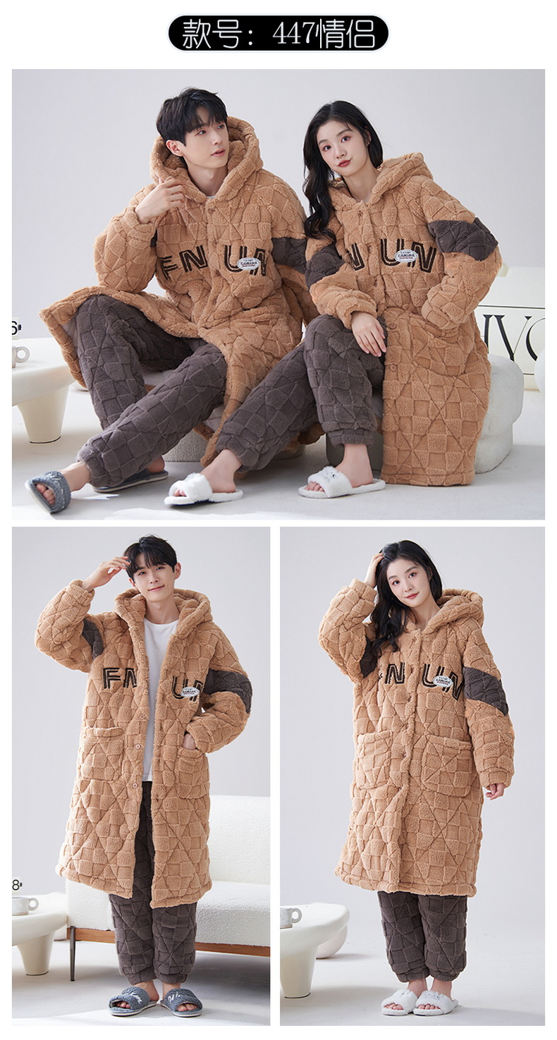 3 층 퀼트 산호 양털 커플 잠옷 여성용 겨울 중간 길이 가정복 잠옷 남성용 두꺼운 따뜻한 면 패딩 재킷