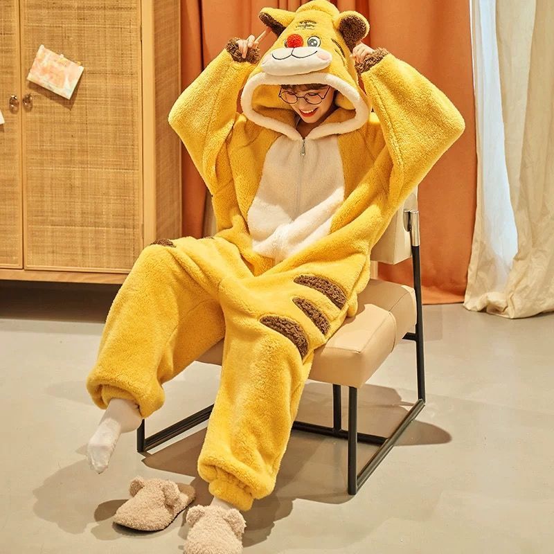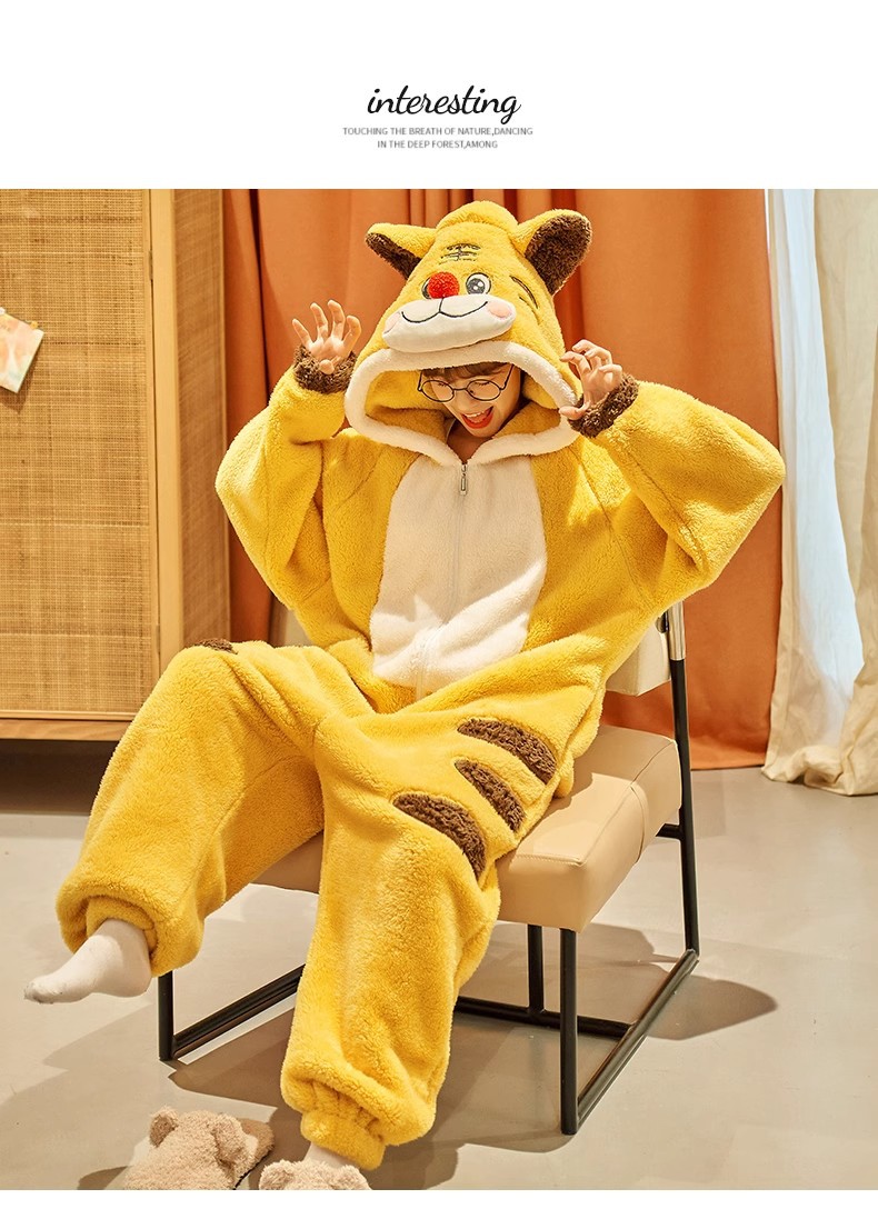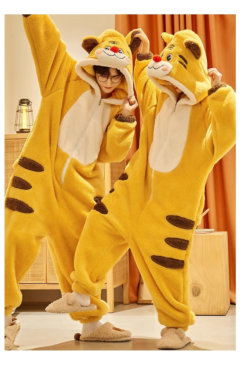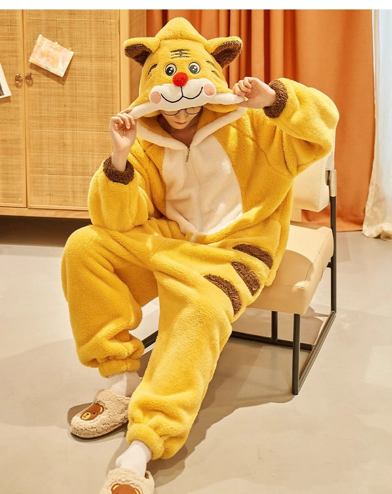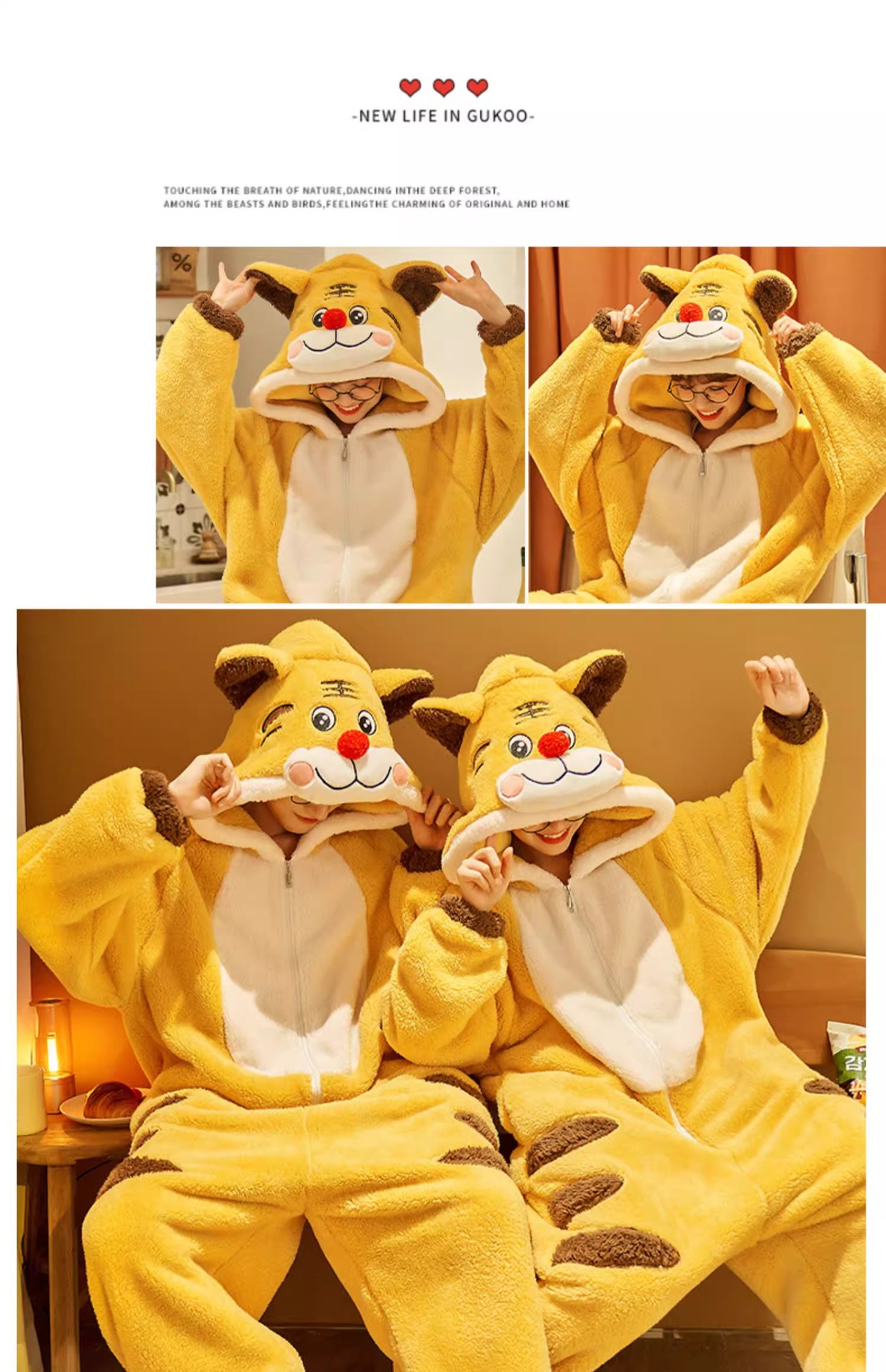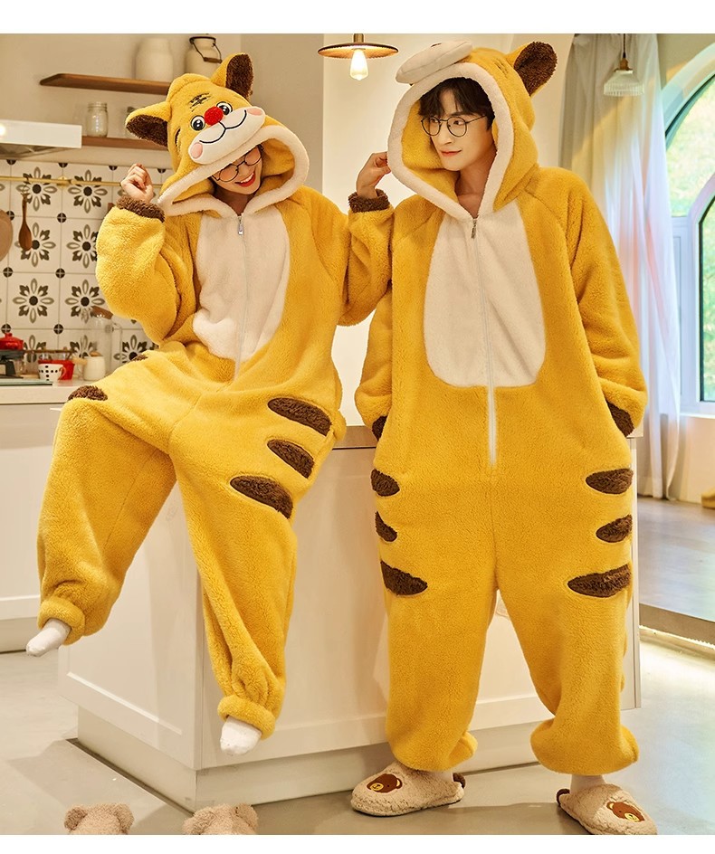 2025년 신상 가을 겨울 커플 호랑이 원피스 잠옷 산호 벨벳 만화 캐릭터 후드가 달린 두꺼운 홈웨어스토어 가기