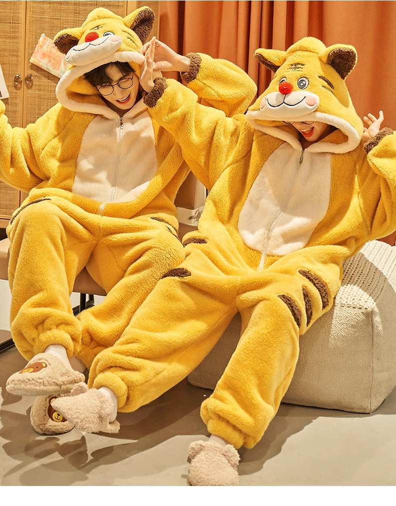 2025년 신상 가을 겨울 커플 호랑이 원피스 잠옷 산호 벨벳 만화 캐릭터 후드가 달린 두꺼운 홈웨어