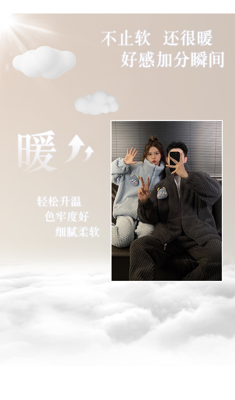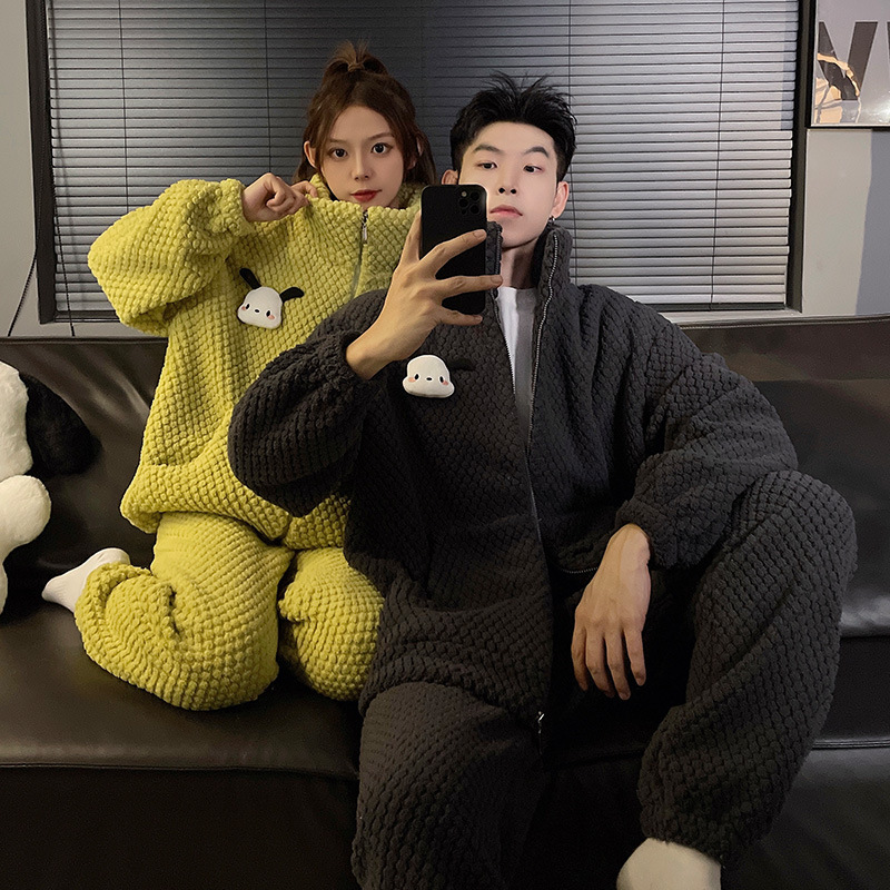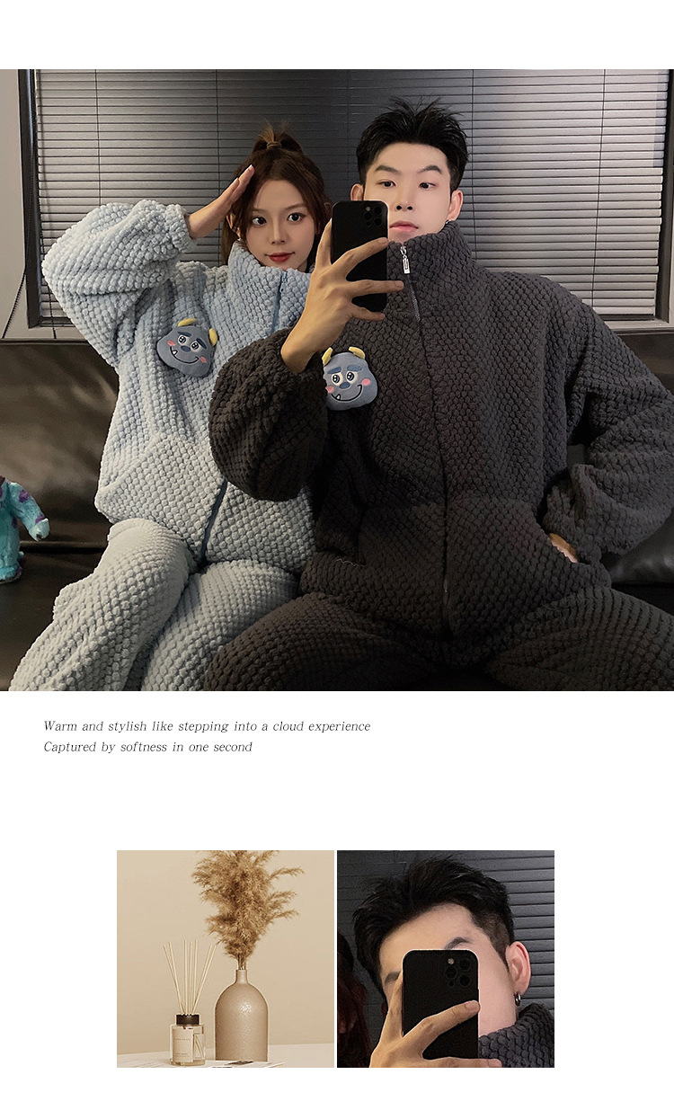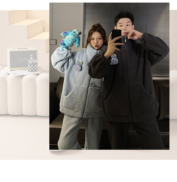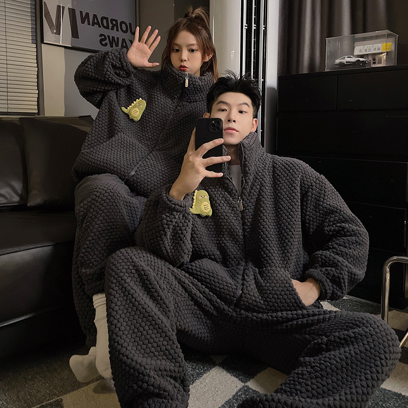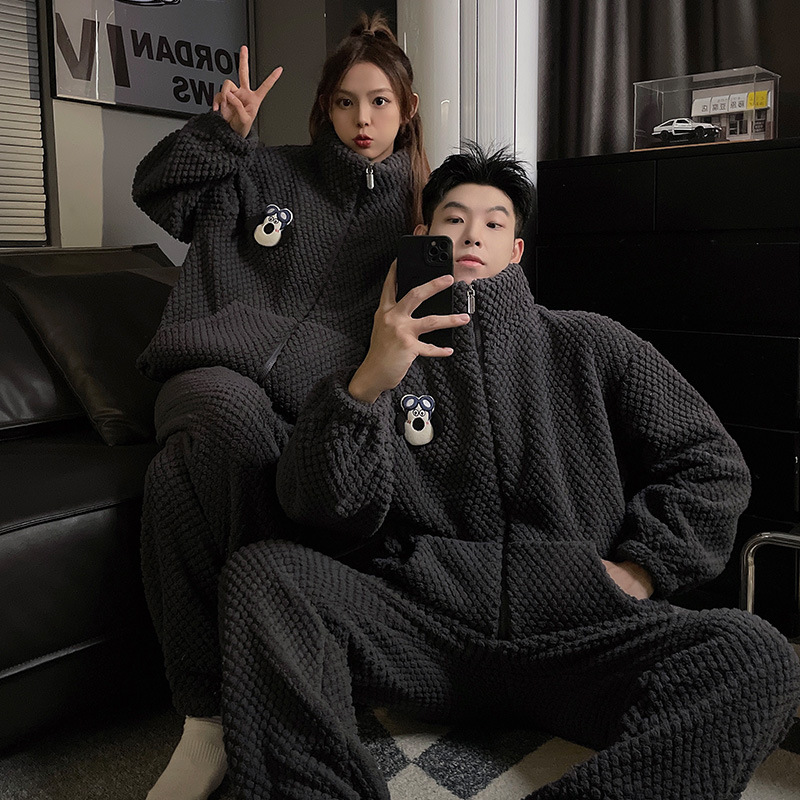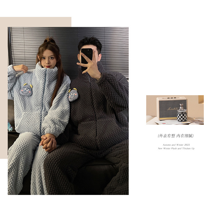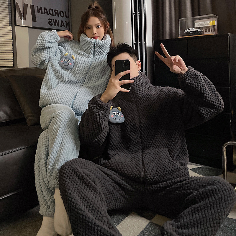 커플 잠옷 겨울 두꺼운 기모 여자의 산호 양털 귀여운 가을/겨울 지퍼 남자의 플란넬 가정 옷 세트