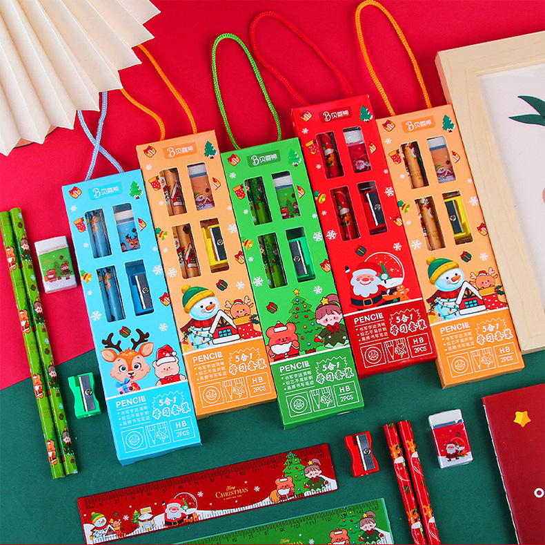 어린이 크리스마스 연필 문구 휴대용 5-in-1 학습 세트 선물 상자 유치원 크리스마스 생일 동반 선물