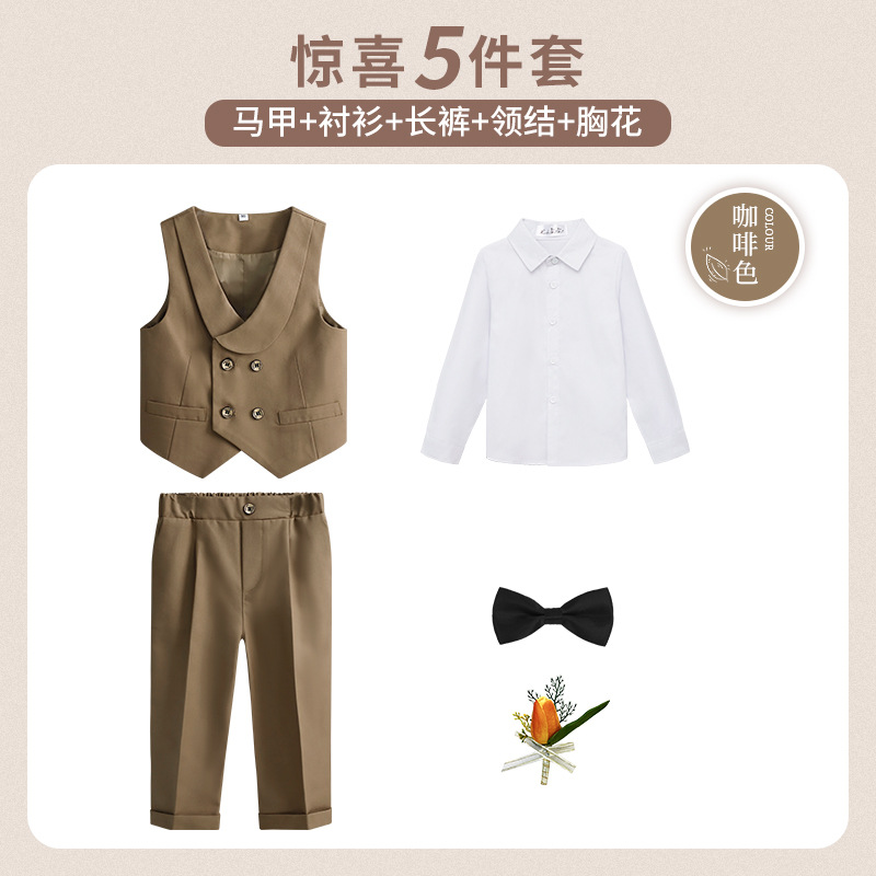 • 다크 브라운 5 종 세트 (양복 조끼 + 바지 + 긴소매 셔츠 + 코사지 + 나비 넥타이)