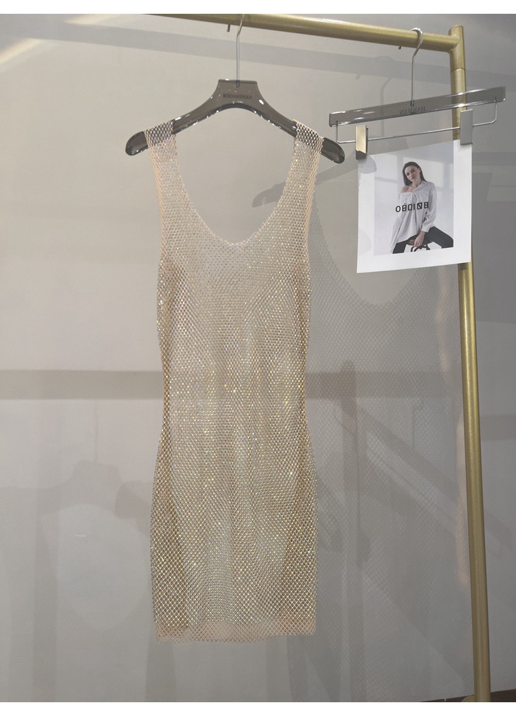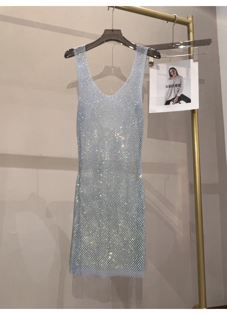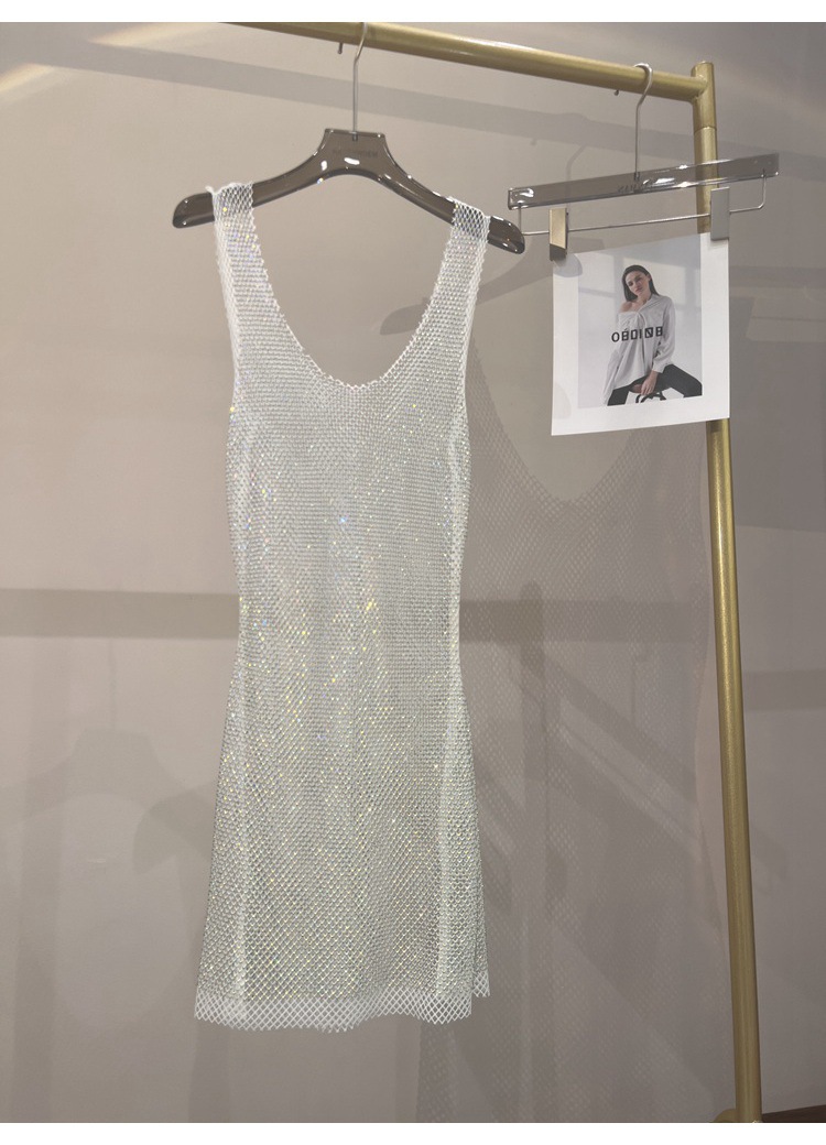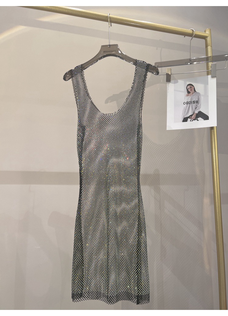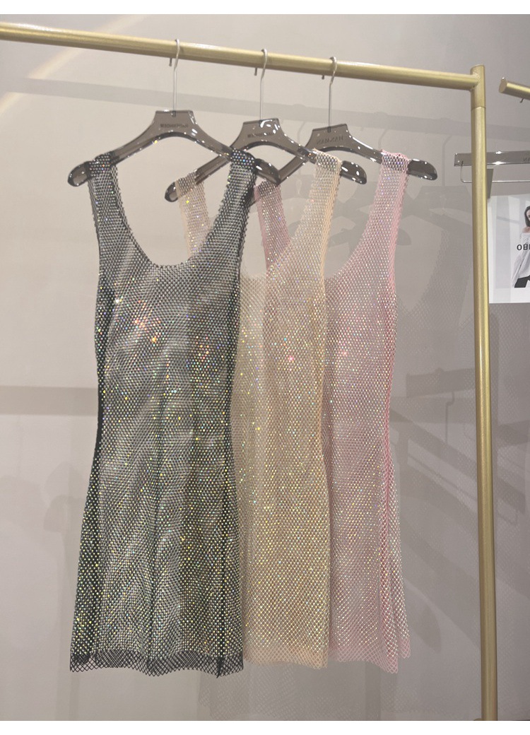 반짝이는 모조 다이아몬드 파티 원피스 섹시한 관점 중공 원피스 크루 넥 민소매 원피스 클럽스토어 가기