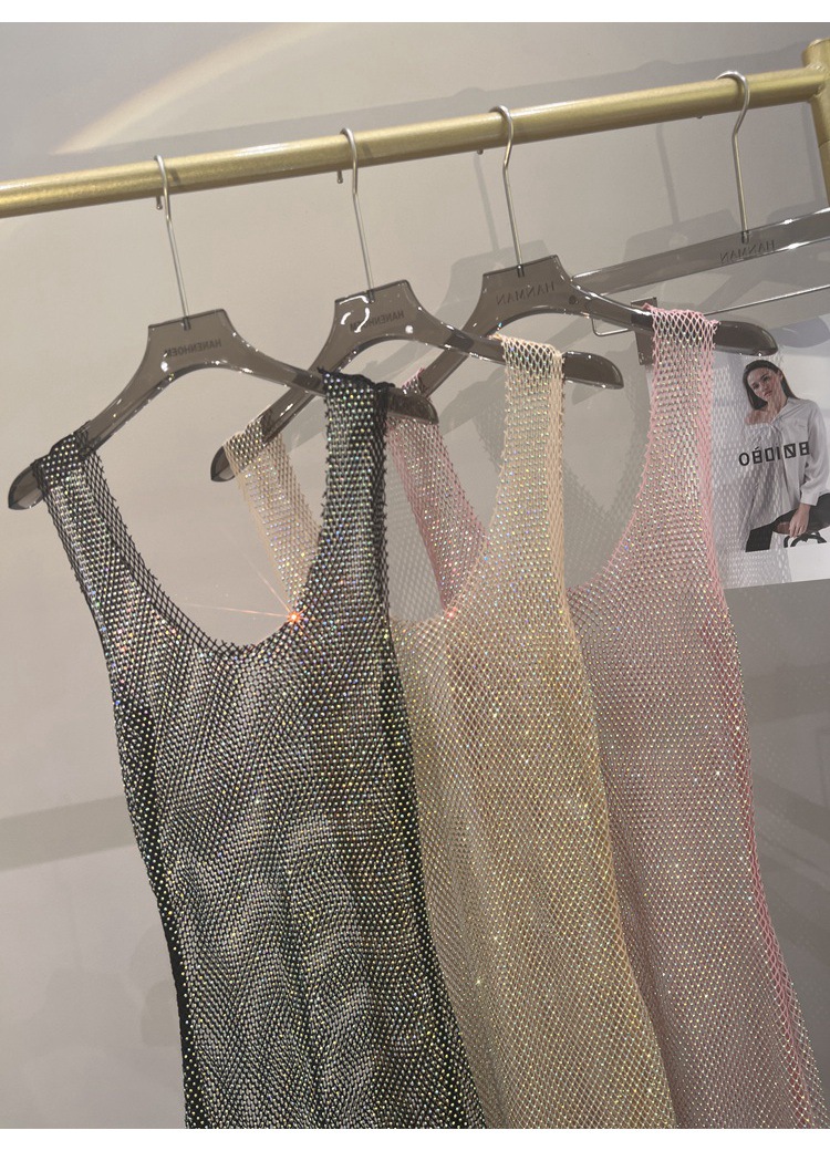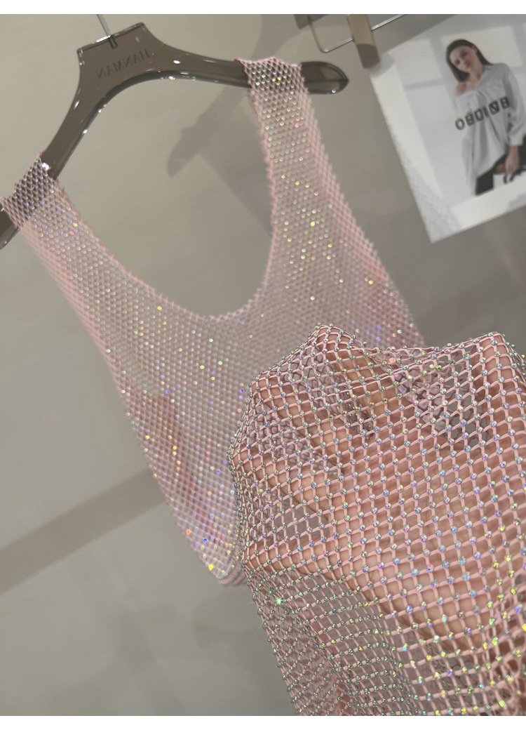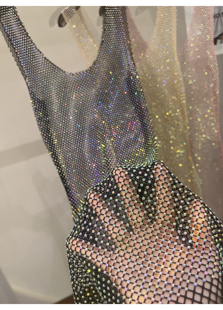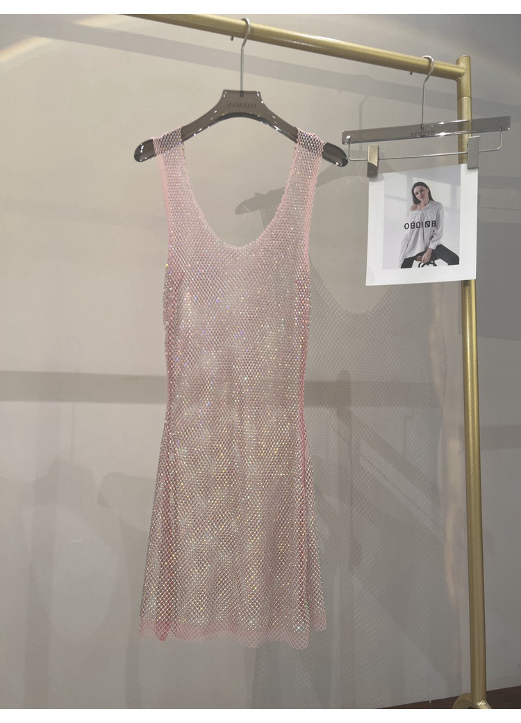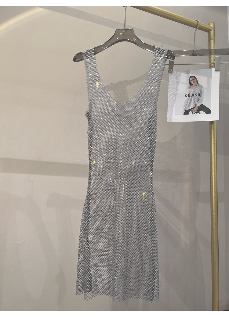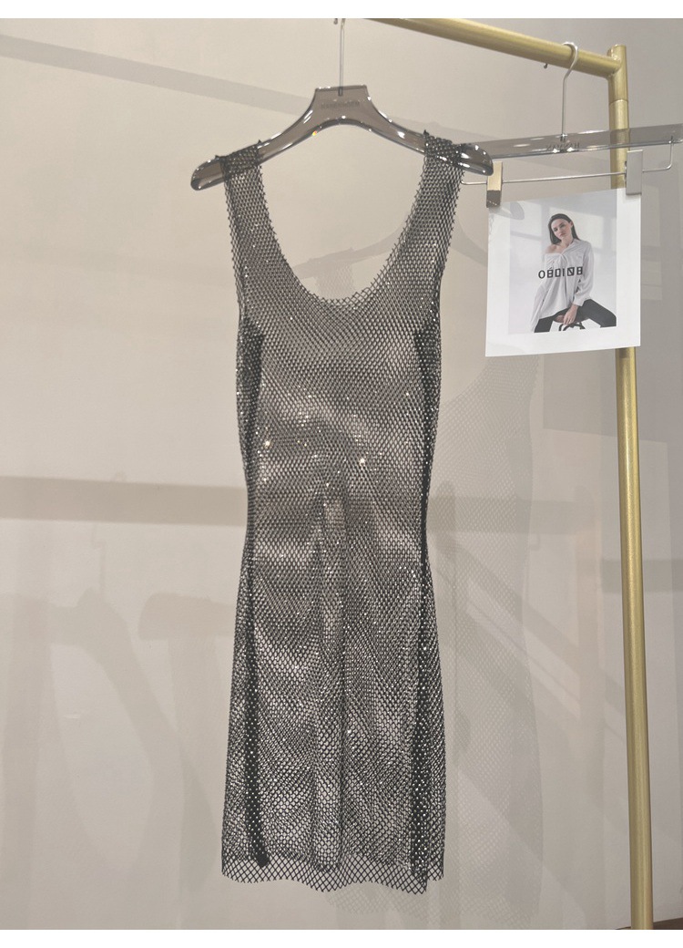 반짝이는 모조 다이아몬드 파티 원피스 섹시한 관점 중공 원피스 크루 넥 민소매 원피스 클럽스토어 가기