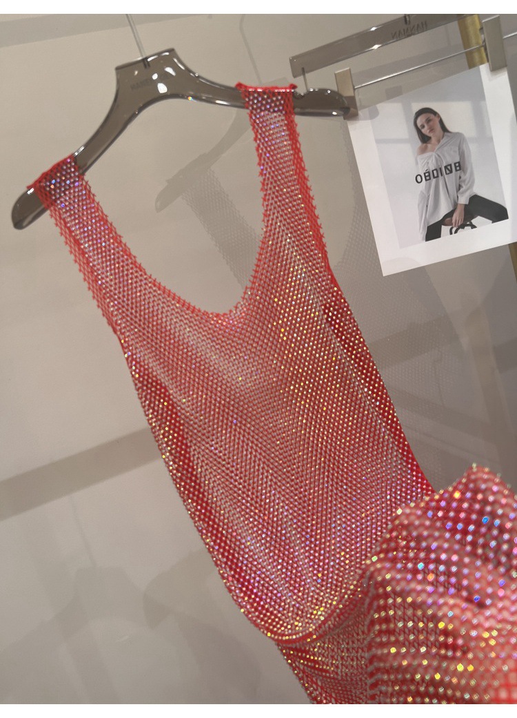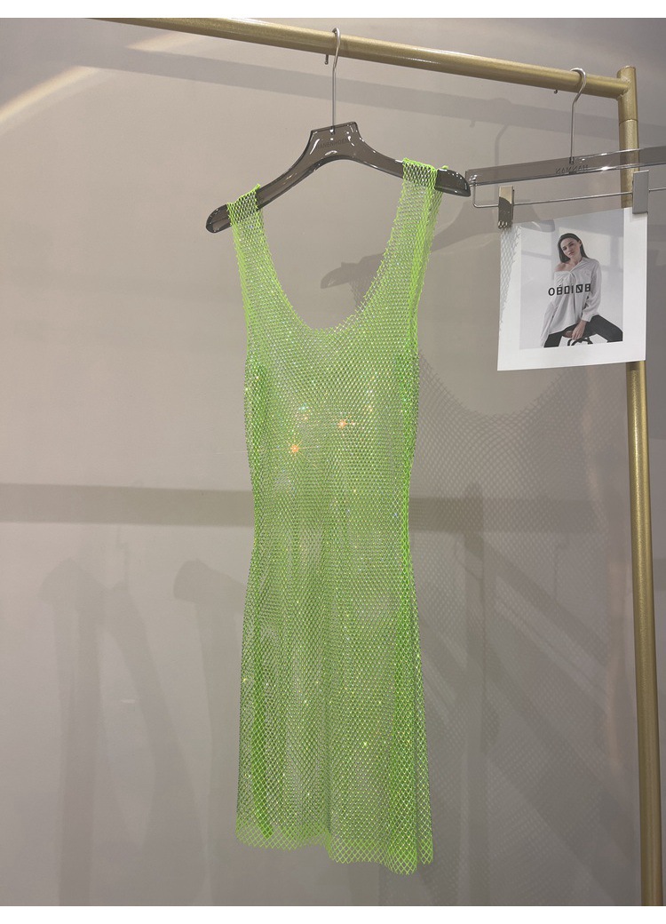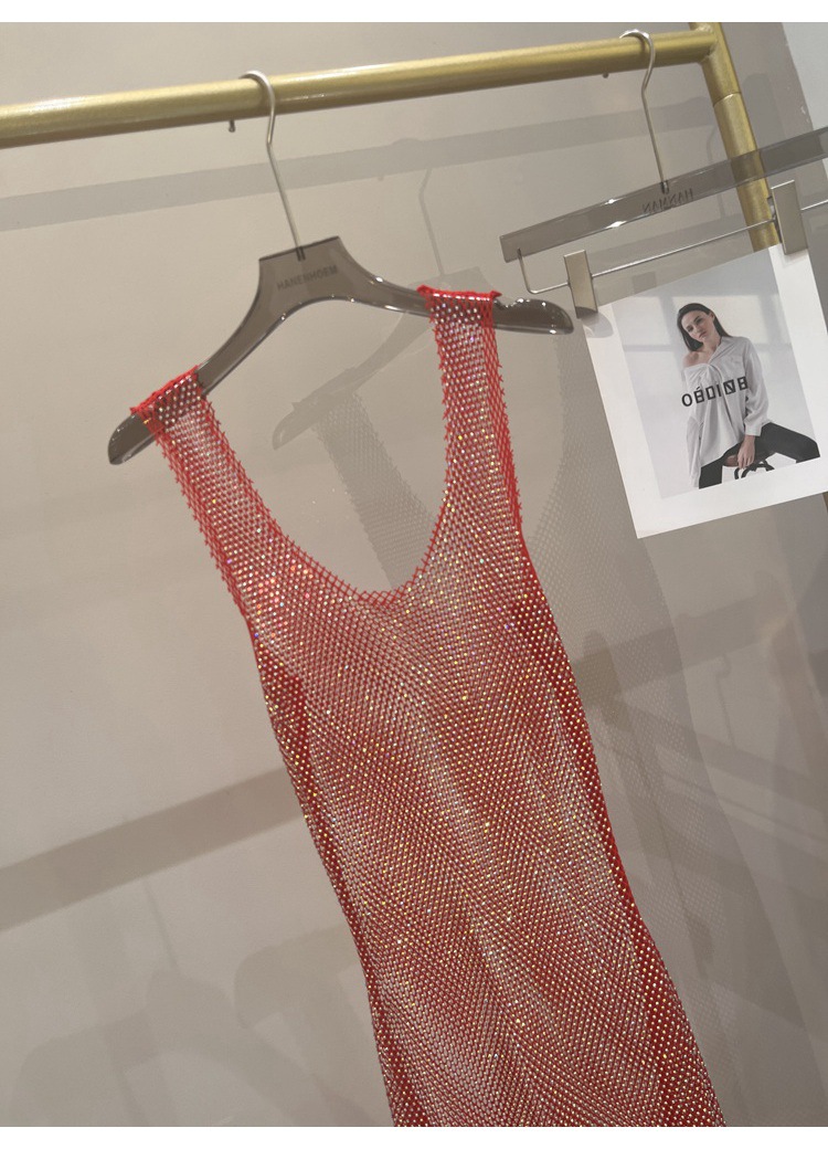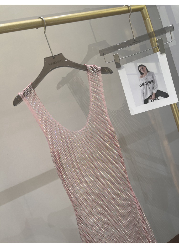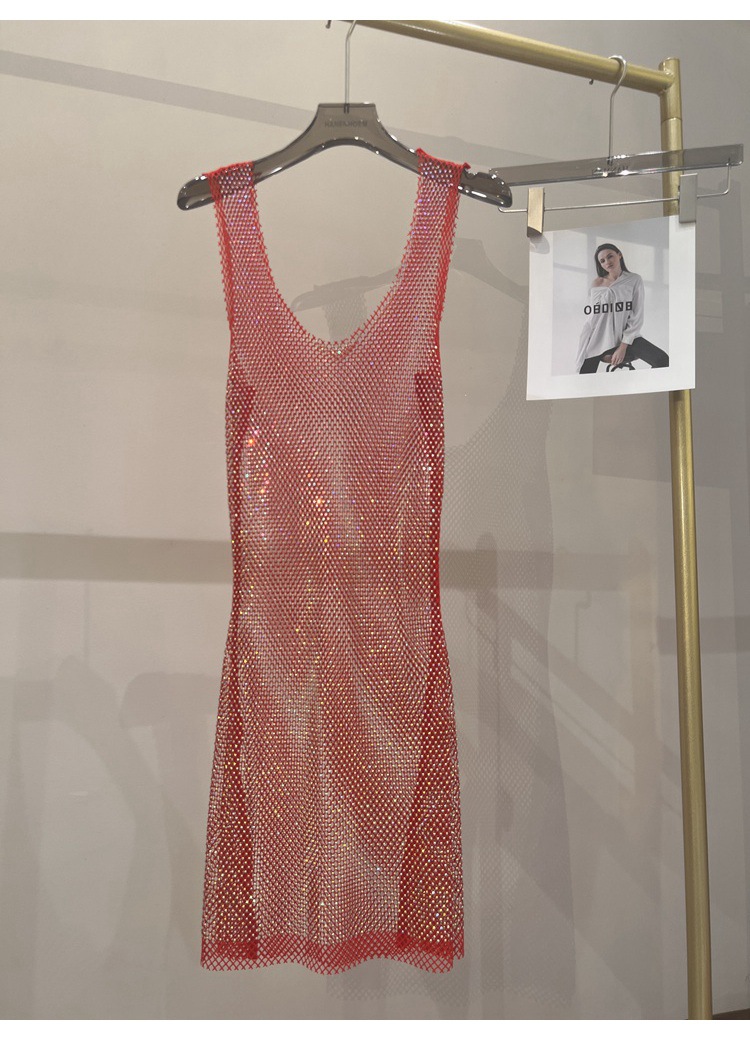반짝이는 모조 다이아몬드 파티 원피스 섹시한 관점 중공 원피스 크루 넥 민소매 원피스 클럽스토어 가기