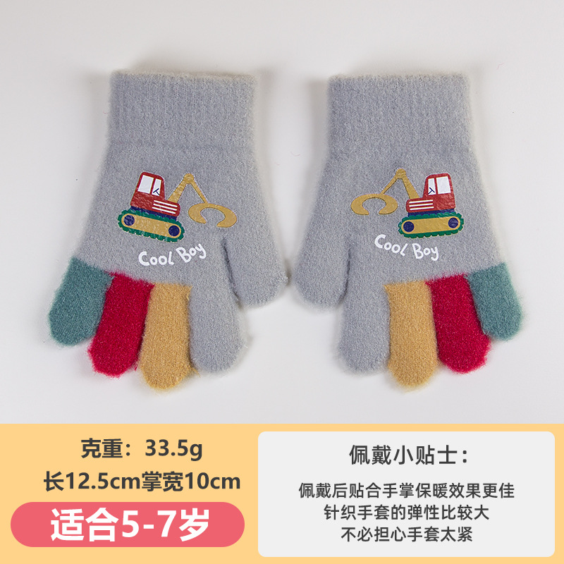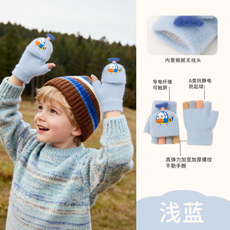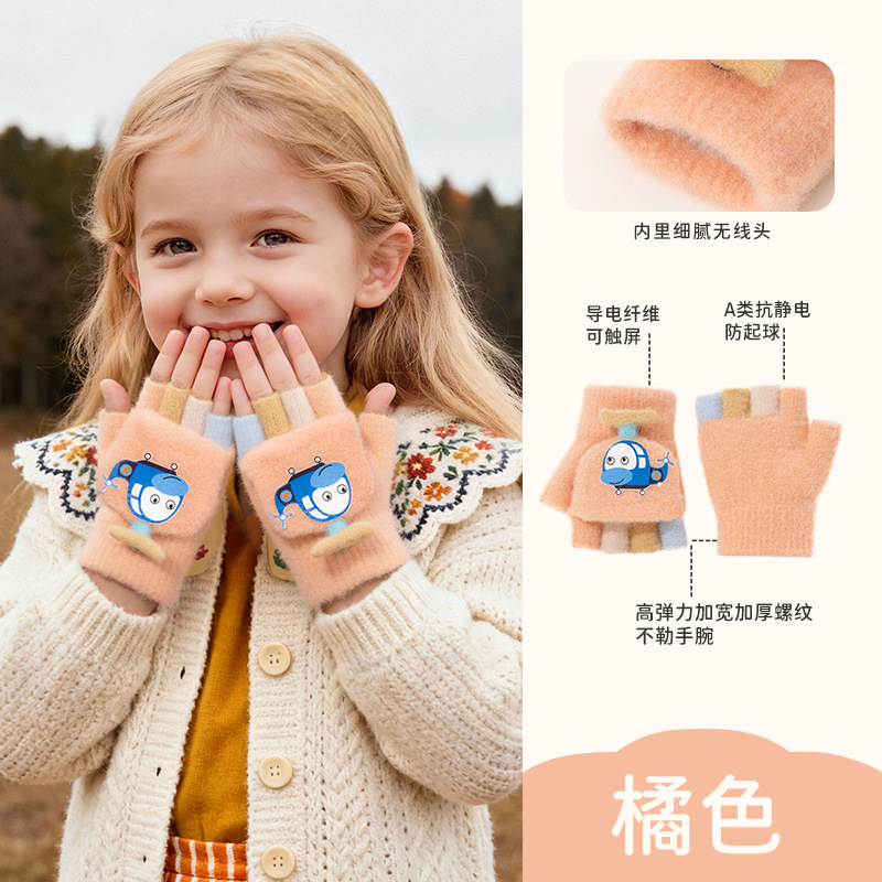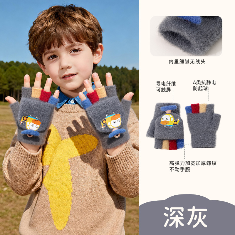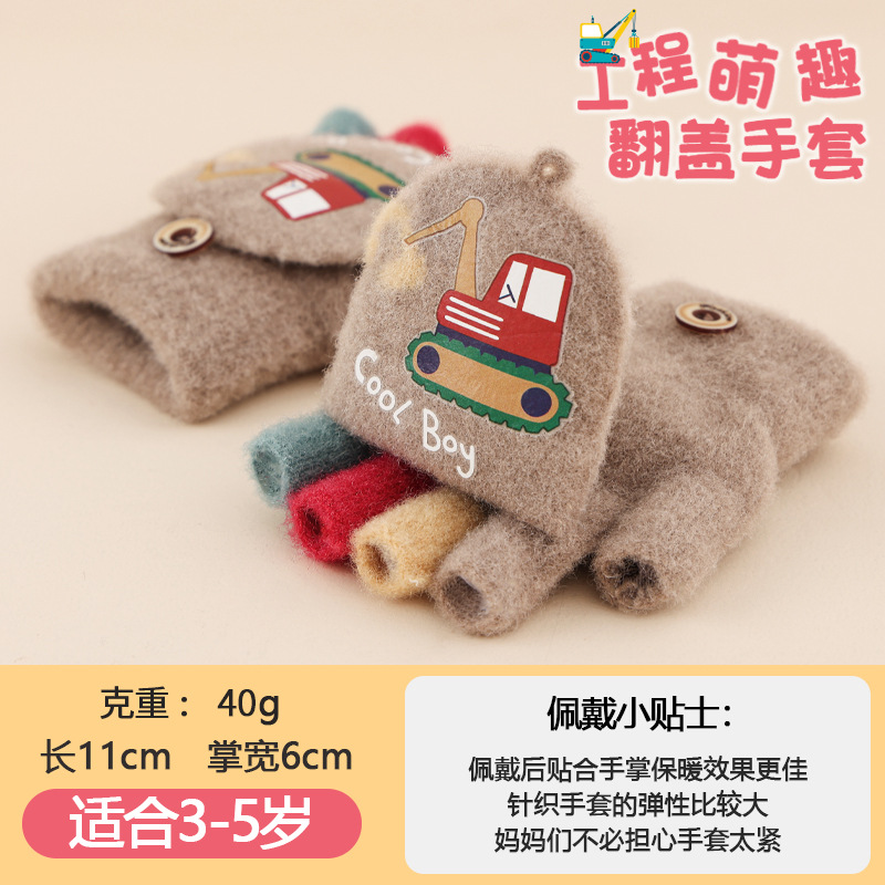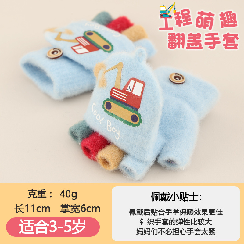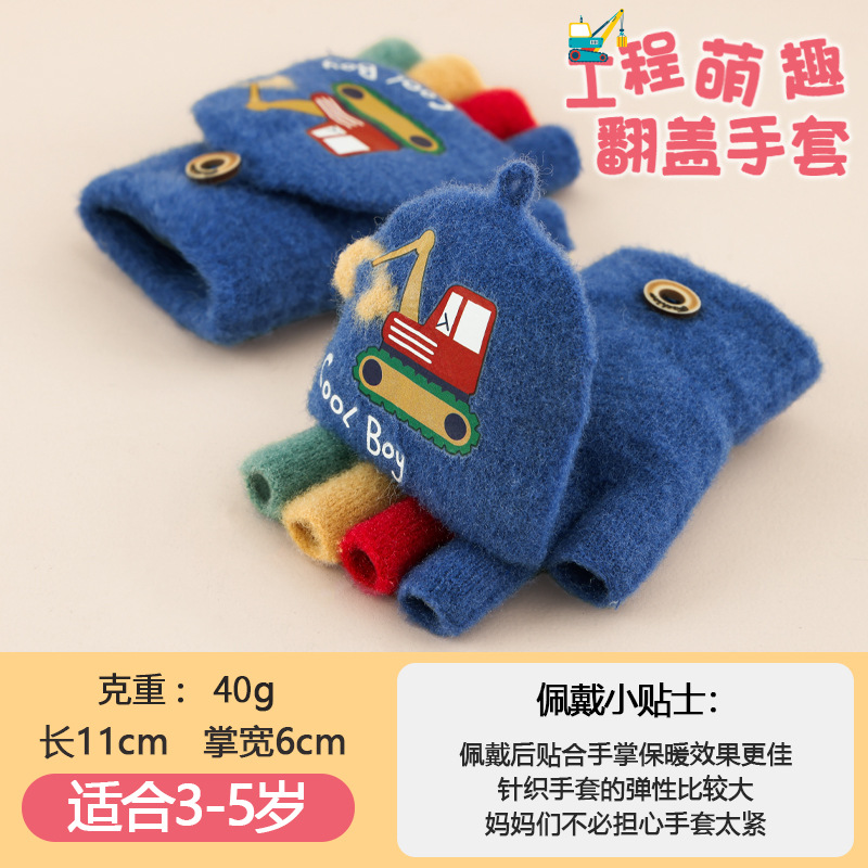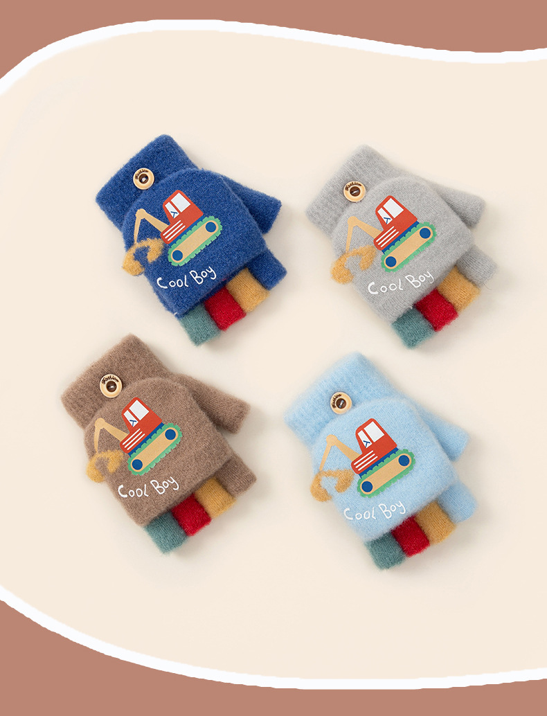 굴착기 소년 겨울 만화 귀여운 유치원 반손가락 니트 울 방한 보온 어린이 플립업 장갑