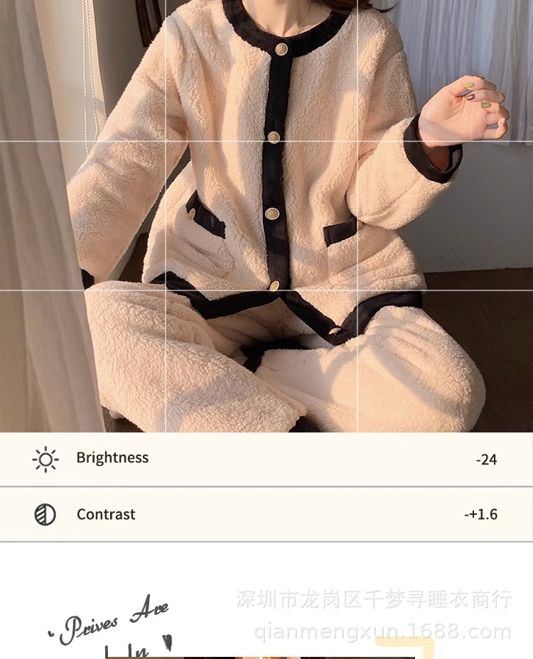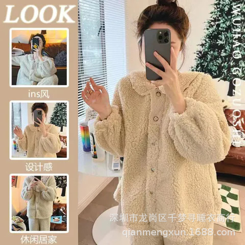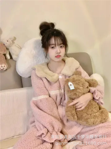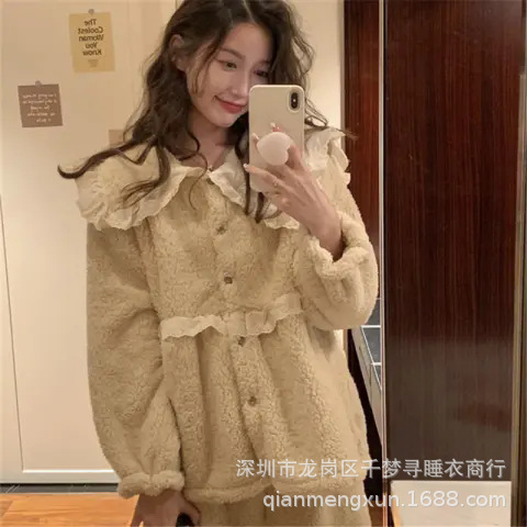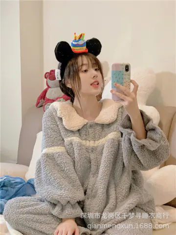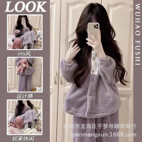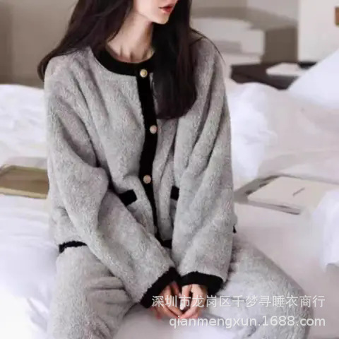 가을과 겨울 여자의 플란넬 잠옷 여자의 겨울 긴 소매 두꺼운 기모 귀여운 여자의 가정 옷 세트스토어 가기