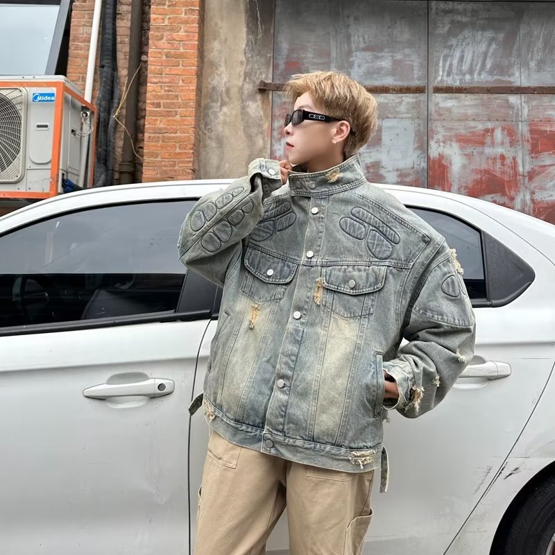 아메리칸 스타일 하이 스트리트 유행 브랜드 오토바이 데님 재킷 갑옷 충전 남자와 여자의 같은 스타일 커플의 유행 디자인 감각 재킷스토어 가기
