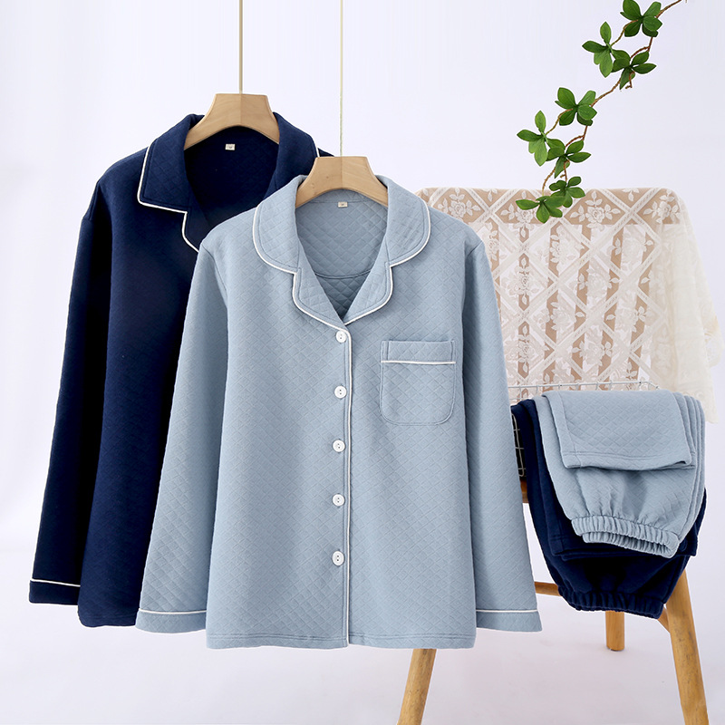 단색 공기 층 커플 세트 면 가정용 공기 면 따뜻한 가정 옷 옷깃 남성과 여성의 잠옷