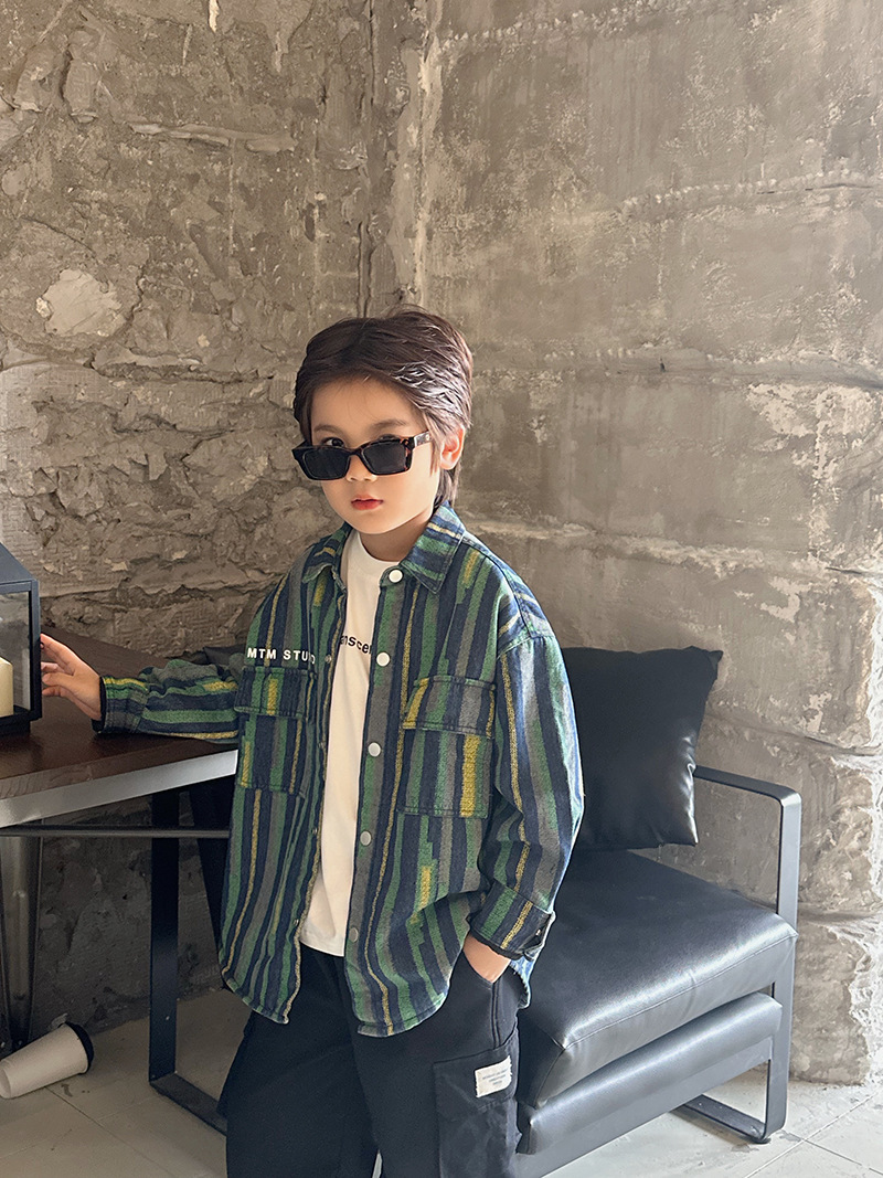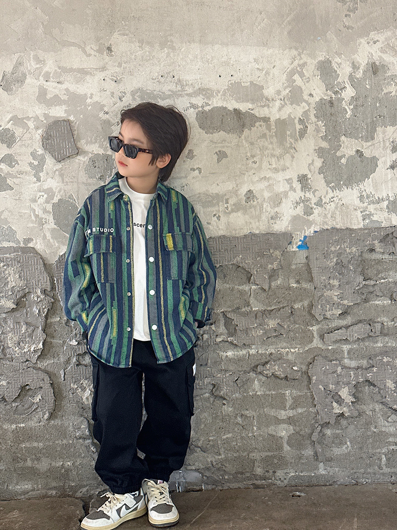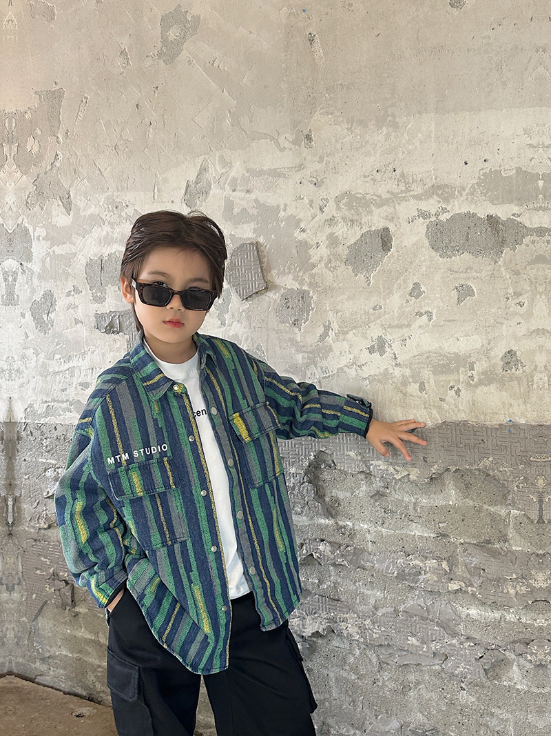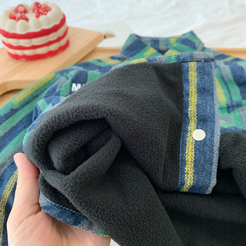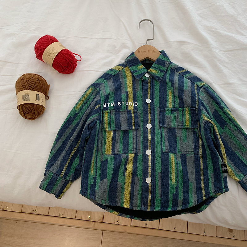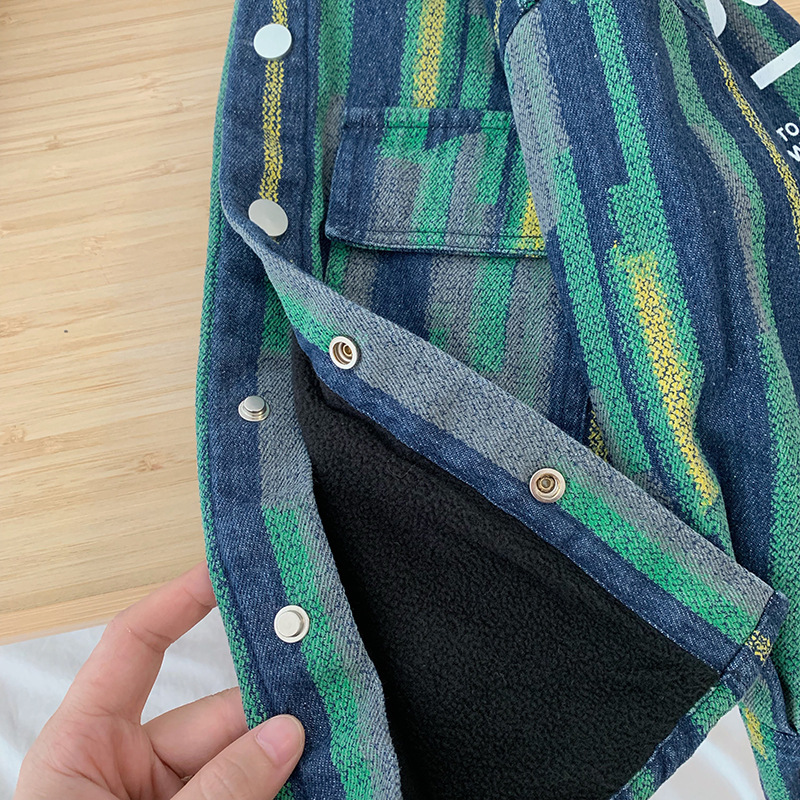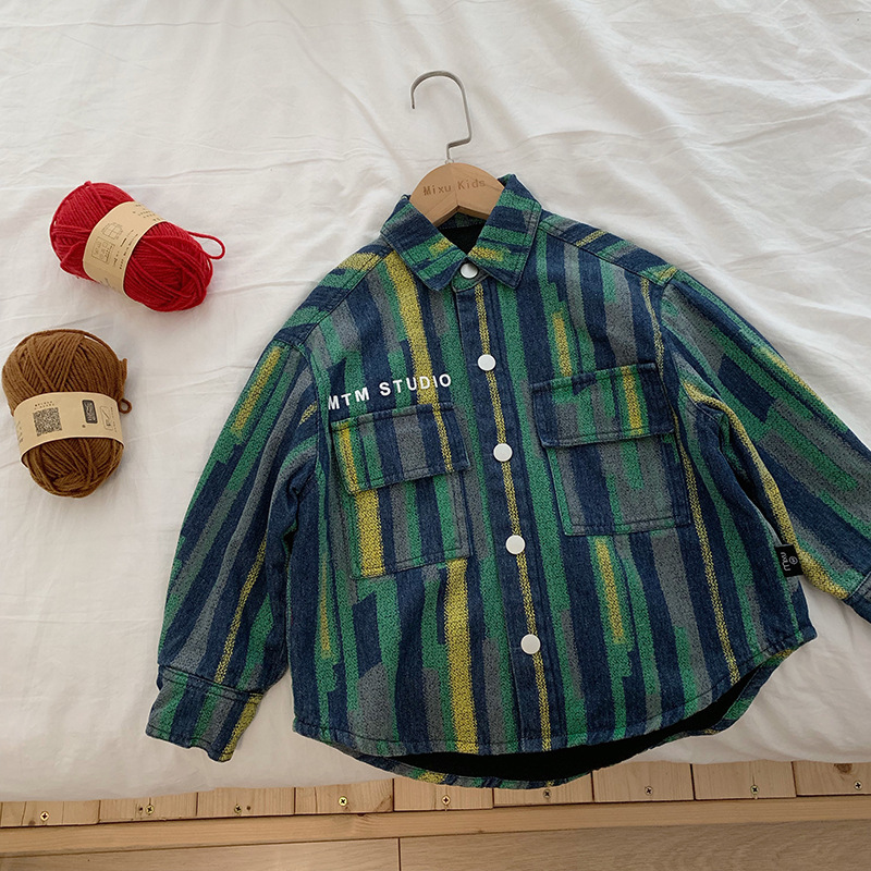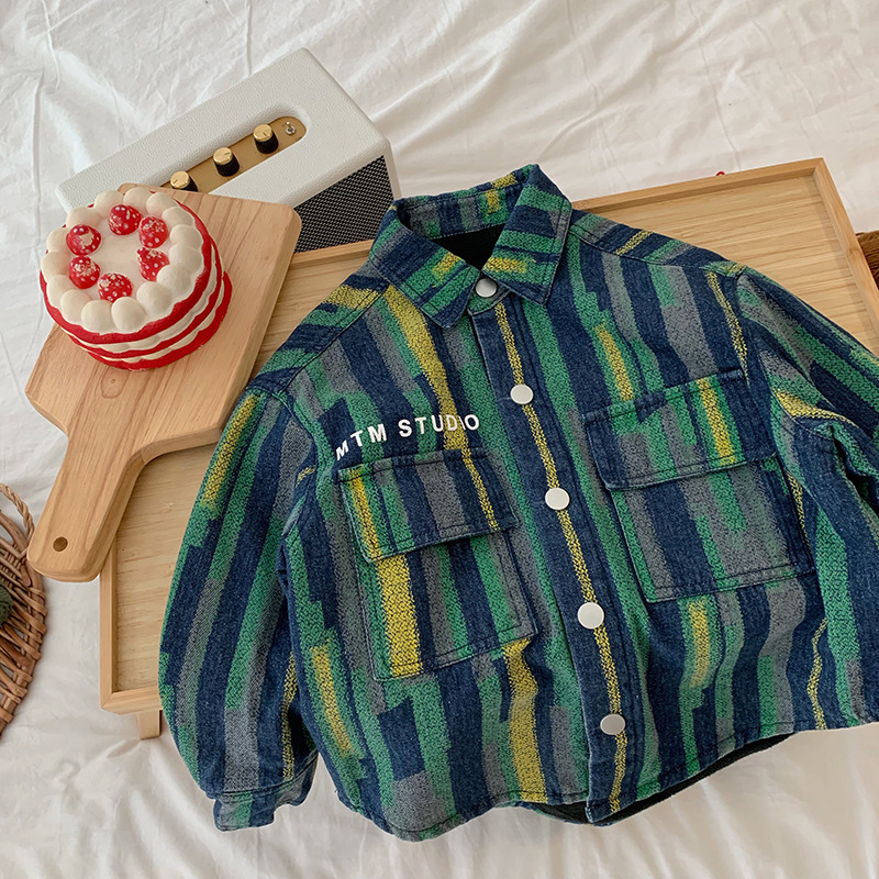 남자의 아동 의류 소년의 셔츠 코트 겨울 기모 어린이 데님 스트라이프 셔츠 긴 소매 탑
