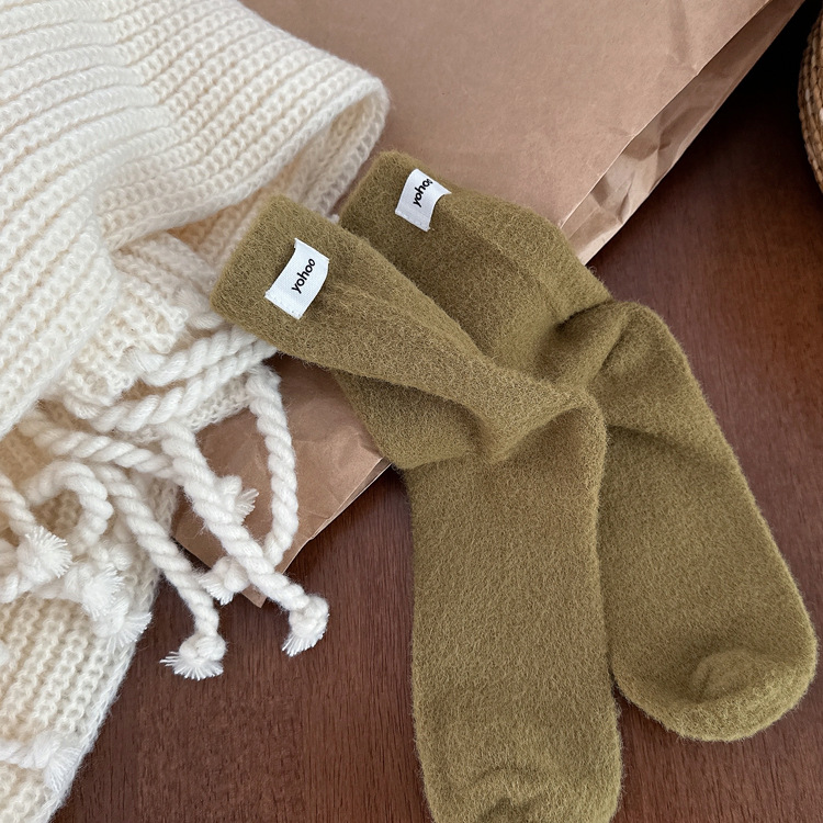 겨울 두꺼운 양말 한국 yohoo 뒤꿈치 천 라벨 따뜻한 튜브 양말 모조 밍크 벨벳 겨울 여성 양말 sakagiya