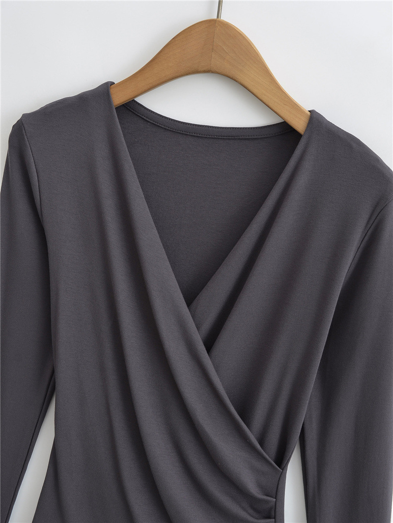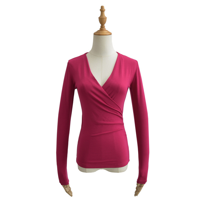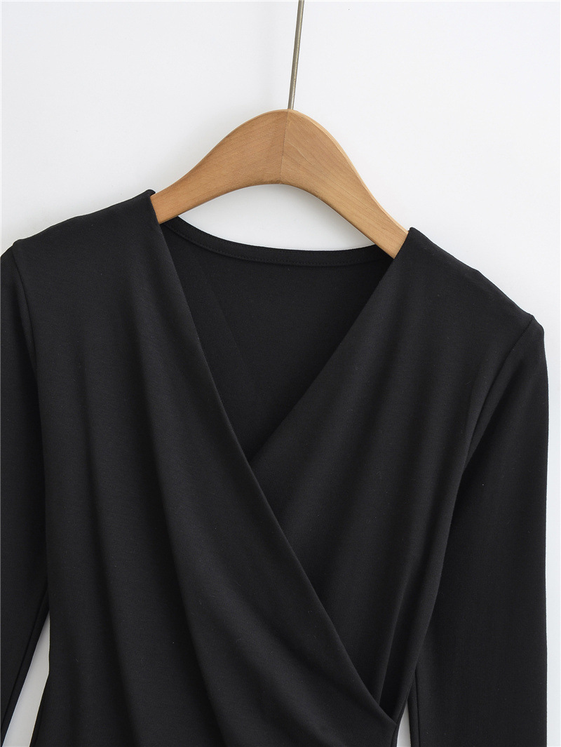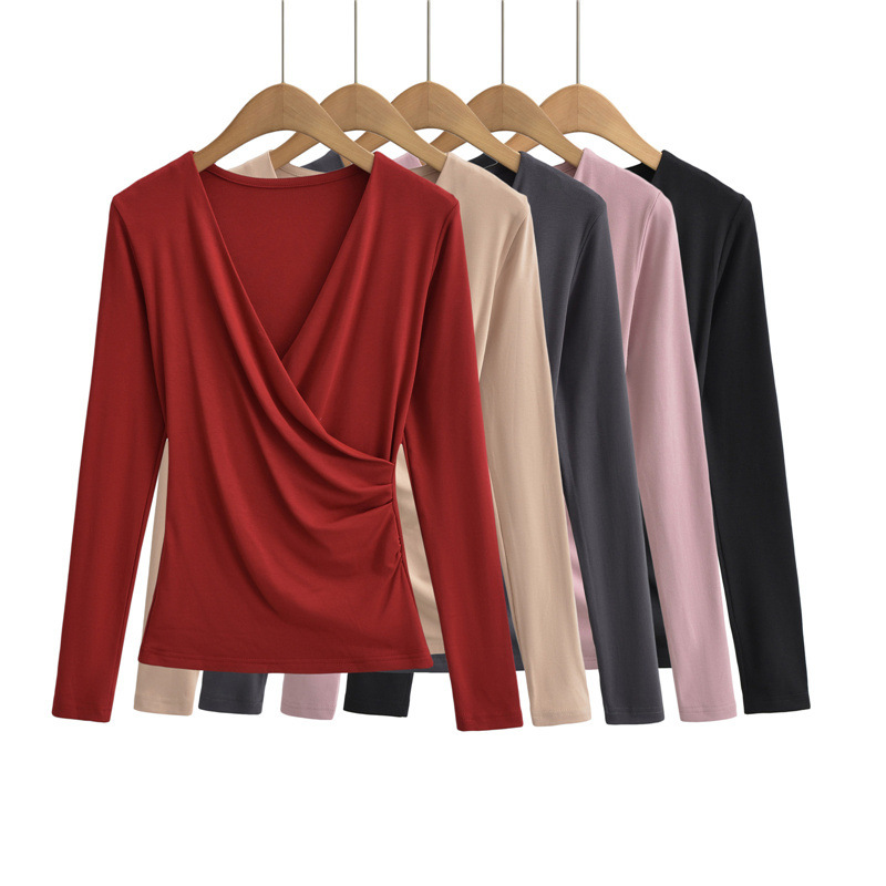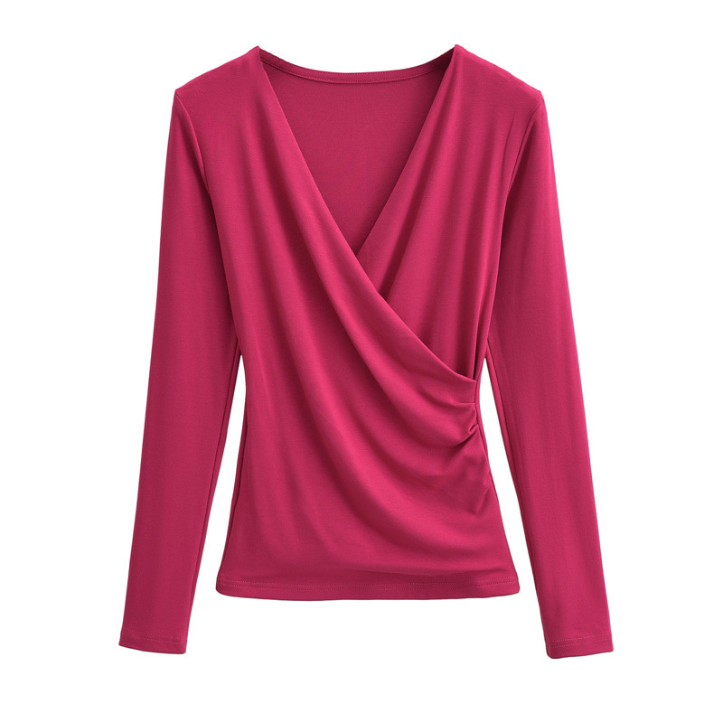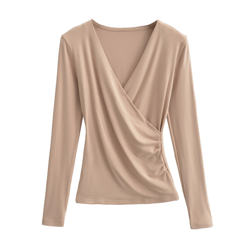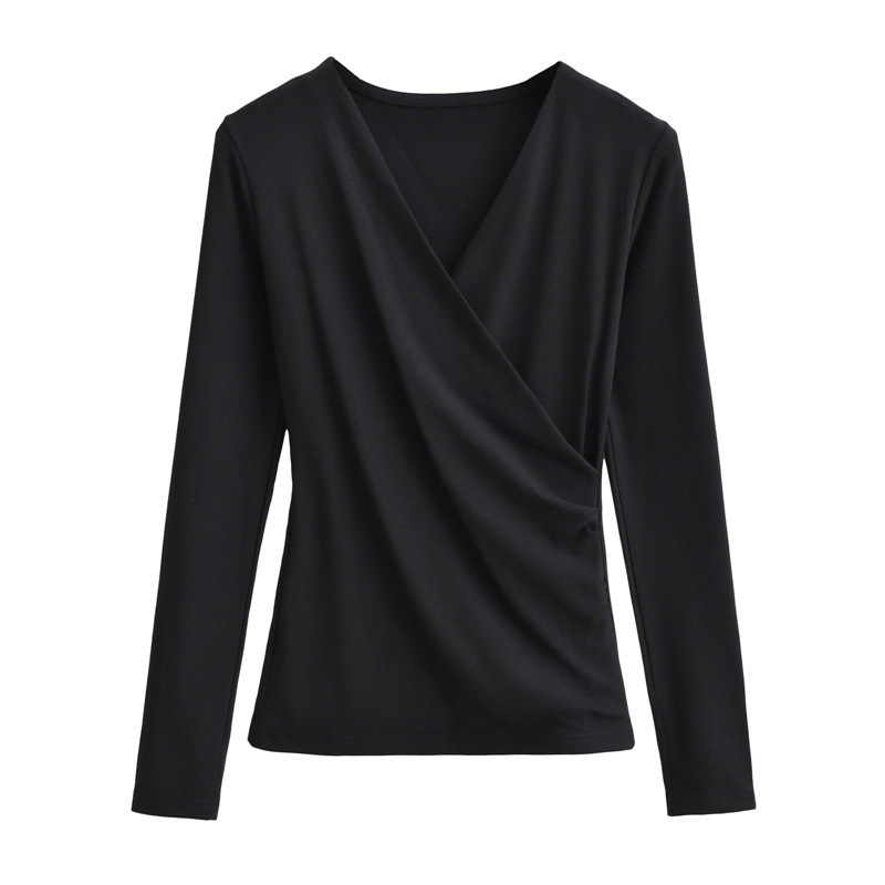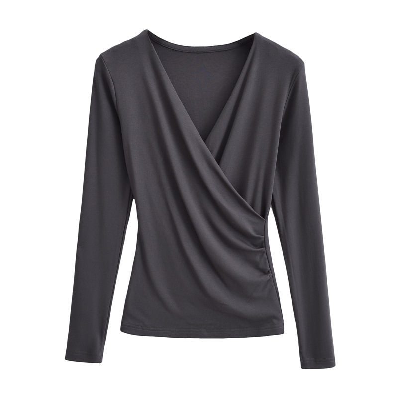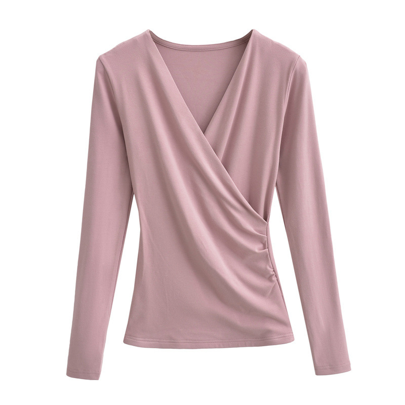 유럽과 미국 스타일 스파이스 걸스 섹시 크로스 딥 브이넥 긴팔 티셔츠 가을 새로운 슬림핏 솔리드 컬러 플리츠 하의 여성용 탑스토어 가기