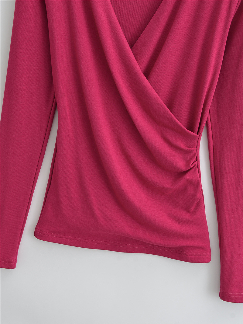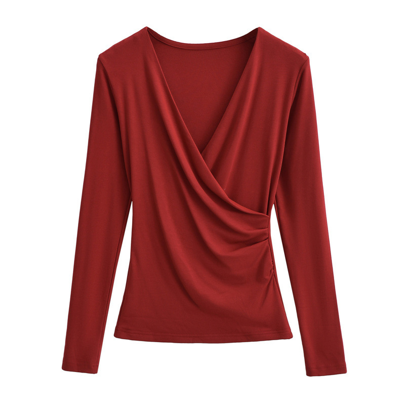 유럽과 미국 스타일 스파이스 걸스 섹시 크로스 딥 브이넥 긴팔 티셔츠 가을 새로운 슬림핏 솔리드 컬러 플리츠 하의 여성용 탑