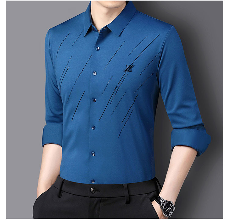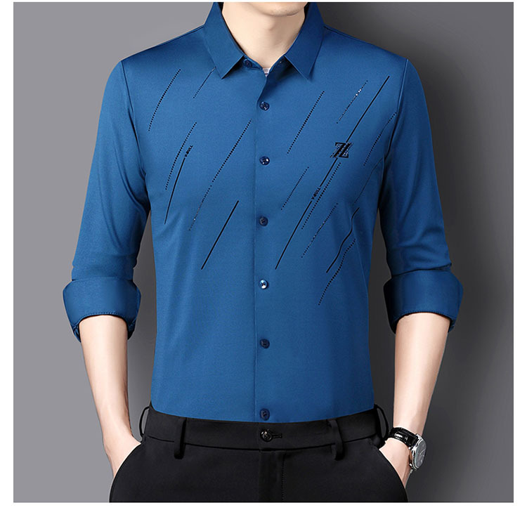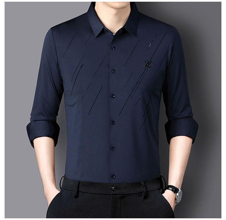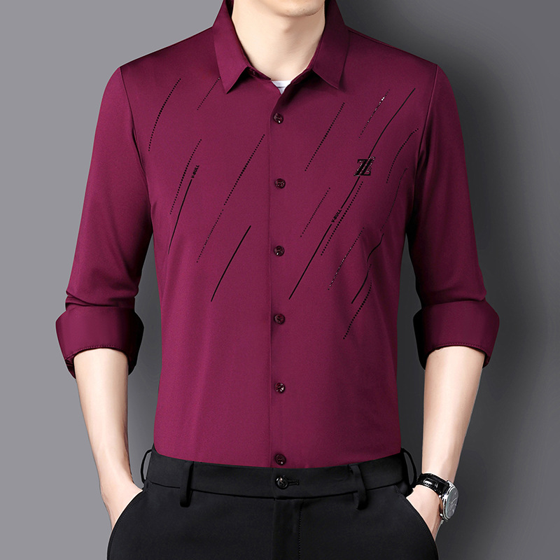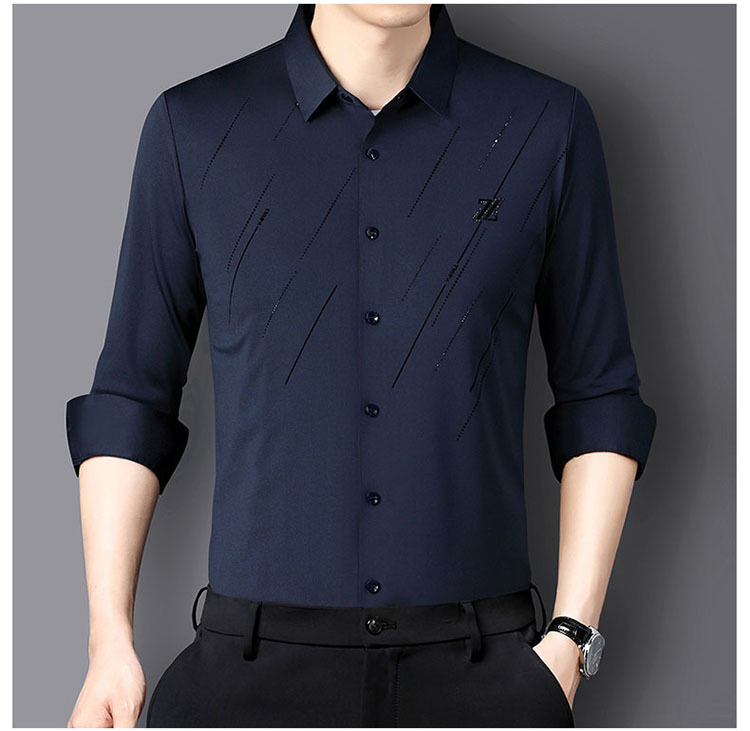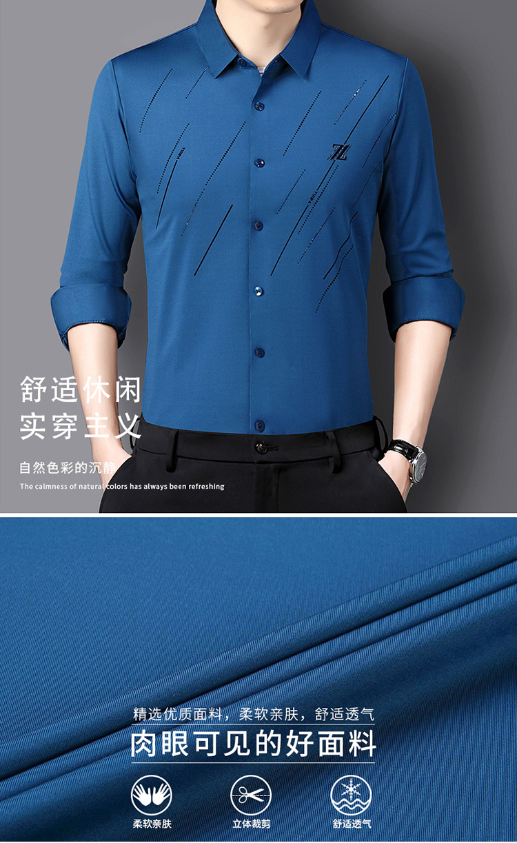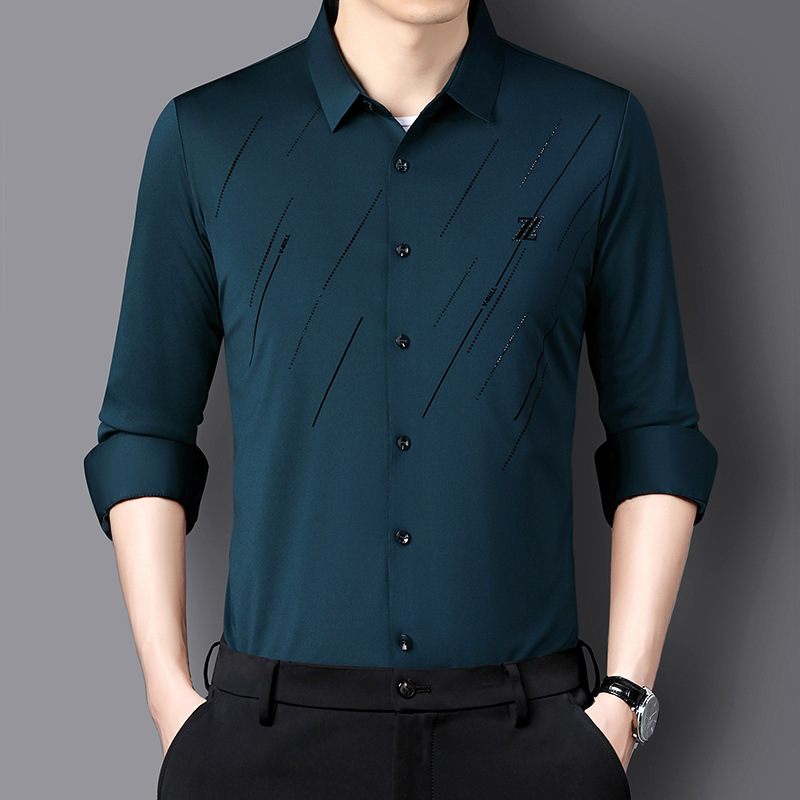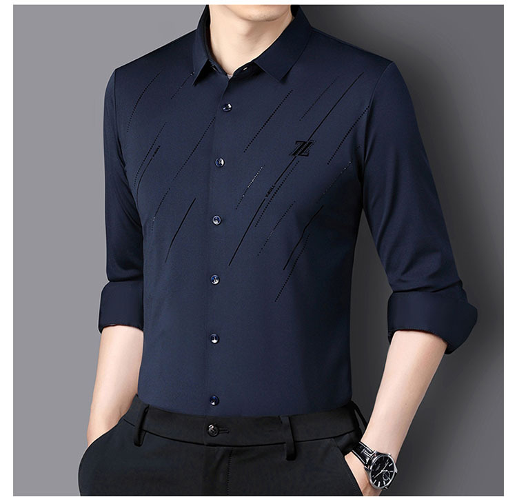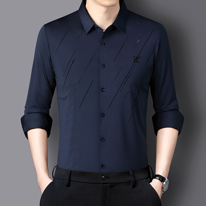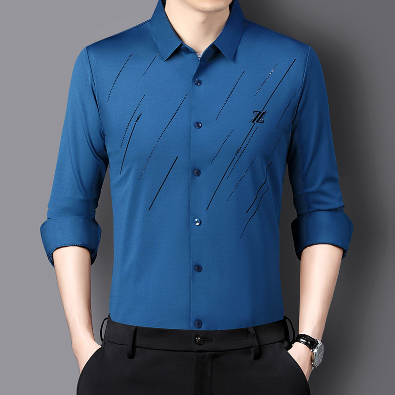 정품 남성 인쇄 핫 드릴링 긴 소매 셔츠 2023 가을 새로운 젊은 및 중년 남성의 원활한 비 다림질 셔츠