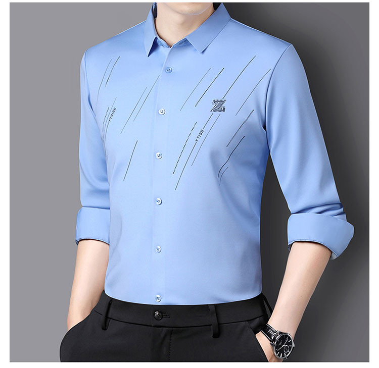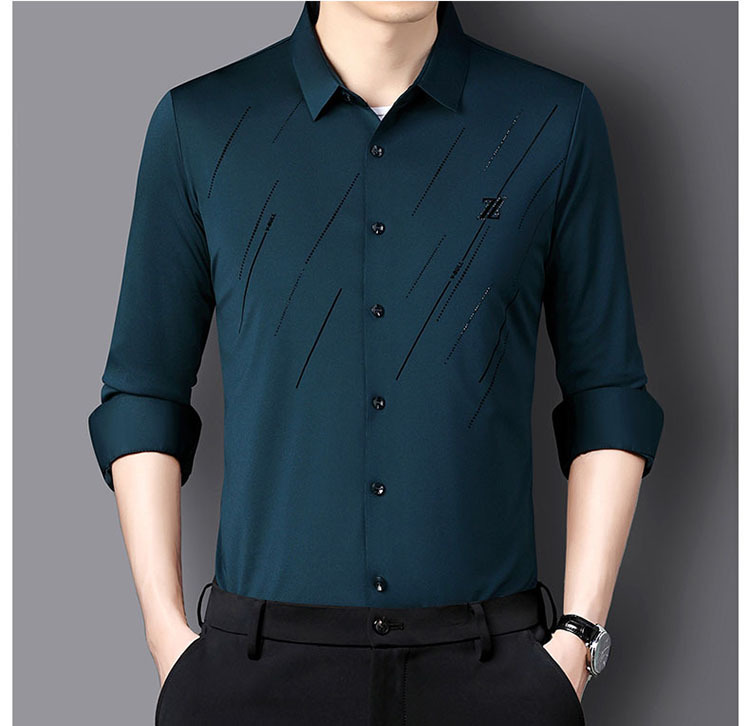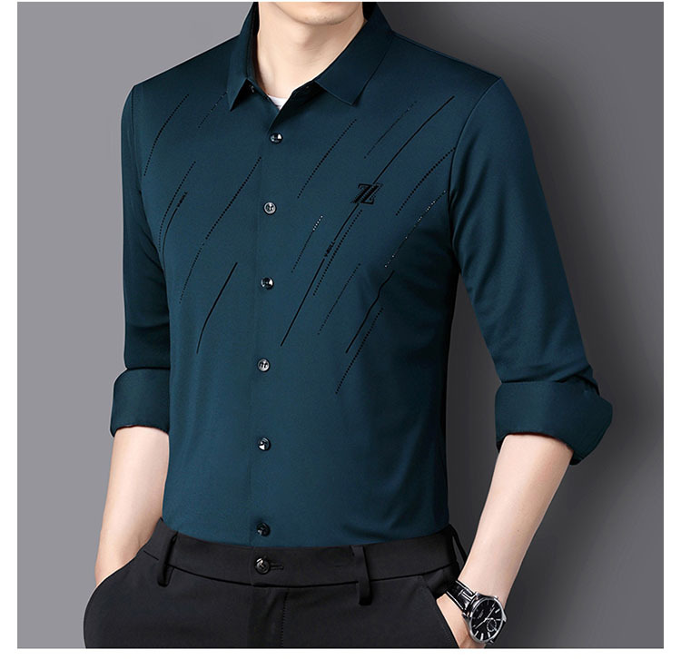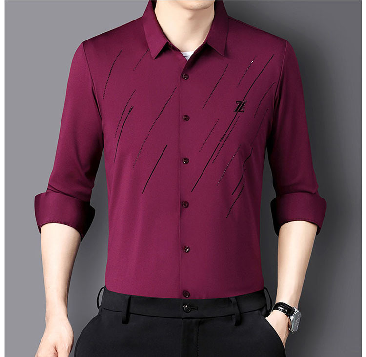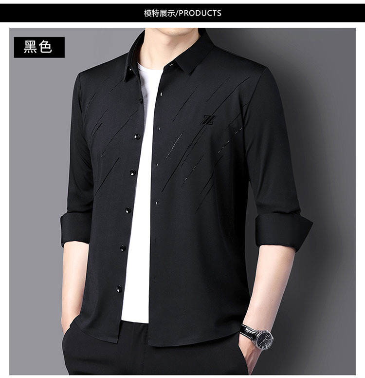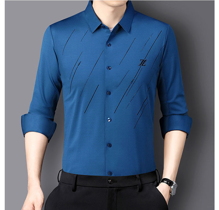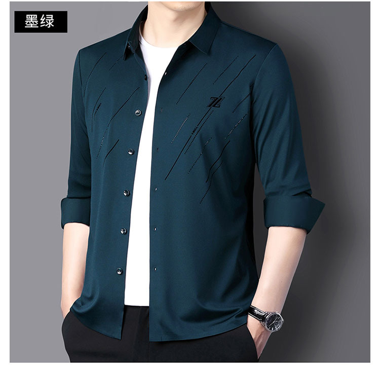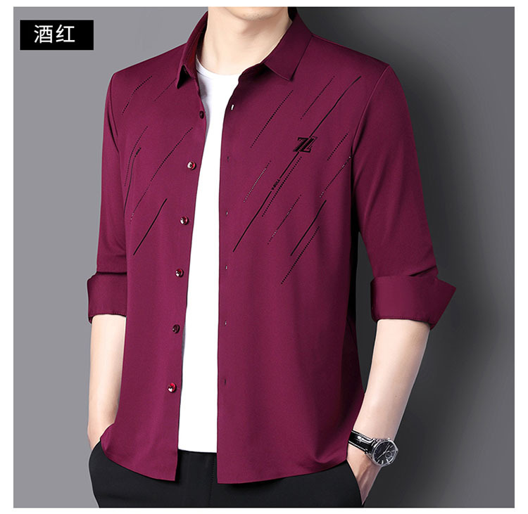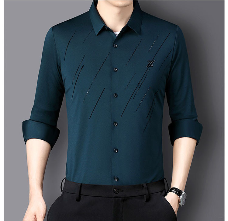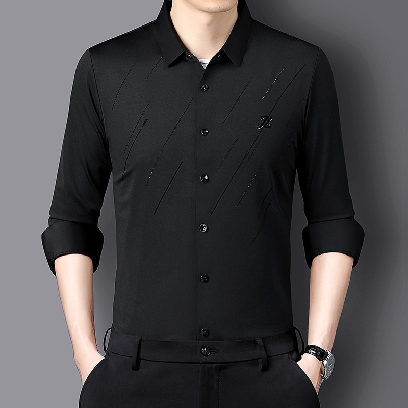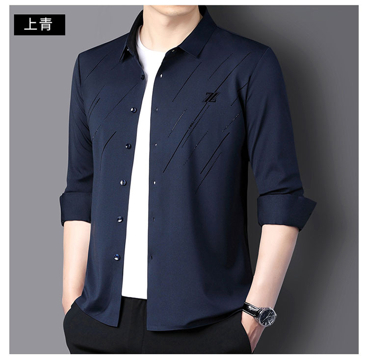정품 남성 인쇄 핫 드릴링 긴 소매 셔츠 2023 가을 새로운 젊은 및 중년 남성의 원활한 비 다림질 셔츠