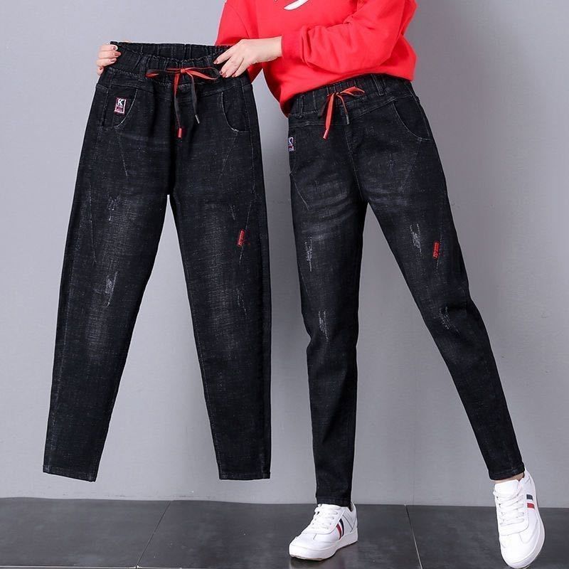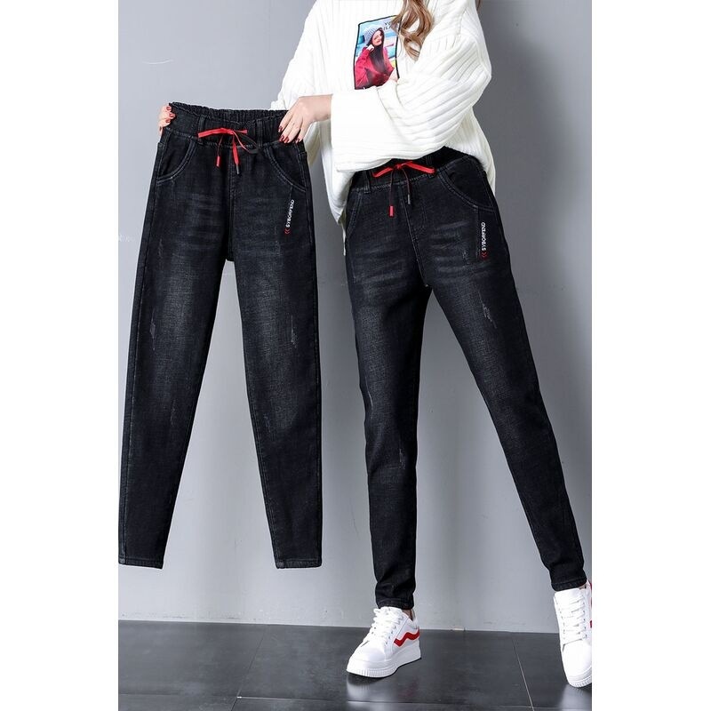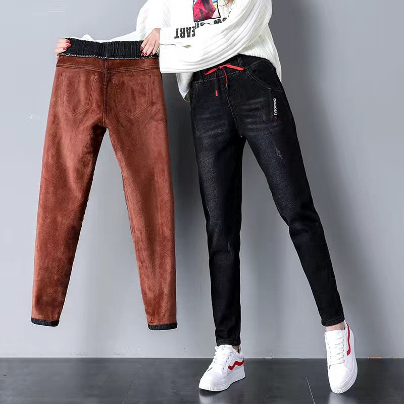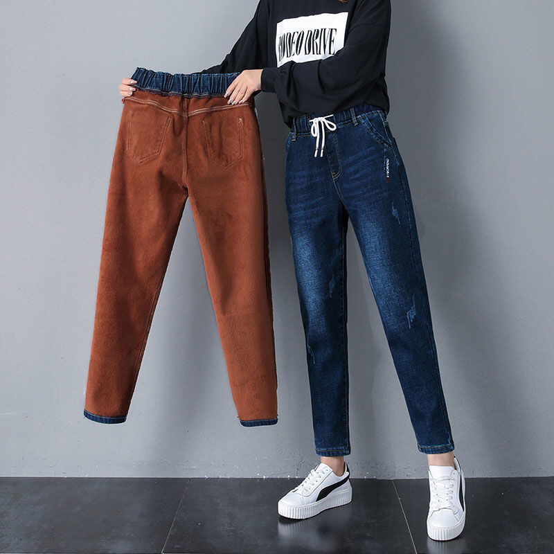 여성용 신축성 있는 허리 벨벳 청바지, 겨울 아우터, 두꺼운 루즈 스트레이트 레그, 플러스 사이즈, 뚱뚱한 mm 하렘 당근 바지스토어 가기