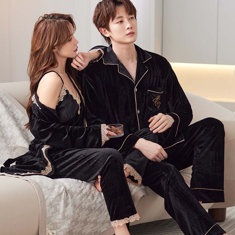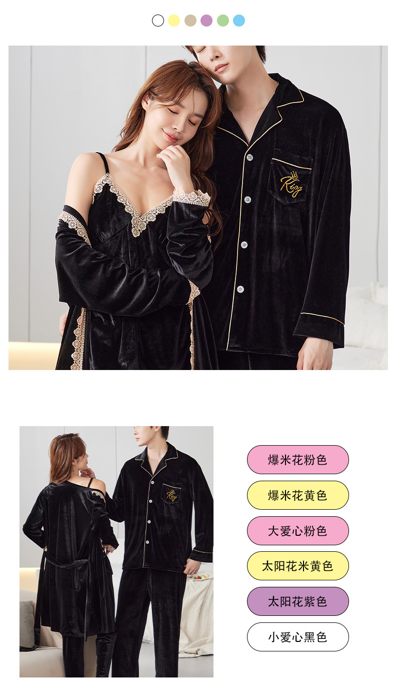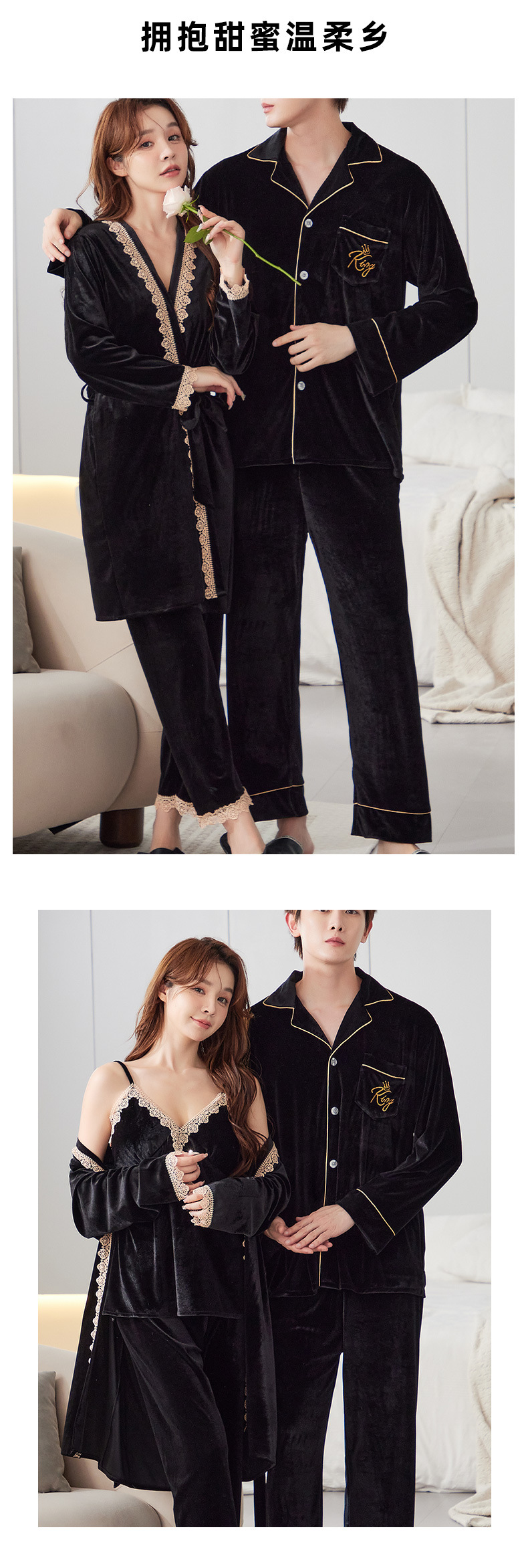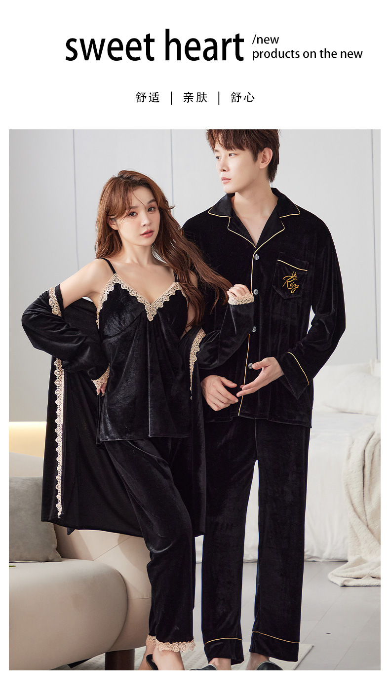 골든 벨벳 커플 잠옷 여자의 봄과 가을 카디건 남자의 긴팔 느슨한 플러스 사이즈 홈 의류 남자와 여자의 쓰리 피스 세트