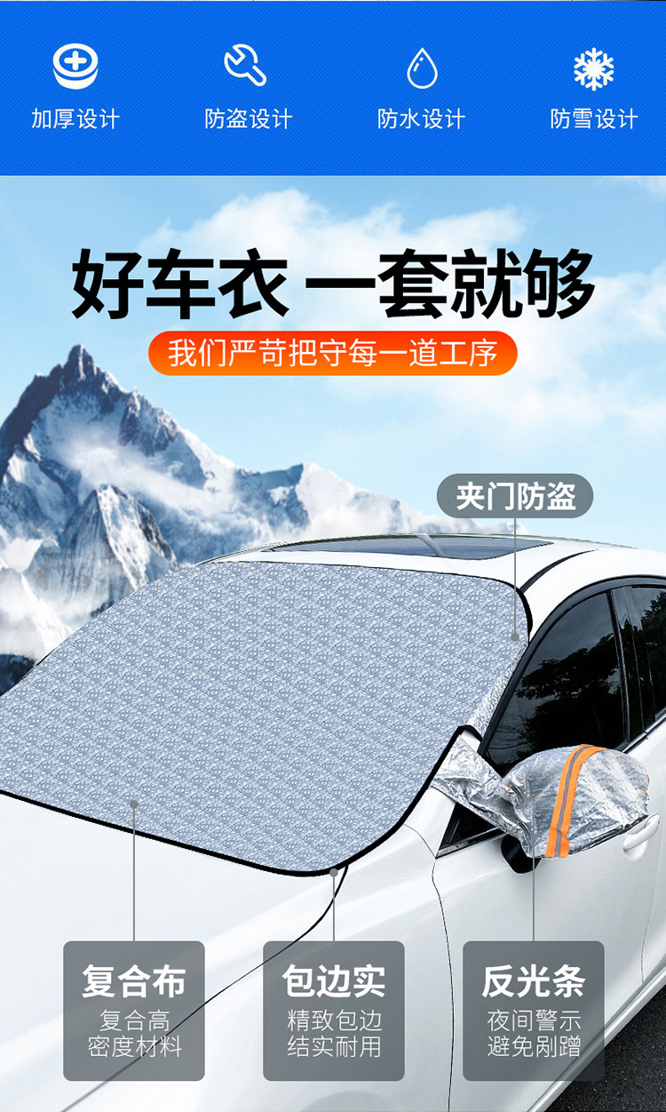 【产品特点】:1、铝膜材质,不伤车漆,防晒、隔热、防雨雪、防风尘、防划痕、防紫 外线、抗拉力强。