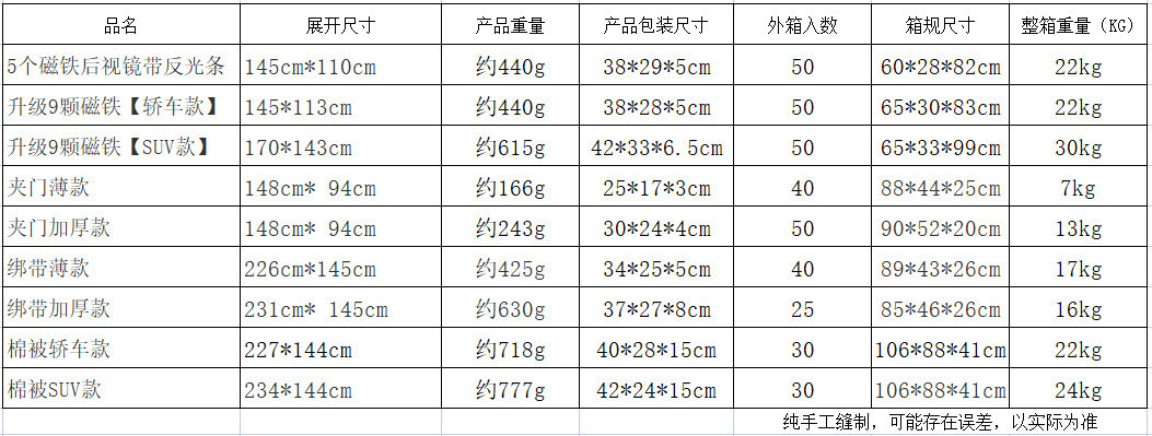 【产品尺寸】:前档风玻璃薄款【夹门款】 长宽1.4*0.95m 重量约165g