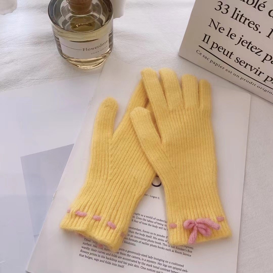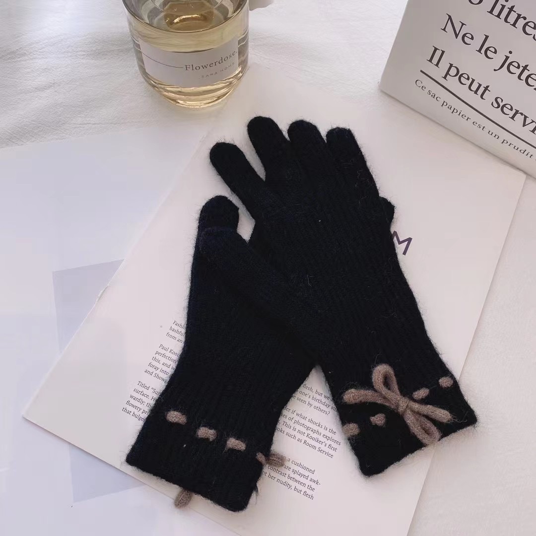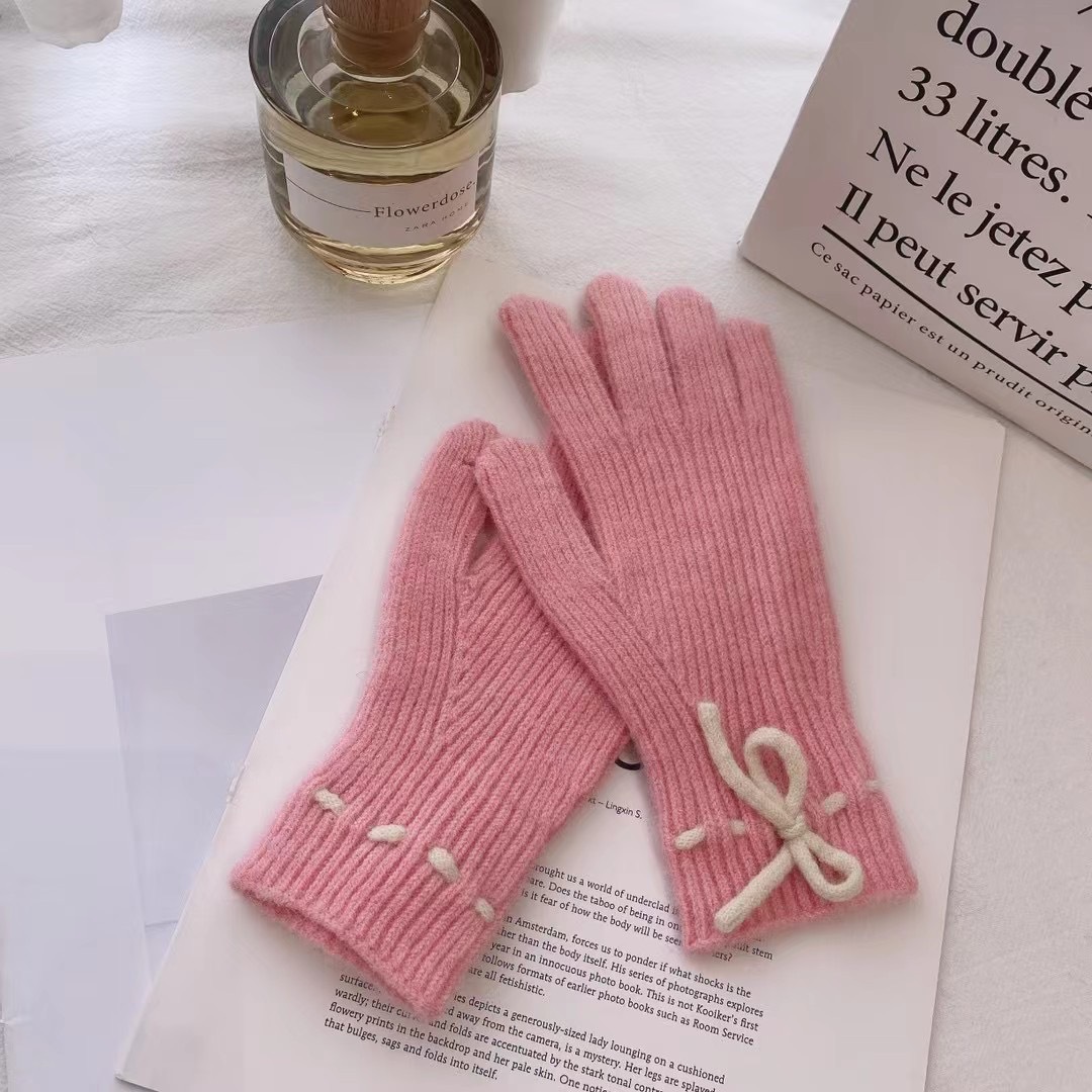 가을과 겨울 새로운 활 니트 장갑 귀여운 새 손가락 터치 스크린 여성용 겨울 따뜻한 방한 장갑