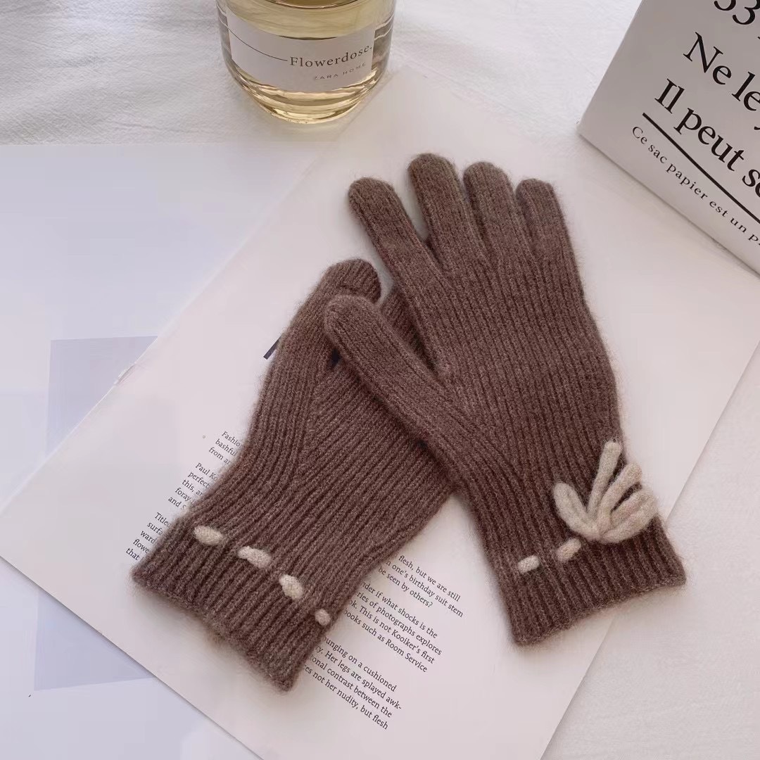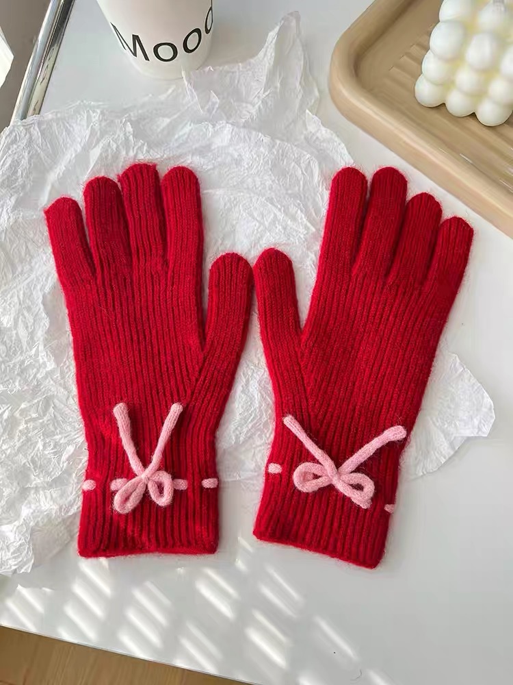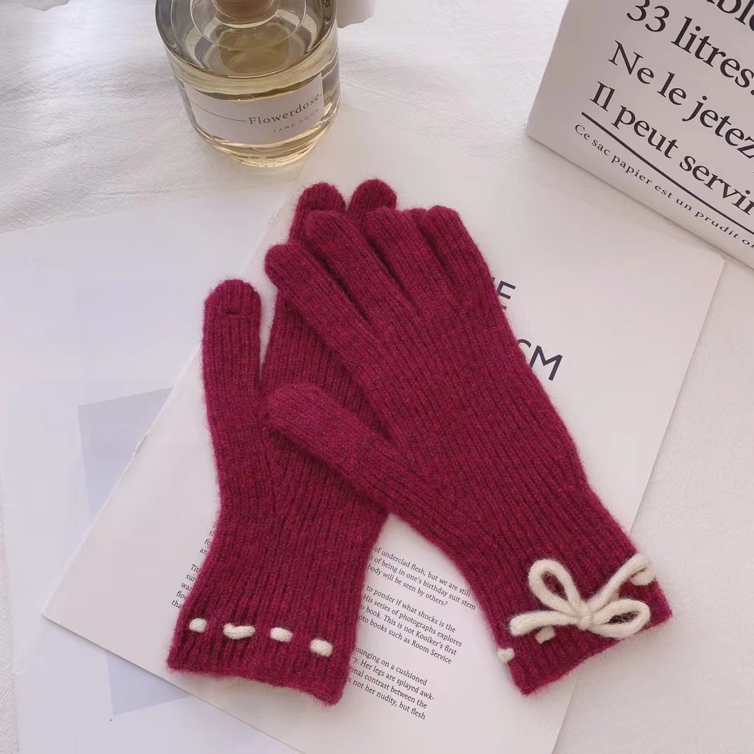 가을과 겨울 새로운 활 니트 장갑 귀여운 새 손가락 터치 스크린 여성용 겨울 따뜻한 방한 장갑