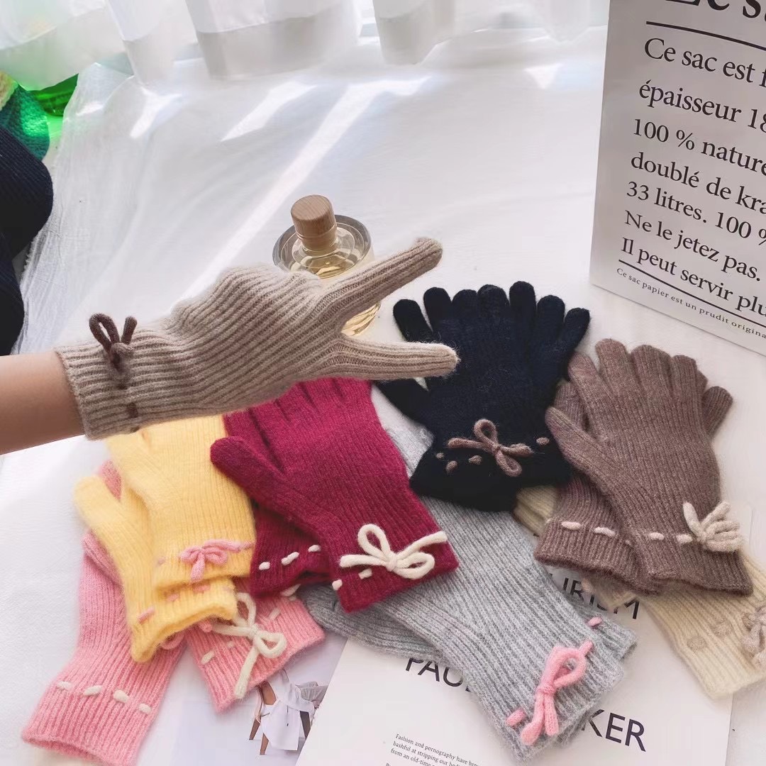 가을과 겨울 새로운 활 니트 장갑 귀여운 새 손가락 터치 스크린 여성용 겨울 따뜻한 방한 장갑스토어 가기