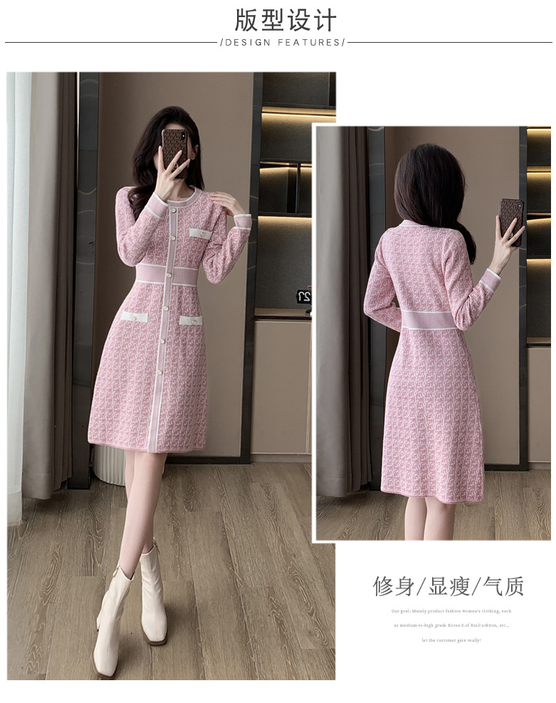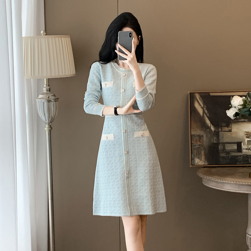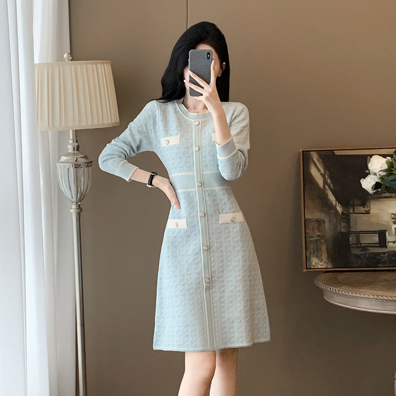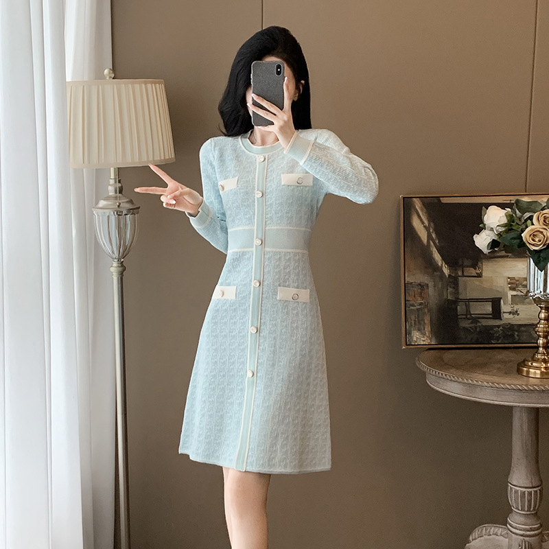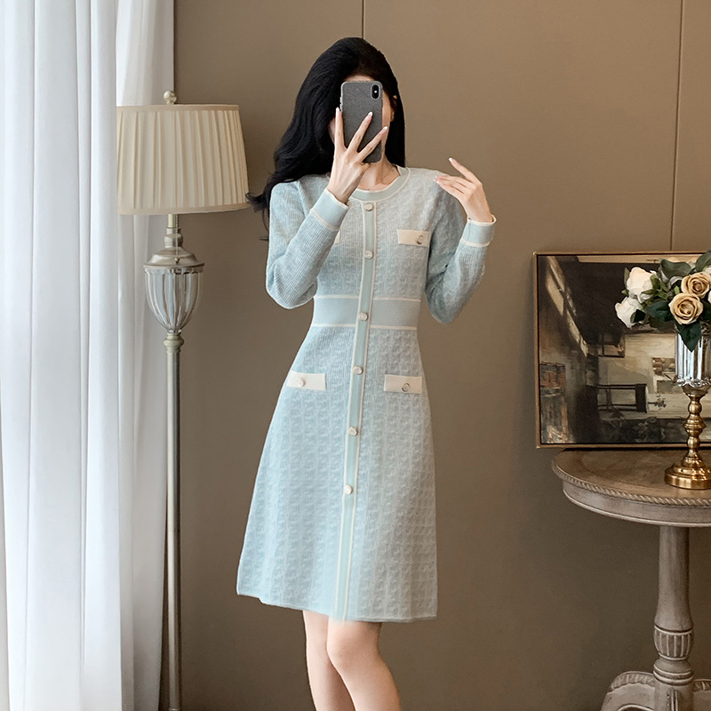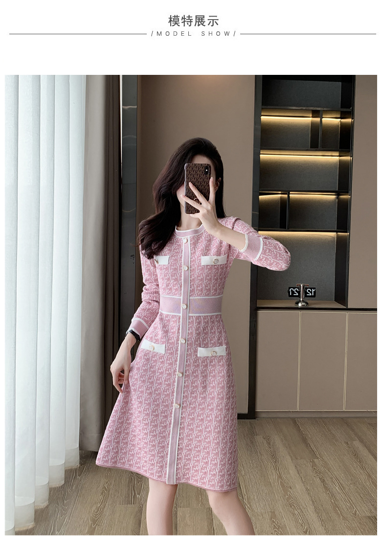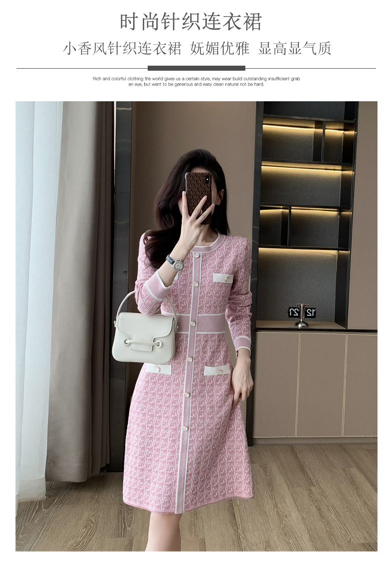 실제 샷 스팟 13 라인 사교계 여성 작은 향기로운 스타일 높은 허리 A 라인 긴 원피스 기질 여성의 대형 스윙 니트 원피스스토어 가기
