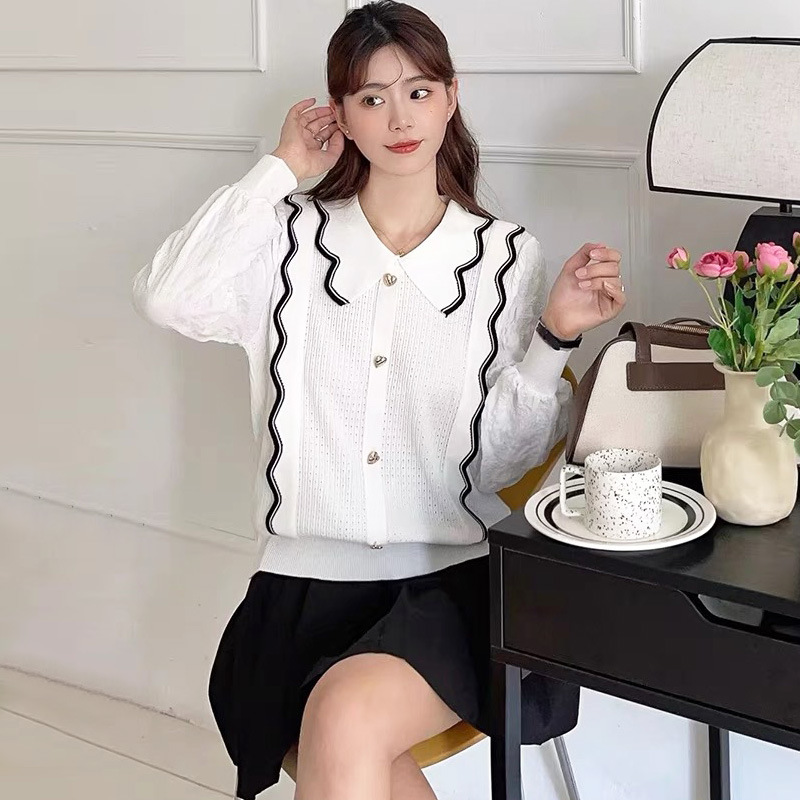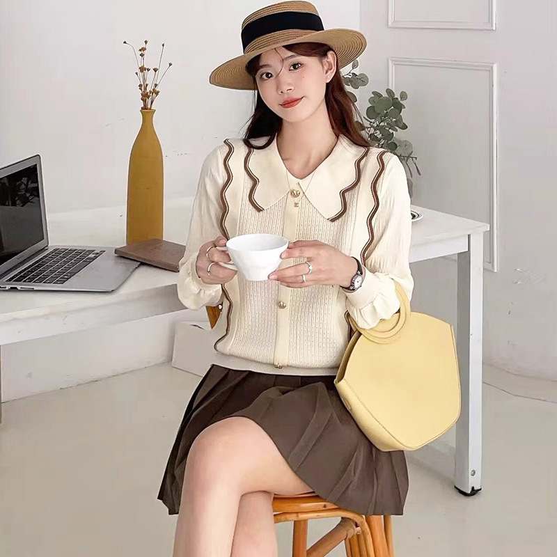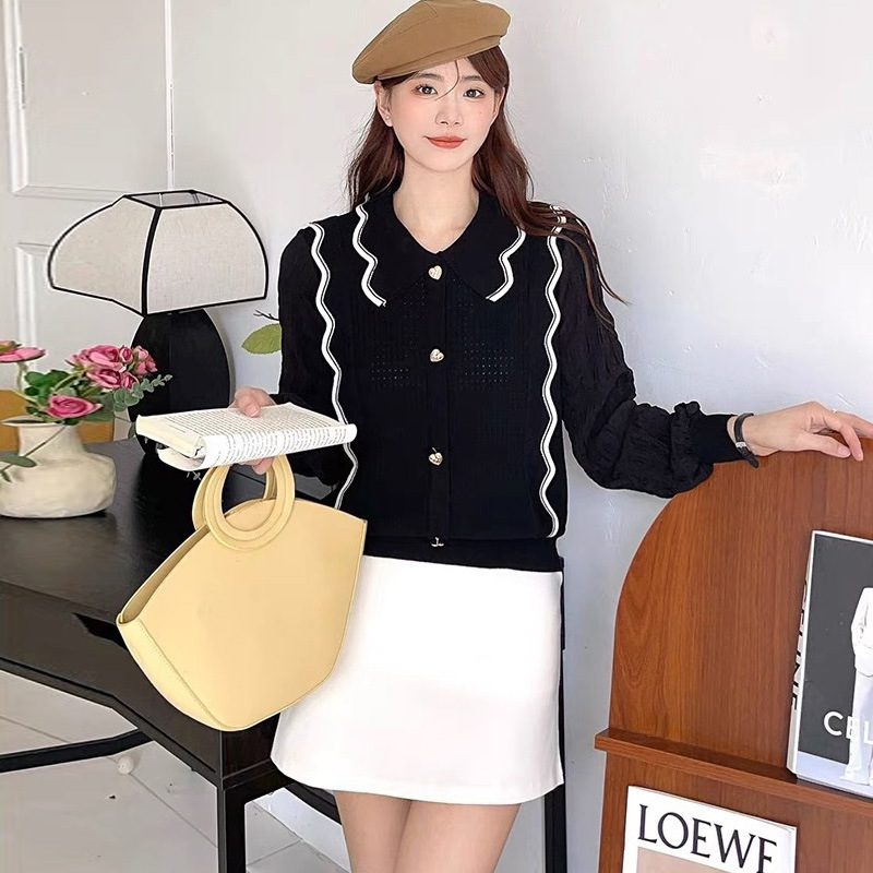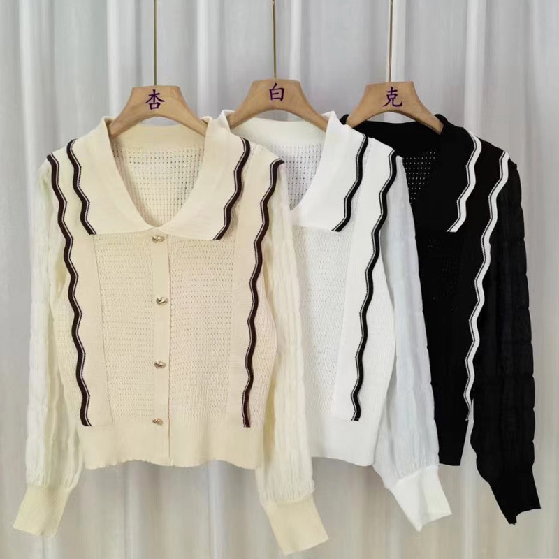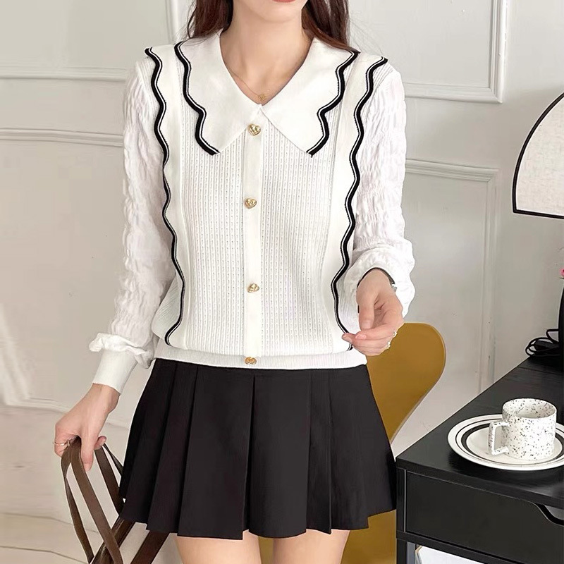 가을 여성의 V-넥 대비 라펠 니트 스웨터 여성용 Dalang 니트 스웨터 스티칭 쉬폰 긴팔 베이스 탑