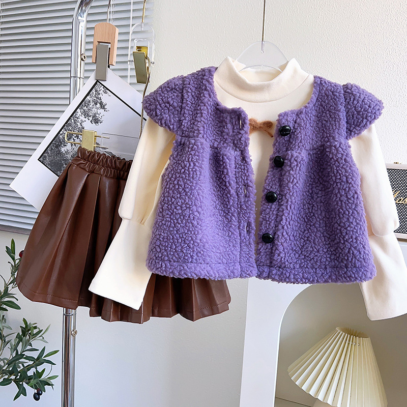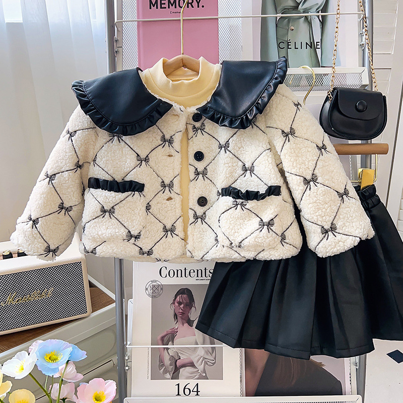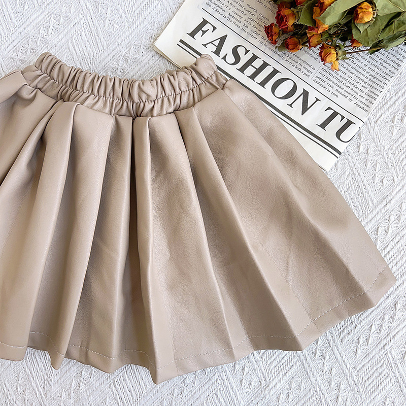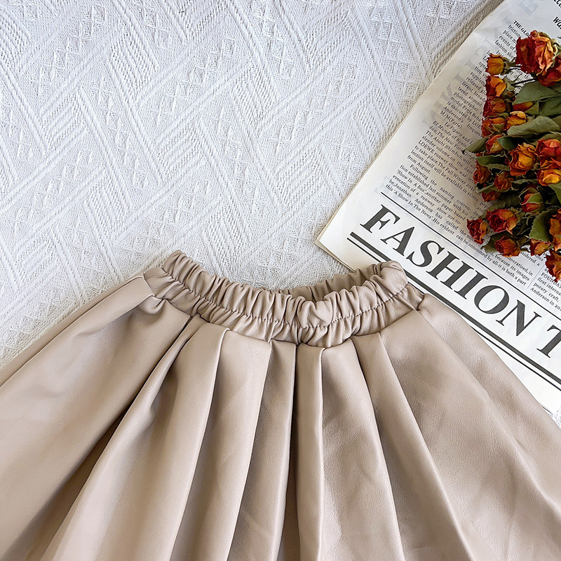 아동 스커트 2024 새로운 가을, 겨울 스타일 어린 소녀와 아기를위한 PU 가죽 스커트 솔리드 컬러 플러스 벨벳 플리츠 스커트 다목적 한국어 버전