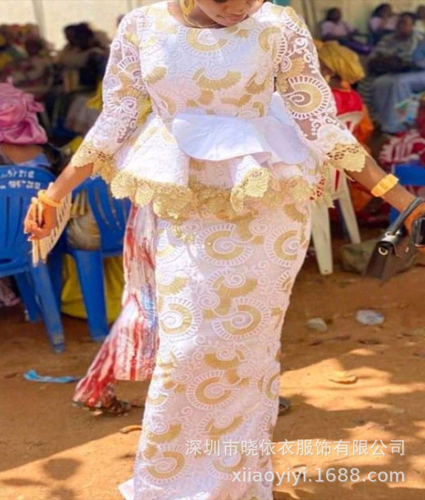 새로운 유럽과 미국의 우아한 통근자를 위한 크로스보더 스페셜 우아한 자수 레이스 대조 컬러 허리 타이트 탑 롱 원피스 여성용 세트