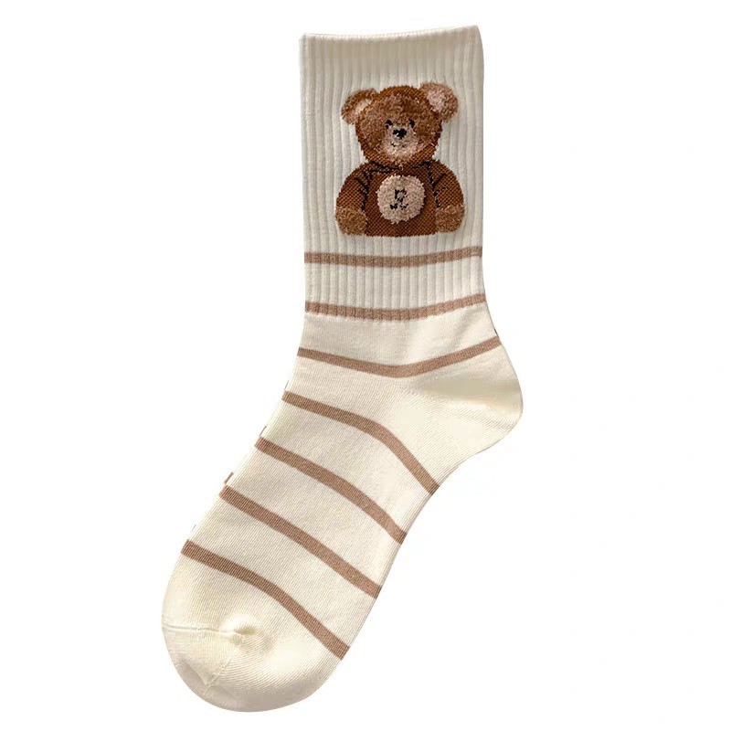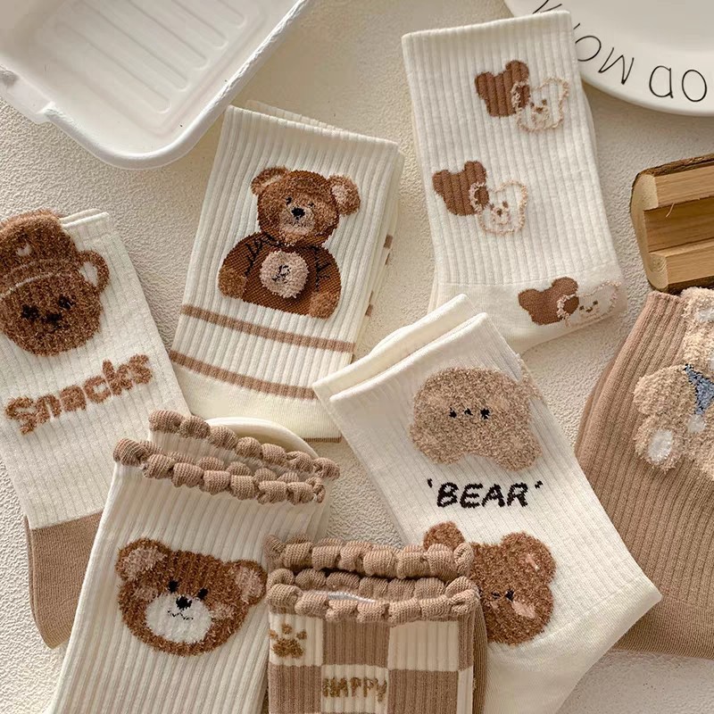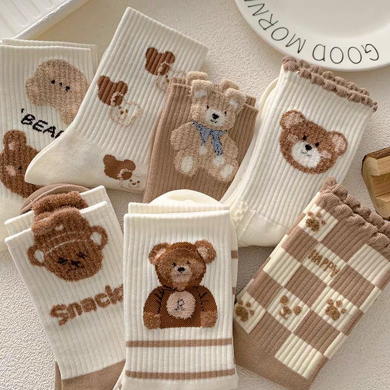 다크 브라운 곰 양말 여자의 가을과 겨울 중간 길이 스타킹 트렌디 한 입체 봉제 귀여운 빈티지 두꺼운 면 따뜻한 스타킹