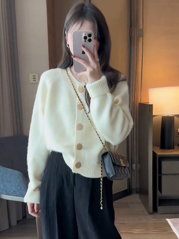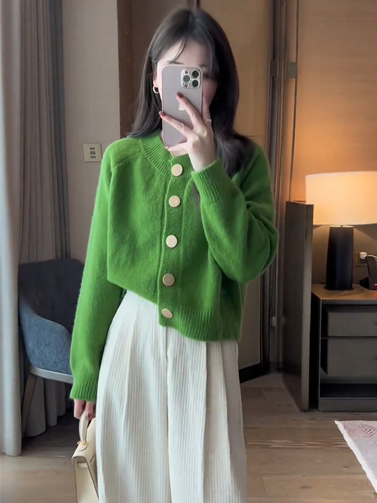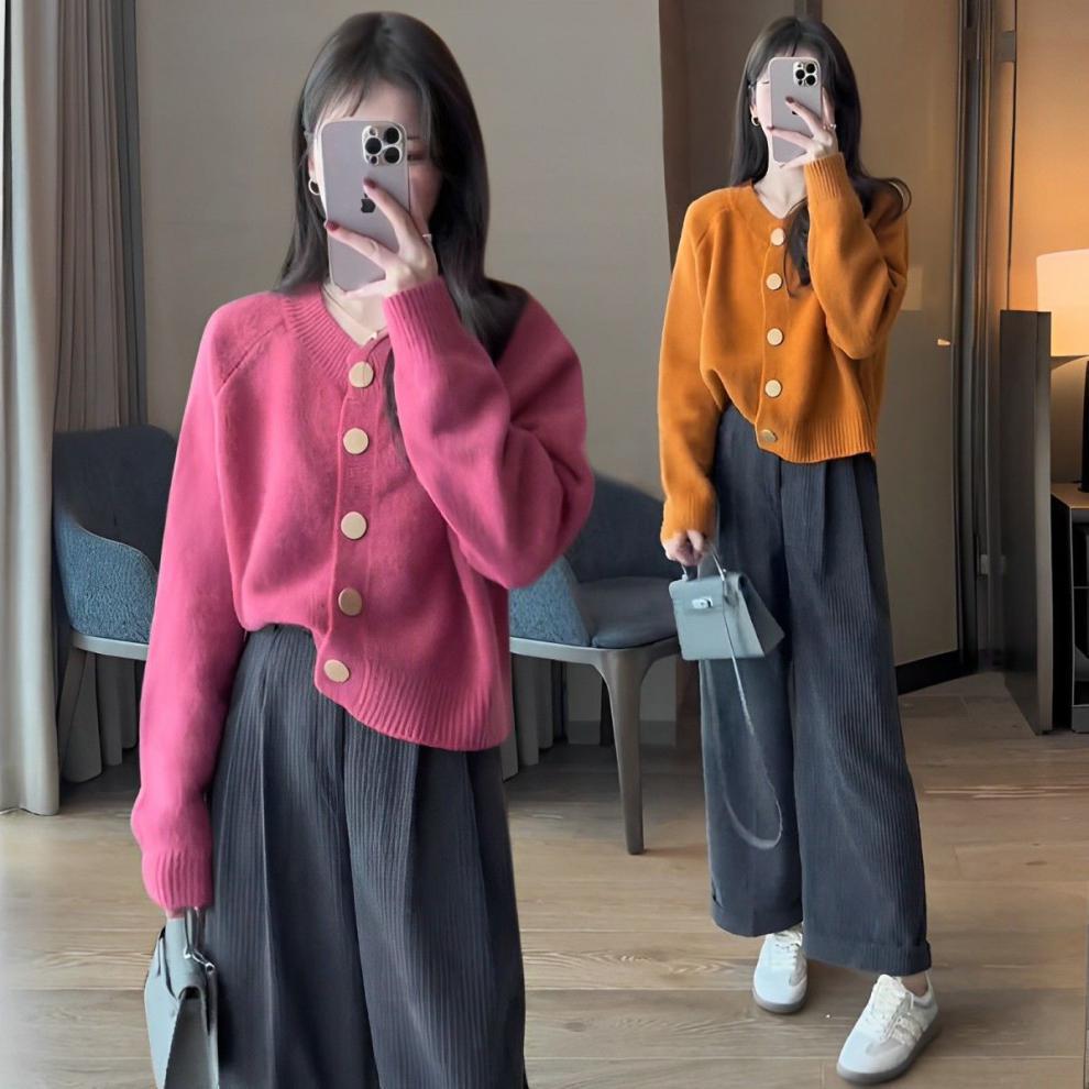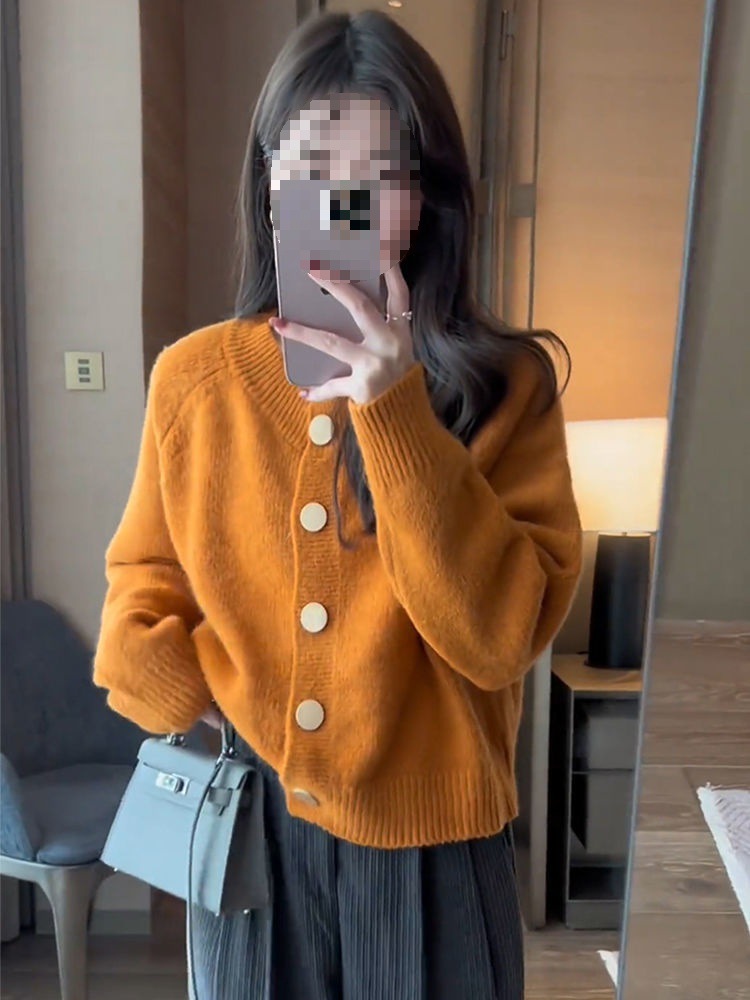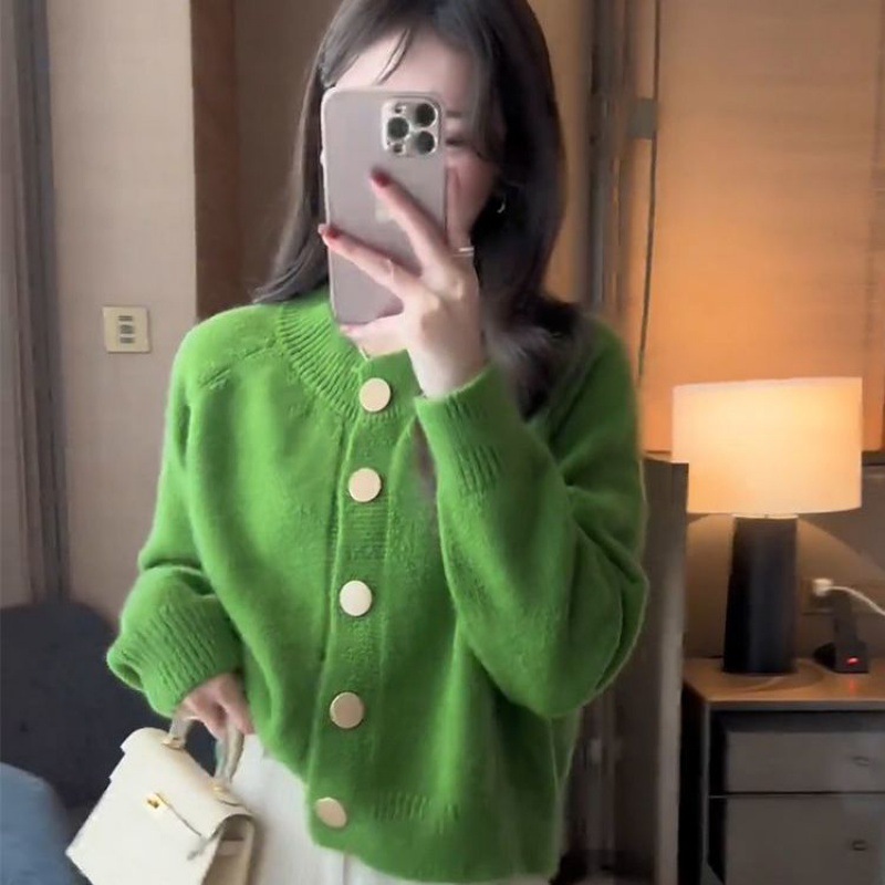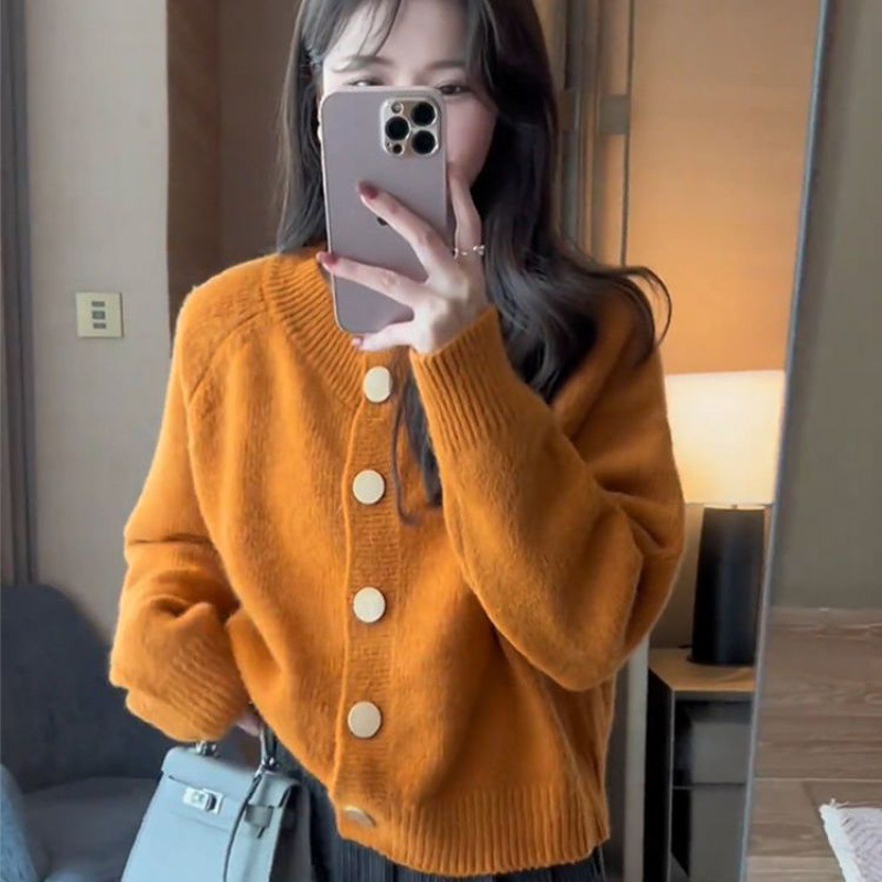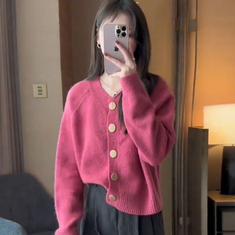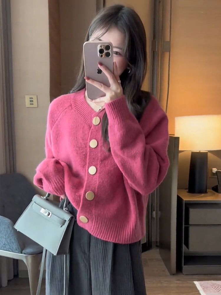 한국 스타일 심플 스타일 핑크 밀크 푸푸 니트 카디건 여성의 가을과 겨울 새로운 디자인 감각 틈새 싱글 브레스트 스웨터